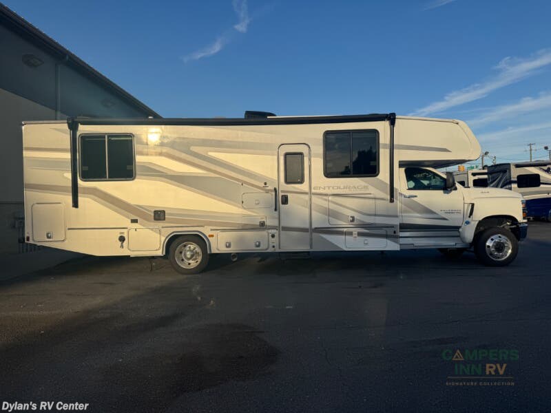 The Entourage is Coachmen's first super C diesel motorhome and it is packed with upscale appointments and solid construction so you can enjoy the RV lifestyle for years to come. This coach features a 4x4 diesel chassis (either a Chevy Silverado 5500 with a V8 6.6L diesel engine, or International CV chassis, depending on the model you choose), plus 50 amp service and a 2,000 watt inverter for all your power needs. The mandatory Icon Package includes a porcelain macerator toilet, auto generator start with dual batteries, 50 amp service, a tankless water heater, and more!