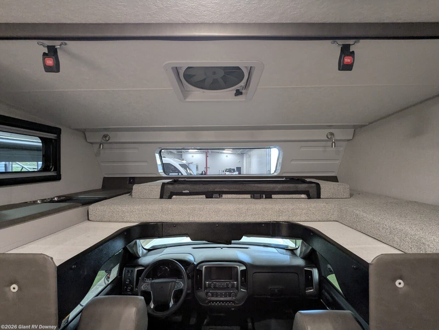- Rear Lounge Floorplan offering a spacious seating area with a large sofa, opposing windows, and a comfortable social space that converts for additional sleeping.
