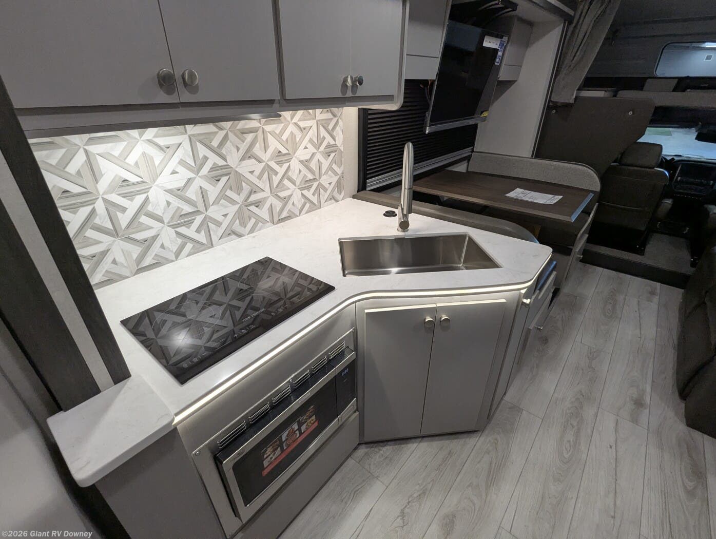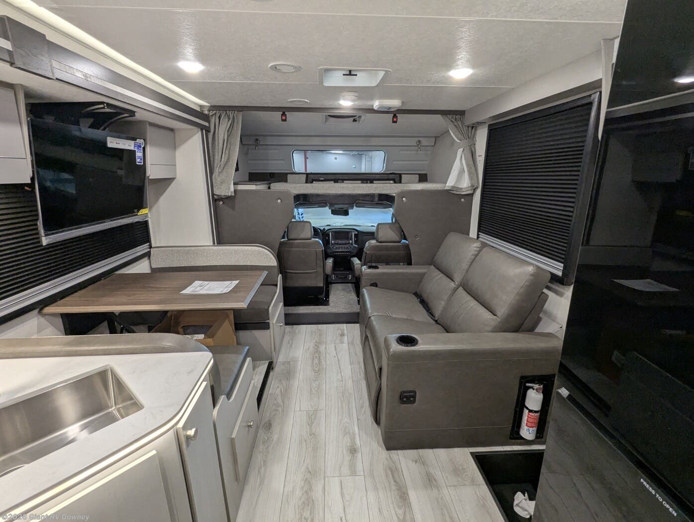 - Expansive Living & Kitchen Area with a booth dinette, entertainment center, solid-surface counters, large refrigerator, and premium amenities that make extended travel feel like home.