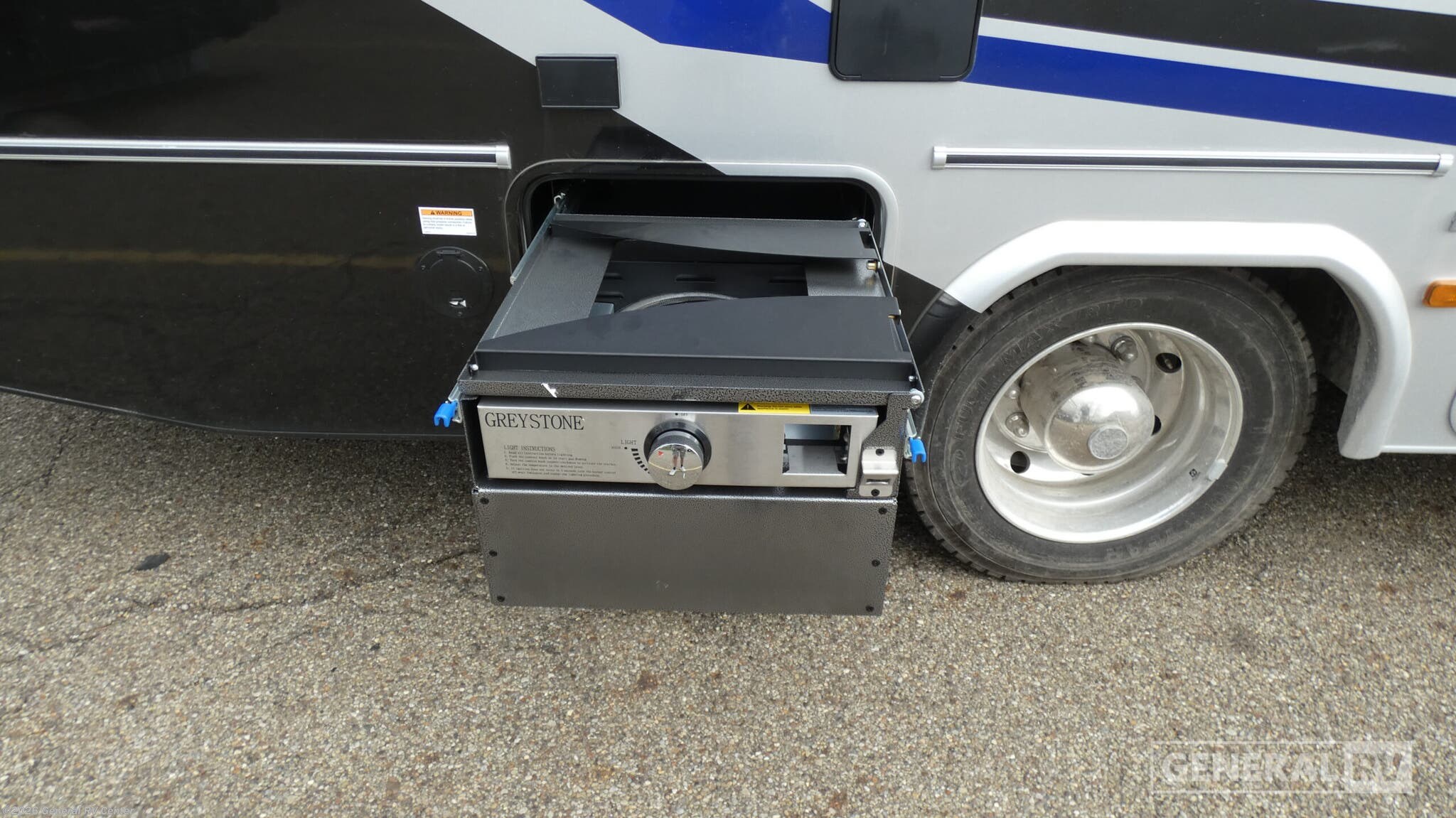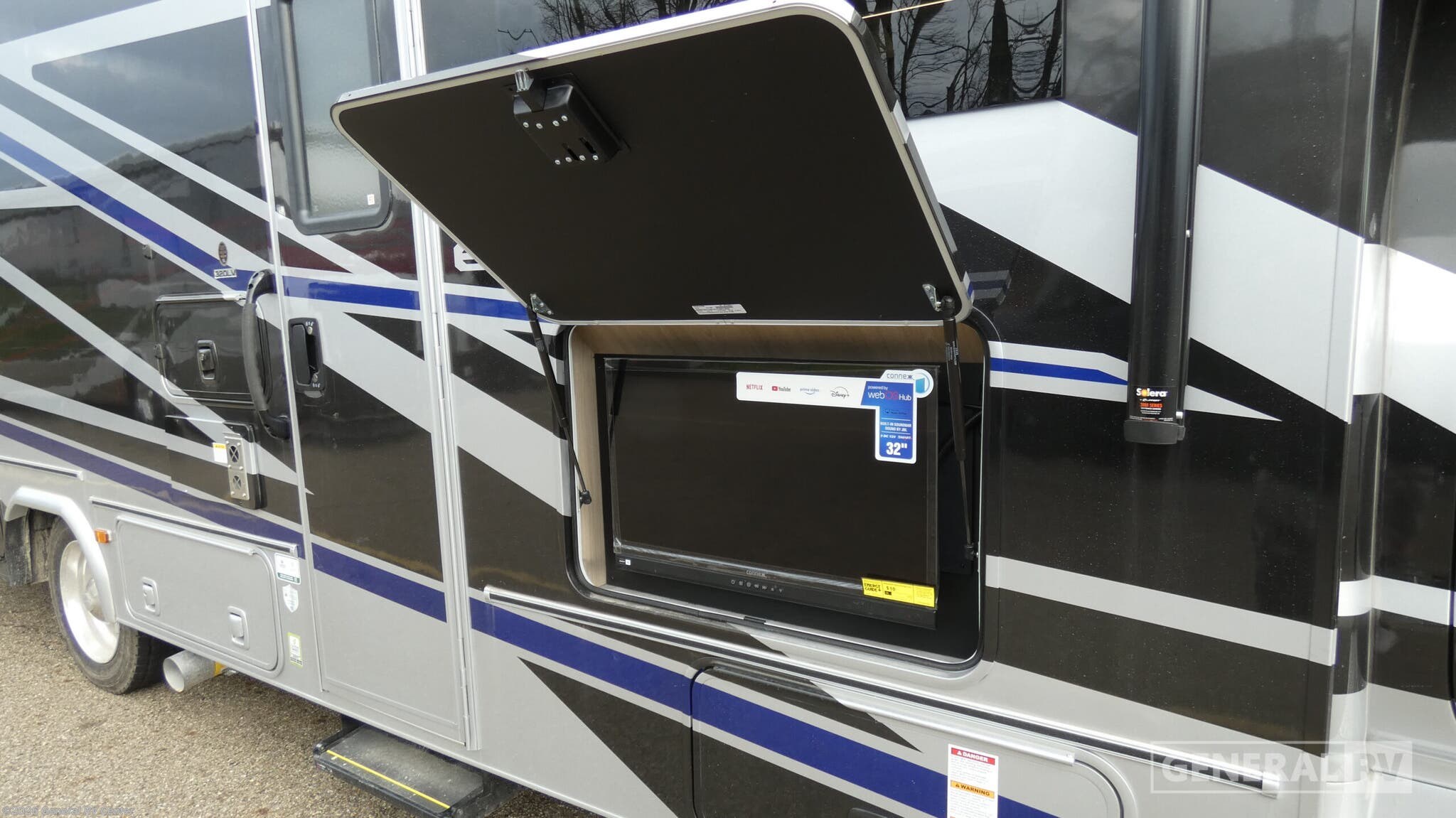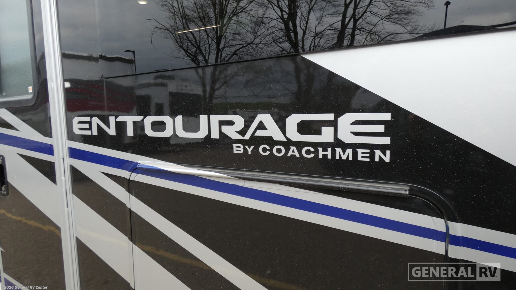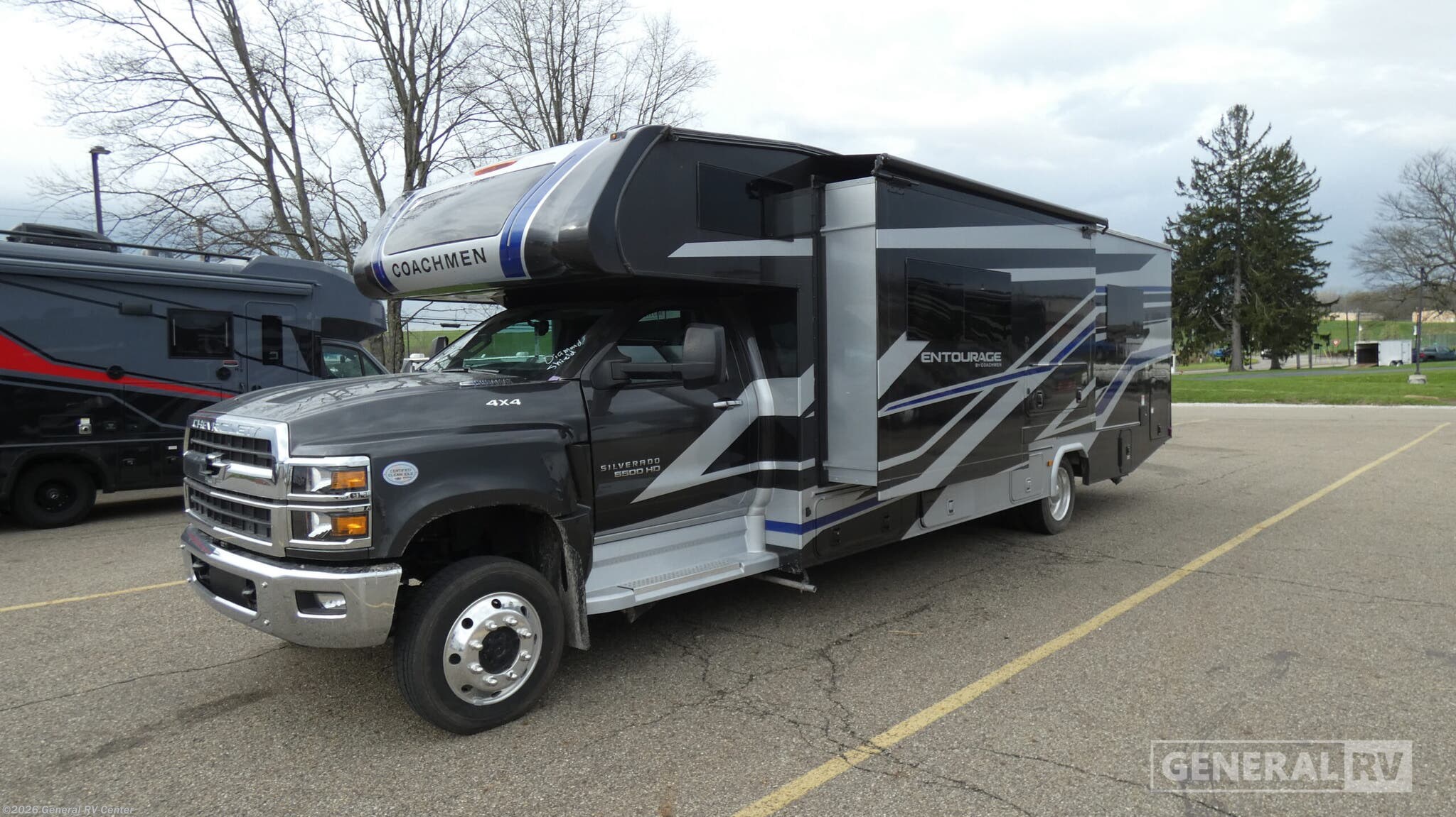 **Coachmen Entourage Super C diesel motorhome 320LV highlights:** * Rear Bedroom * Kitchen Pantry * Cab-Over Bunk * Outdoor Entertainment Pack your bags and head across the state in this durable coach. You can sleep five to six each night between the queen bed in the rear bedroom, the cab-over bunk, plus the booth dinette that will convert to sleeping space. The power recliners are sure to bring comfort after a day of traveling, or you can head outdoors to enjoy the outside TV and exterior grill table. When you get hungry, you can make lunch on the induction cooktop or in the convection microwave, and there is a 10 cu. ft. 12V double door refrigerator to keep your cold items fresh. A full bath is ready for you when you want to freshen up, and you'll find a wardrobe right across from the bath to keep clothes and linens ready to use. And the washer and dryer combo prep gives you the option to add these appliances if you choose! The Entourage is Coachmen's first super C diesel motorhome and it is packed with upscale appointments and solid construction so you can enjoy the RV lifestyle for years to come. This coach features a 4x4 diesel chassis (either a Chevy Silverado 5500 with a V8 6.6L diesel engine, or International CV chassis, depending on the model you choose), plus 50 amp service and a 2,000 watt inverter for all your power needs. The mandatory Icon Package includes a porcelain macerator toilet, auto generator start with dual batteries, 50 amp service, a tankless water heater, and more!