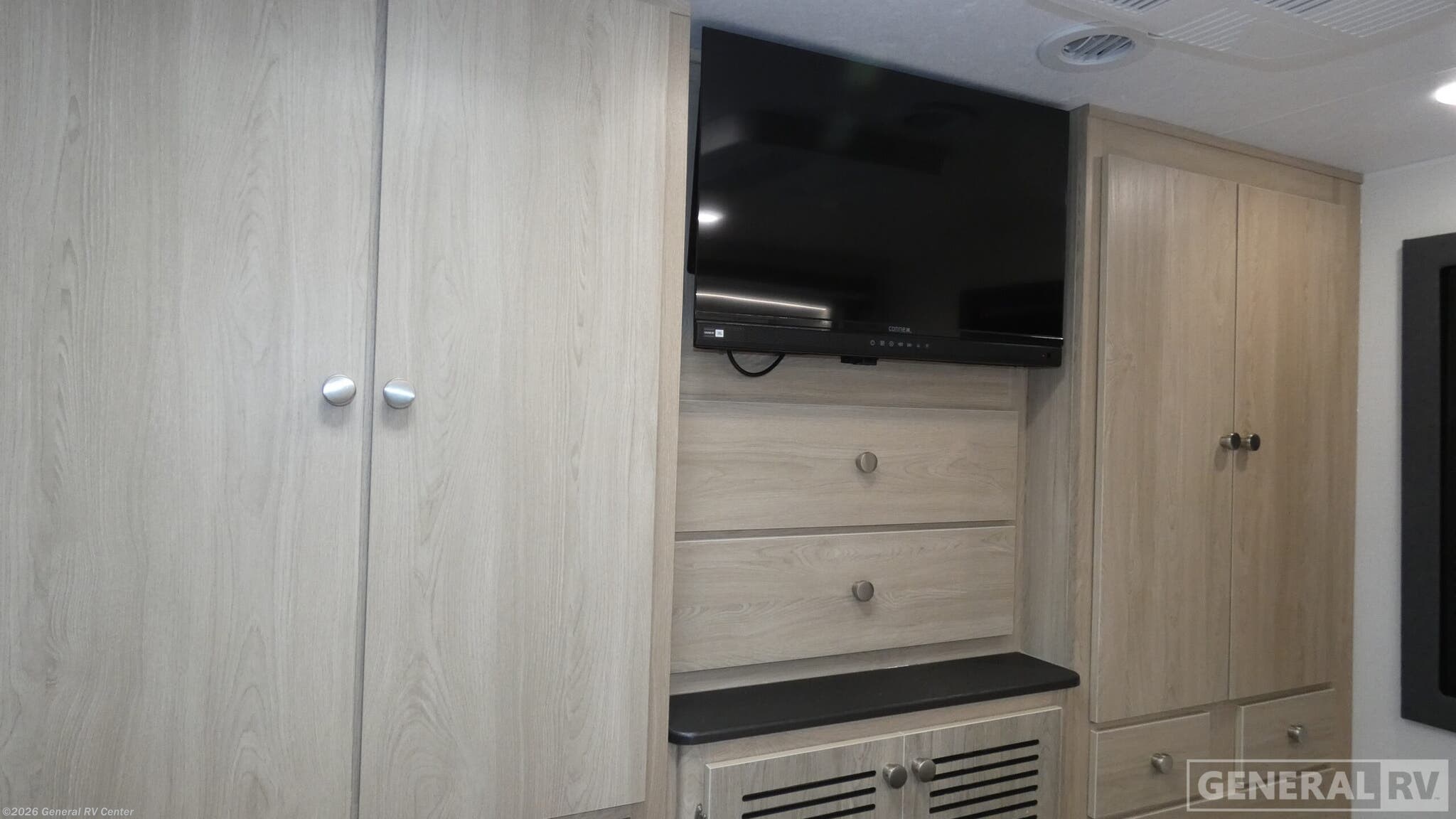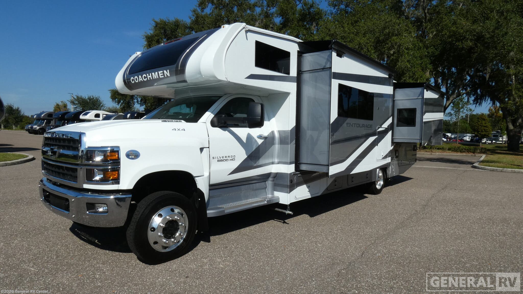Experience the perfect blend of luxury and functionality with the 2026 Coachmen Entourage 330DS. This motorhome is designed for those who crave adventure without sacrificing comfort. As you explore the spacious interior, you'll find a thoughtfully designed floorplan that includes a front living area with plush theater seating, perfect for relaxing after a day of exploration. The center kitchen, equipped with a three-burner cooktop and a full-size electric refrigerator, makes meal preparation a breeze, whether you're cooking for two or the whole family. The rear bedroom is a sanctuary of relaxation, featuring a power-inclining king bed that promises restful nights under the stars. With a sleeping capacity of up to six, thanks to the convertible and double beds, there's room for everyone. The RV is prepped for a washer and dryer, ensuring you have all the conveniences of home on the road. The 21-foot powered retractable awning extends your living space outdoors, perfect for enjoying the great outdoors in style. With a powerful Duramax V8 engine and a robust Chevrolet C5500 chassis, your journeys will be smooth and powerful. For more details and to see this beauty in person, visit your nearest General RV dealership.