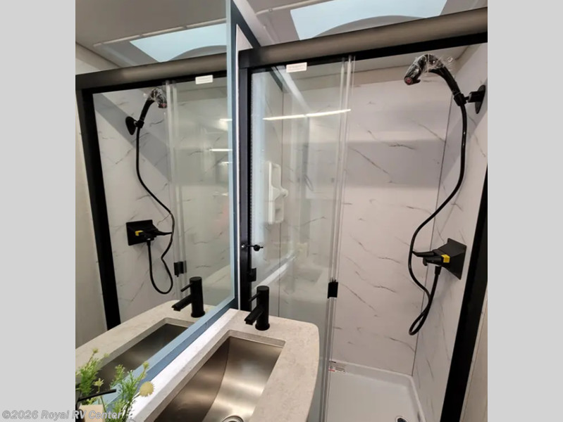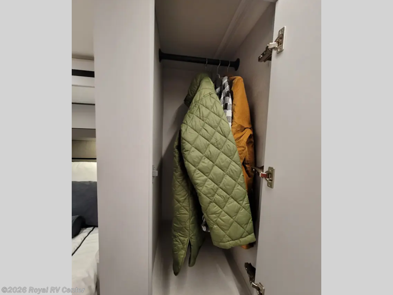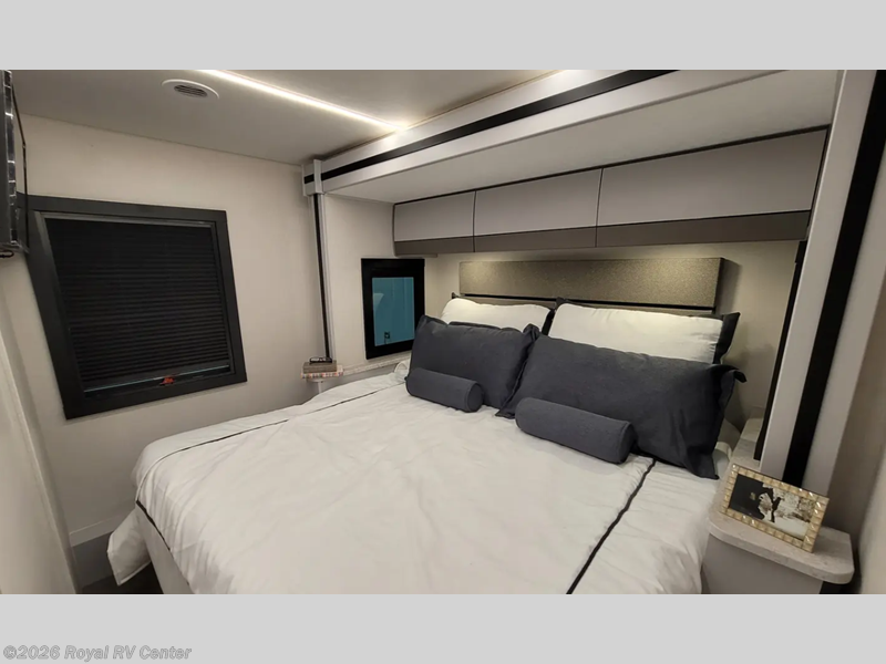 Come travel the state or country in this cozy coach! Once you arrive at your destination, the reclining/swivel pilot seats can become a part of the living area where your crew is relaxing on the sofa and two chairs with a table. You'll find an induction cooktop in the kitchen to prepare meals, plus a stainless steel double door refrigerator and a pantry to hold food for the whole week. A king bed slide out in the rear corner bedroom will have you feeling right at home, and there is a bedroom TV to watch movies in bed plus power outlets on both sides of the bed to charge your phone at night. Having a full bath onboard is sure to come in handy, especially with its glass shower door, skylight, and on-demand water heater. This model also includes two closets, one with washer and dryer prep to keep your clothes wrinkle-free plus more storage space throughout for camp gear and necessities!