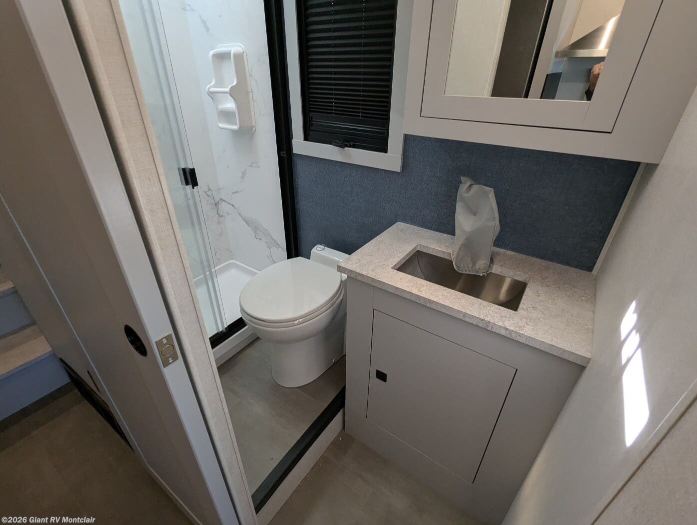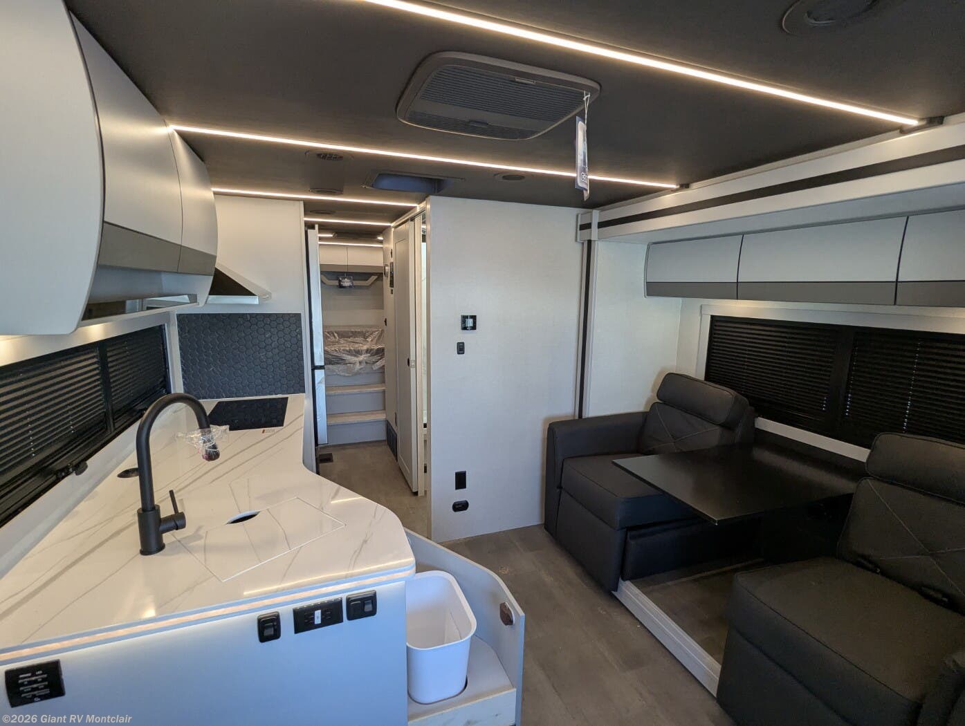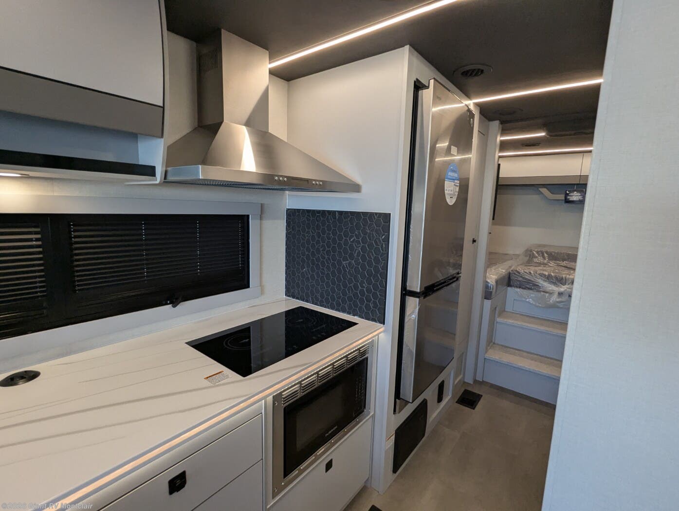 - Modern Amenities: Features air conditioning, a kitchen with an induction cooktop, 12V refrigerator, and a 32” smart TV for entertainment.