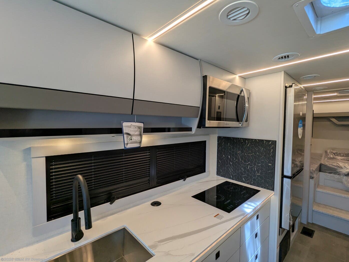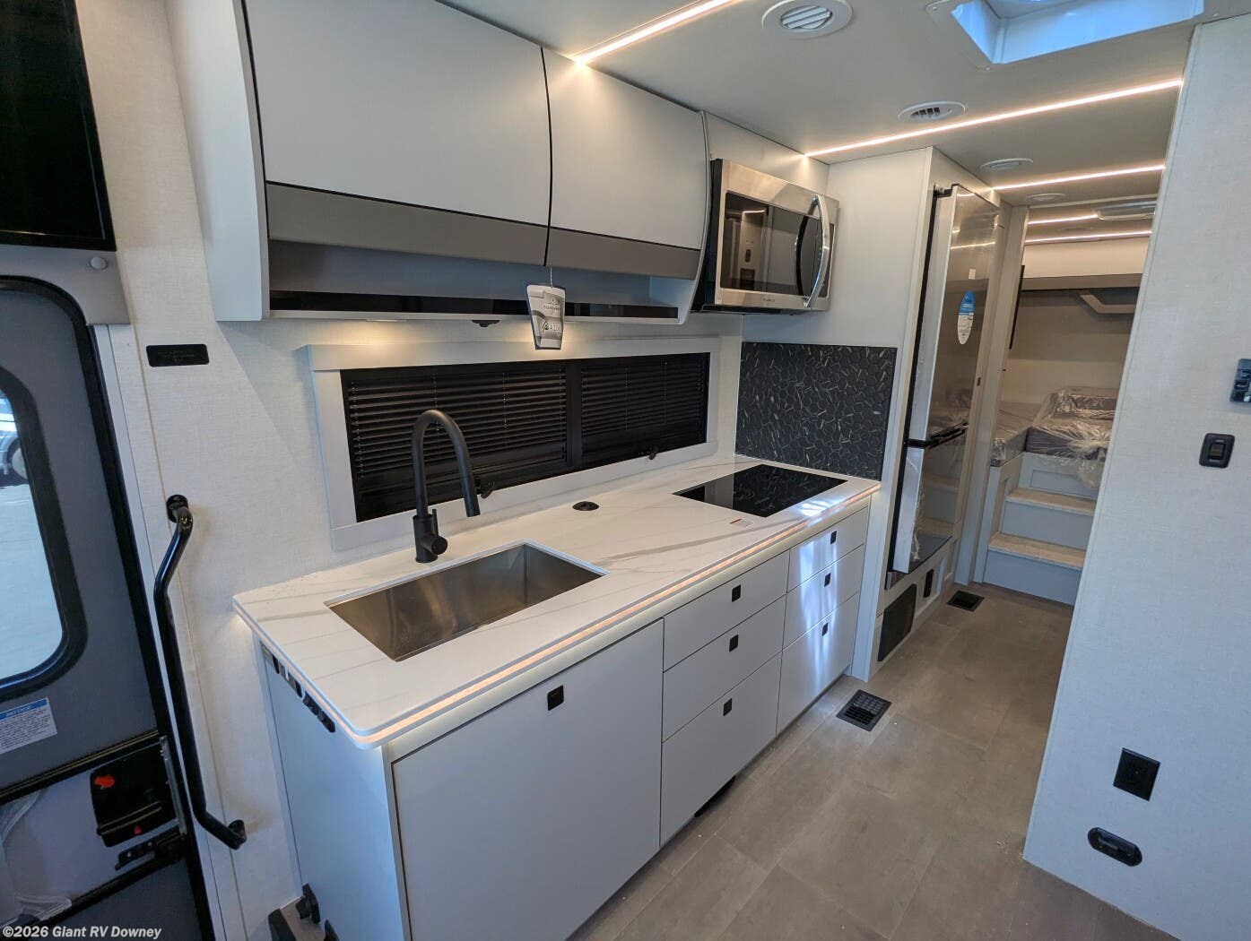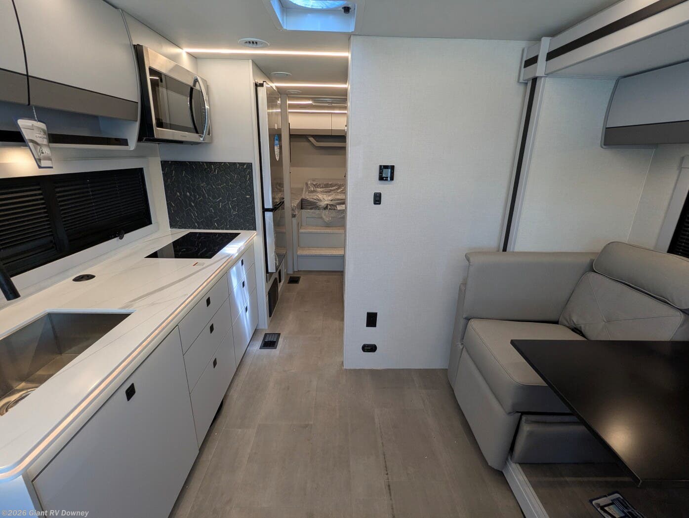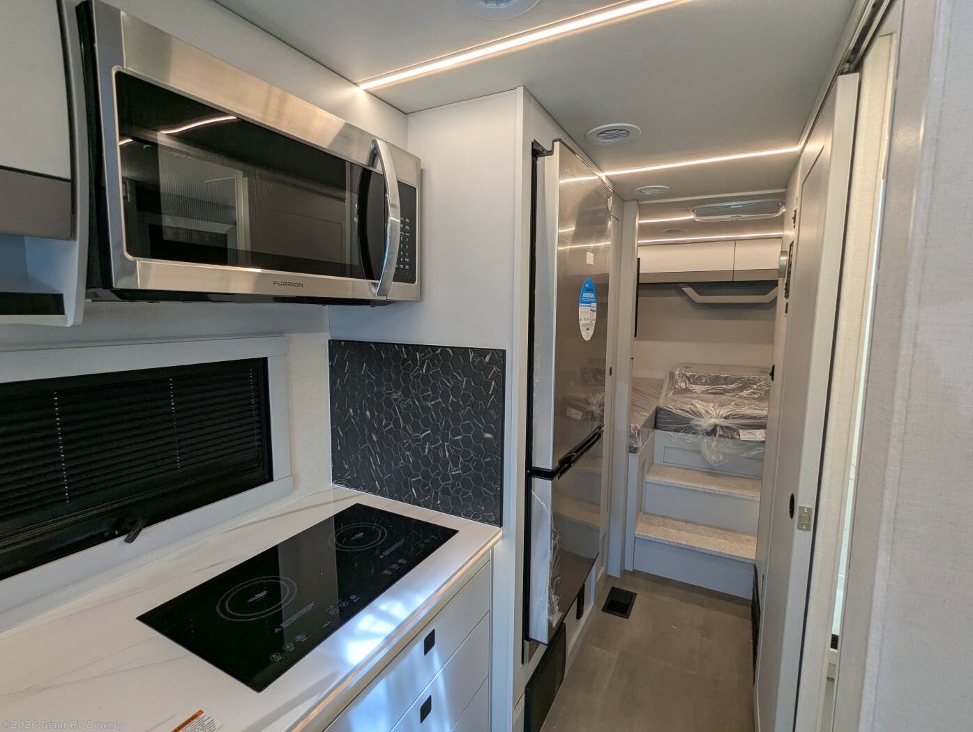 - Modern Kitchen: Equipped with an induction cooktop, stainless steel refrigerator, Furrion convection microwave, and ample cabinetry for meal prep.