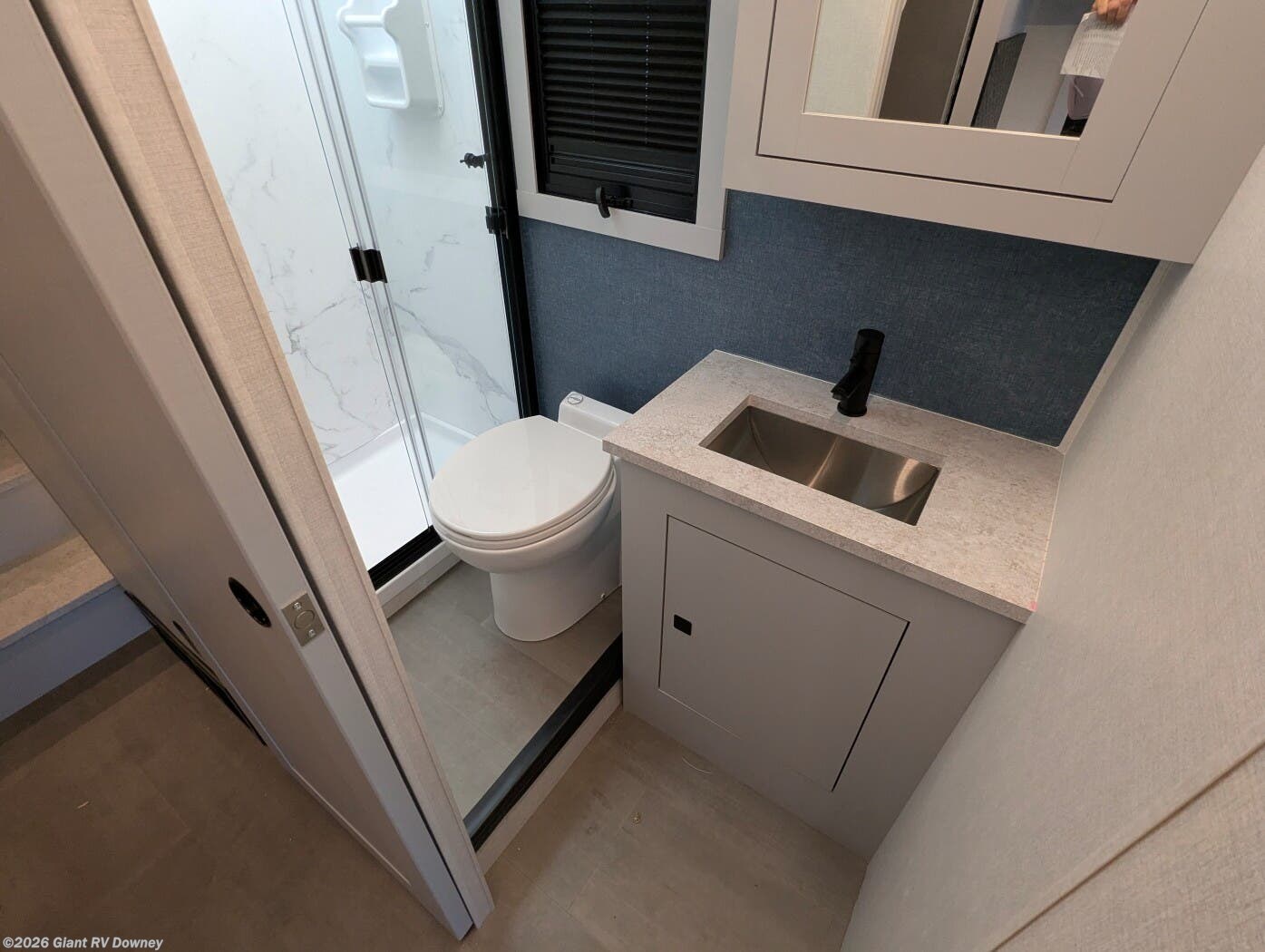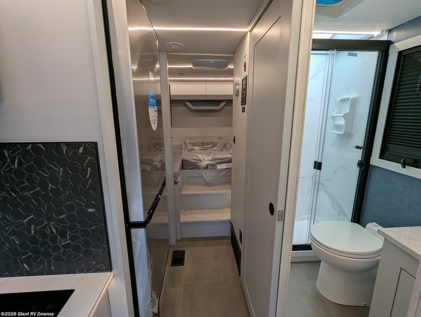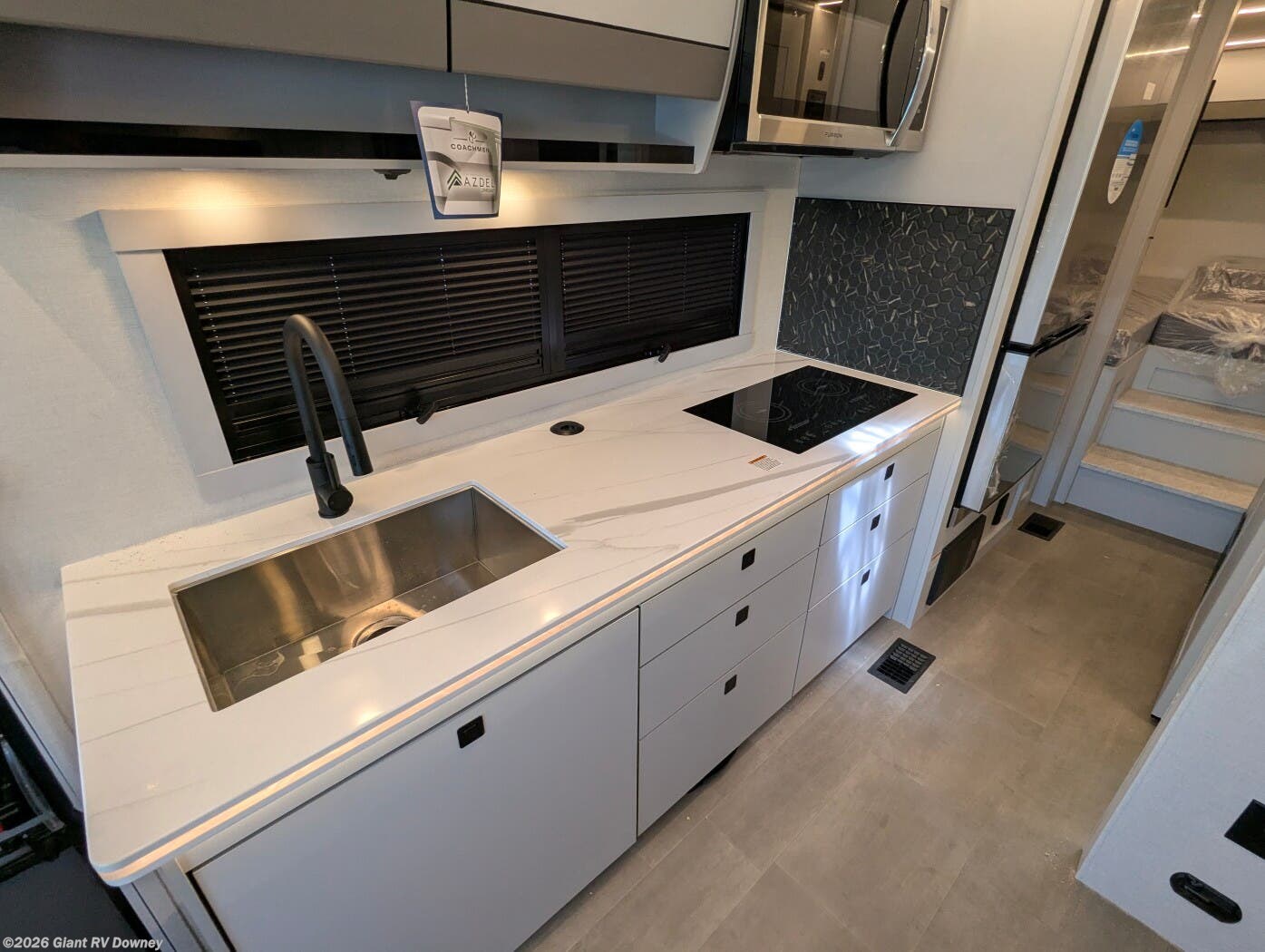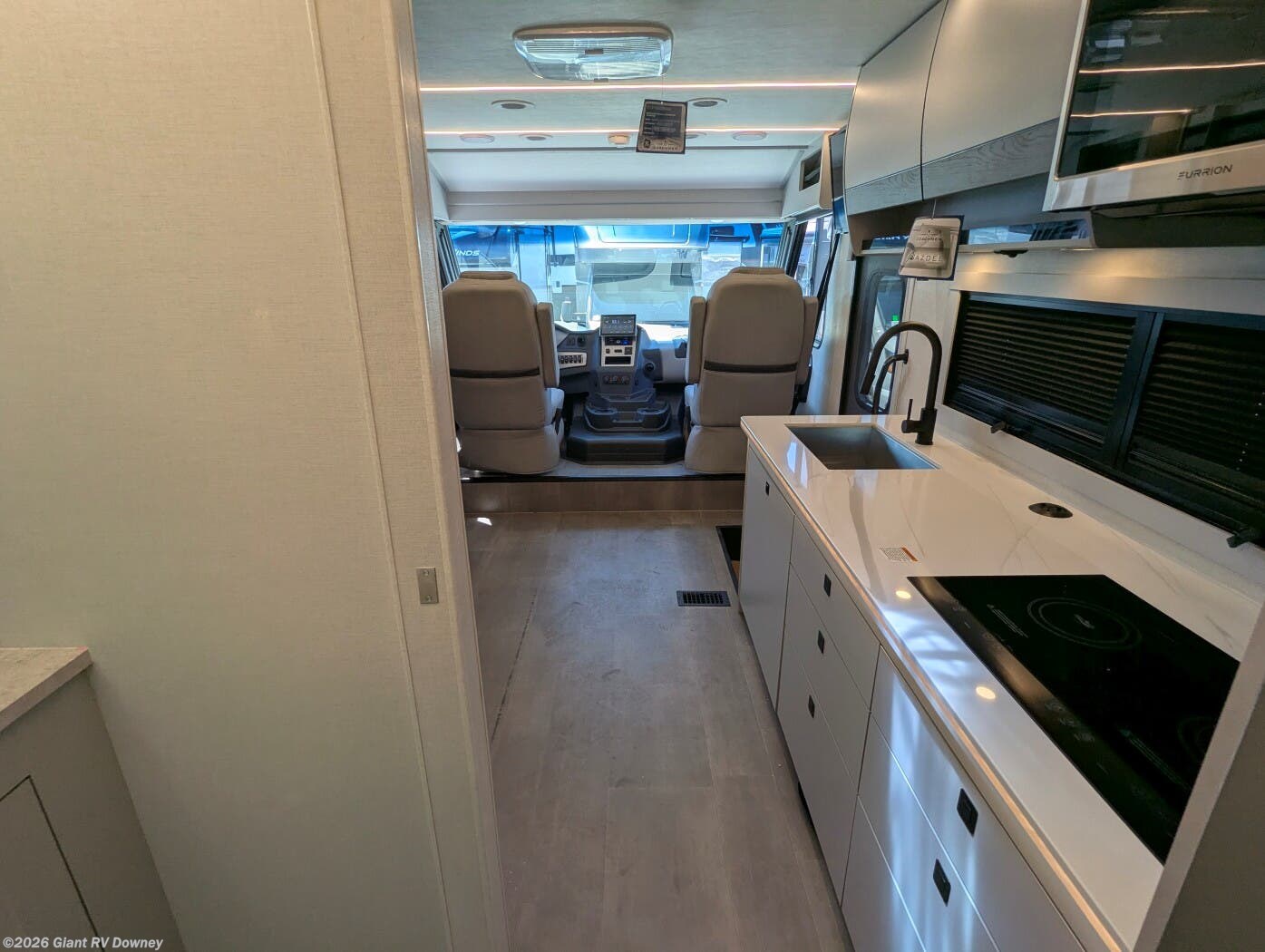 - Modern Kitchen: Equipped with an induction cooktop, stainless steel refrigerator, Furrion convection microwave, and ample cabinetry for meal prep.