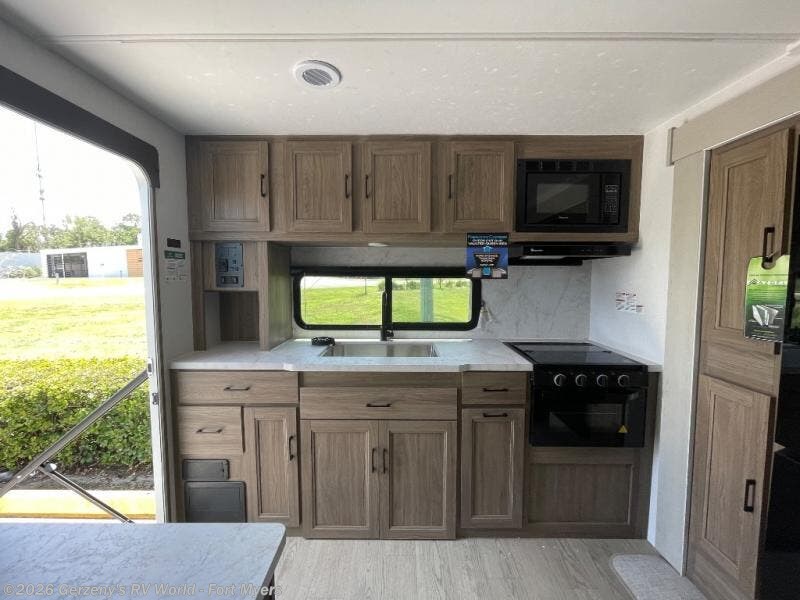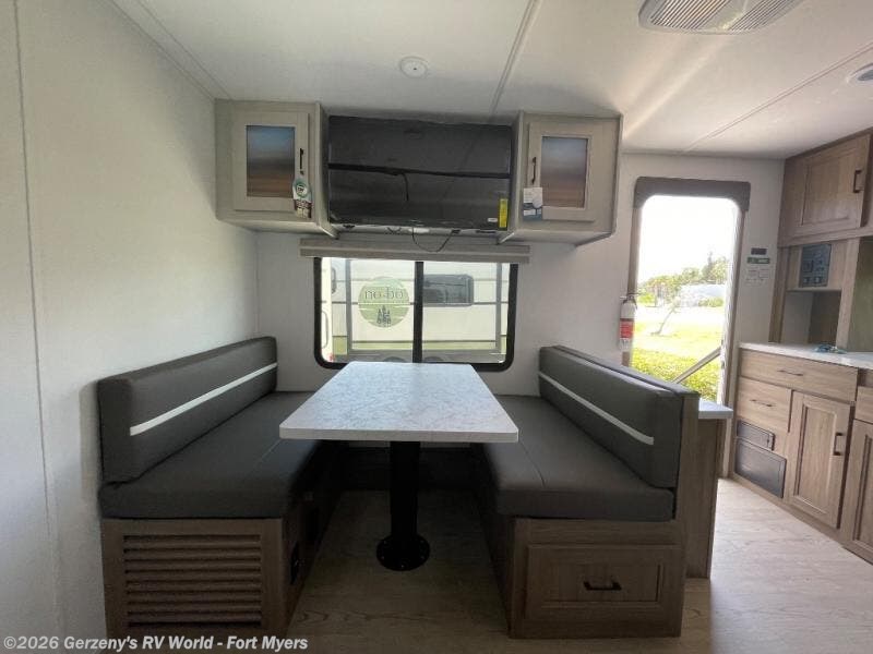 Check out this rear kitchen travel trailer that can sleep three to four each night. The front master bedroom includes a queen bed with vaulted under-bed storage for your belongings and dual wardrobes for even more storage. The theater seating within the large slide out and the booth dinette will provide comfortable seating space, and there is a Smart TV for those rainy camp days. This model also includes a three burner cooktop, a microwave oven, and an 8 cu. ft. double door refrigerator for your perishables. And don't forget about the power awning with LED lights!
