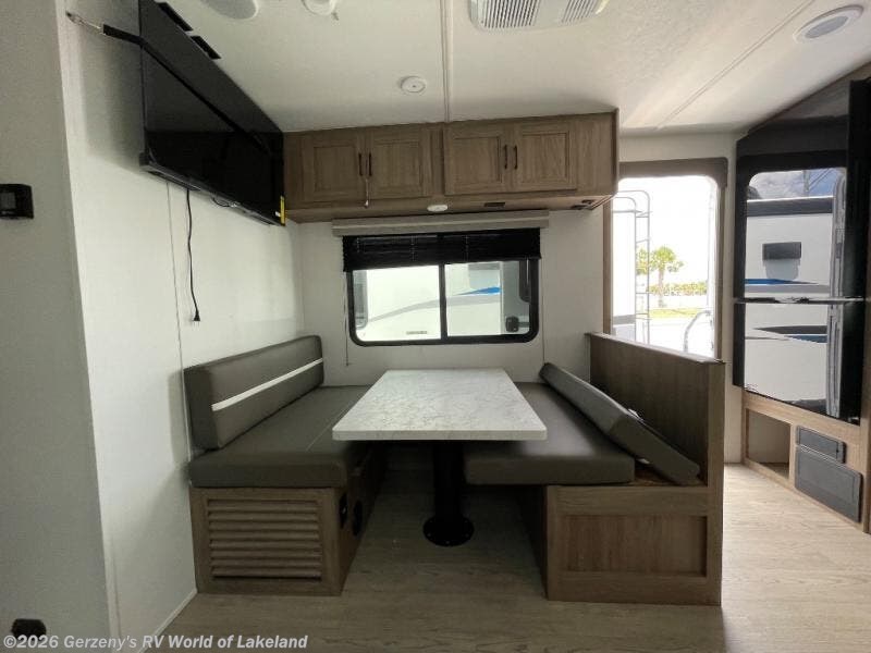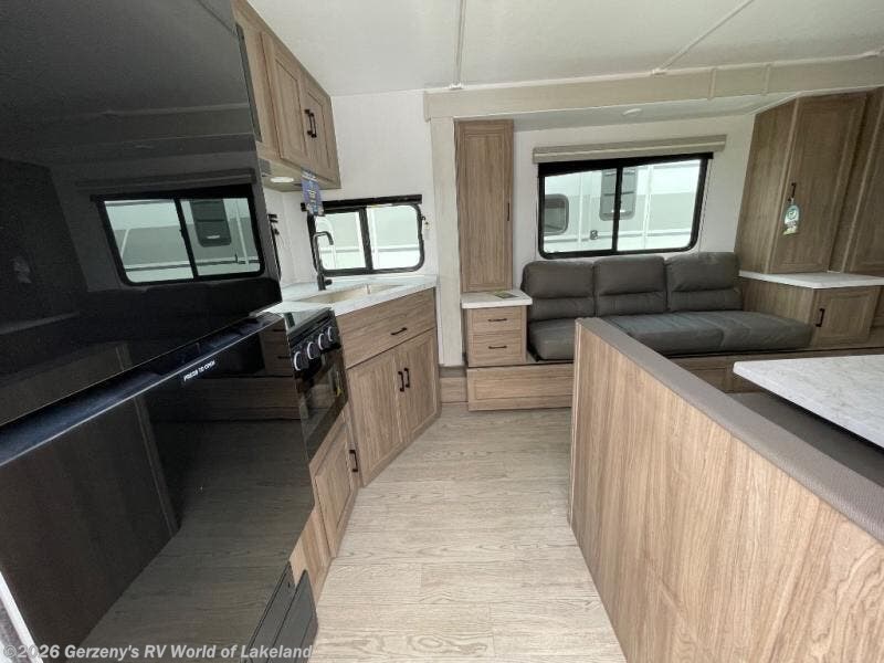 This travel trailer will feel a little more like home since there is a semi-private front bedroom with a queen bed, dual wardrobes, and a bedroom privacy curtain. On the opposite end, the rear kitchen will let you make meals each day on the dual-burner cooktop and microwave oven, plus there is a 12V refrigerator to keep food fresh. A large slide out includes a sofa, dual pantries with end tables, plus a wardrobe with a bench where you can pull your hiking boots off. And a booth dinette provides the perfect place to dine and play games together!