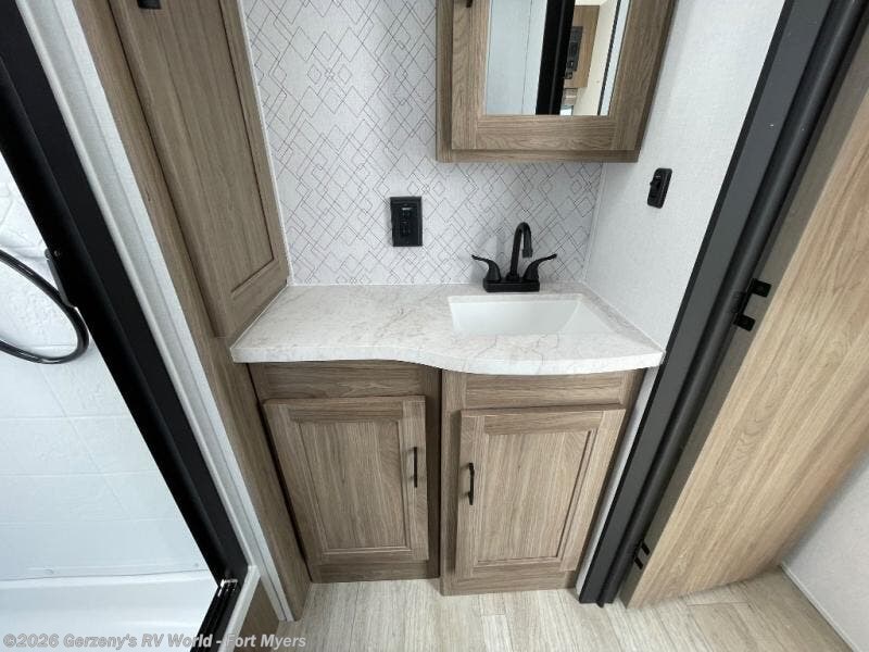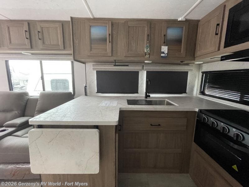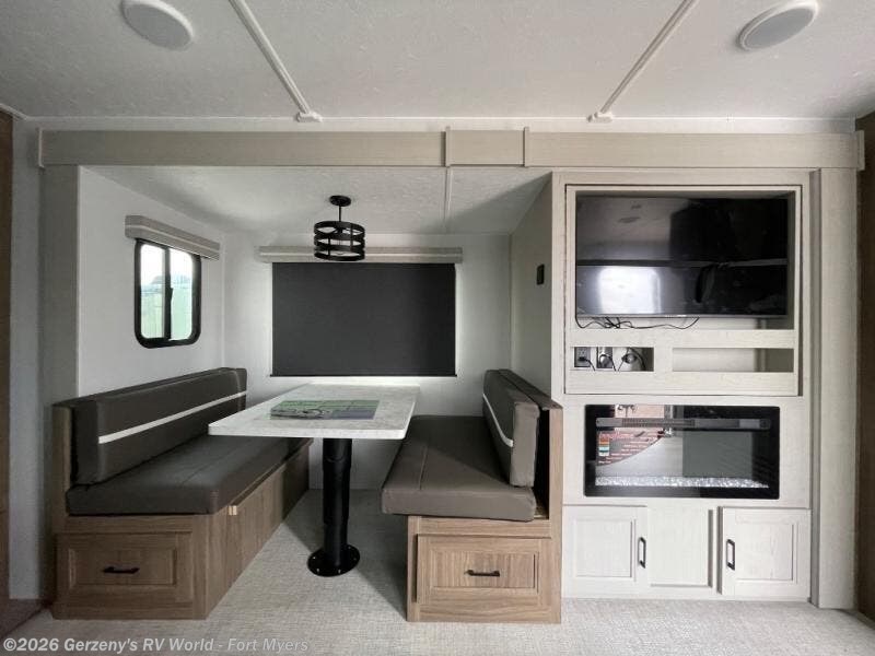 Are you looking for a travel trailer that will feel more like home? Look no further than this model that features a private bedroom up front, a full bath, plus a spacious rear kitchen. You will love to relax on the theatre sofa/hide-a-bed sofa across from the Smart TV and fireplace, and there is a booth dinette for dining. This model also includes a hidden pantry behind the TV for smart storage solutions. If the weather is nice you may just want to sit outdoors under the 18' power awning with LED lights. The chef of your group can prepare a meal on the pull-out camp kitchen, and the kids can grab their scooters from the pass-through storage.