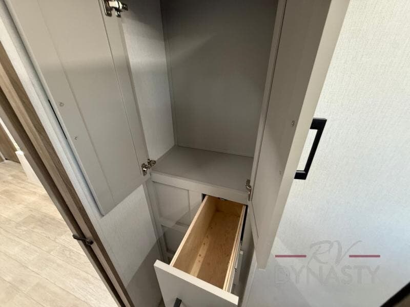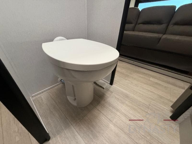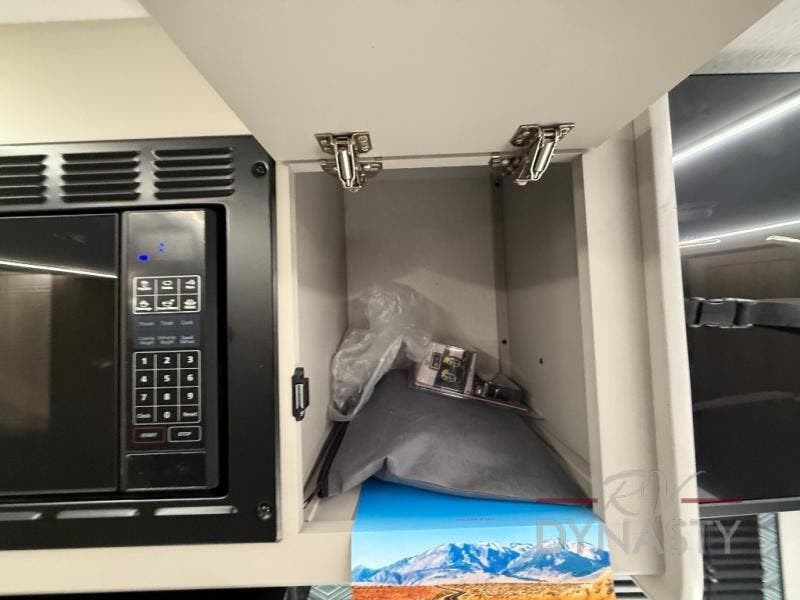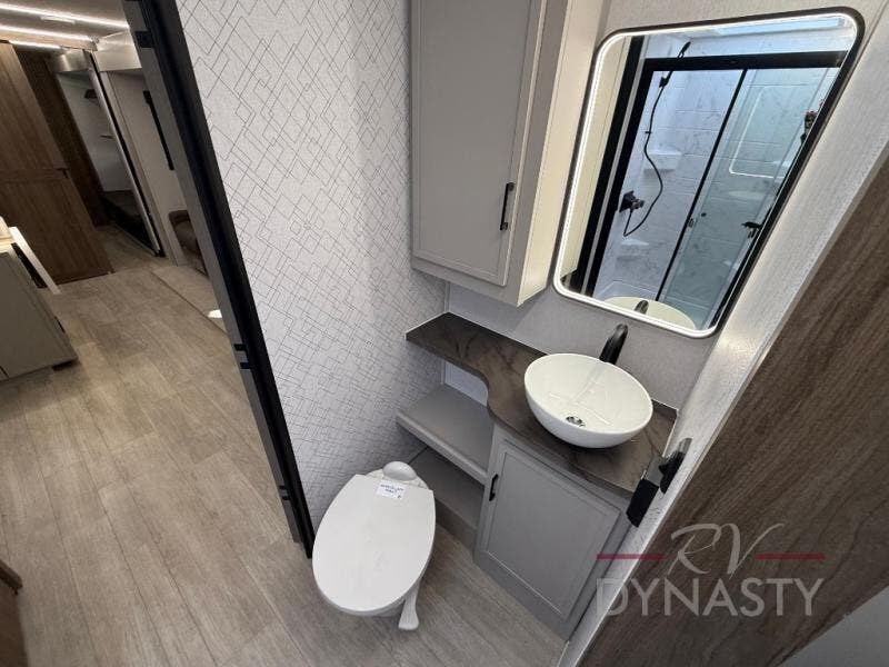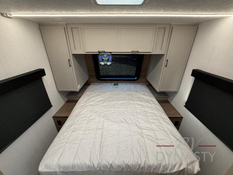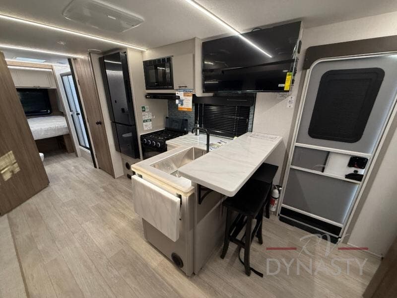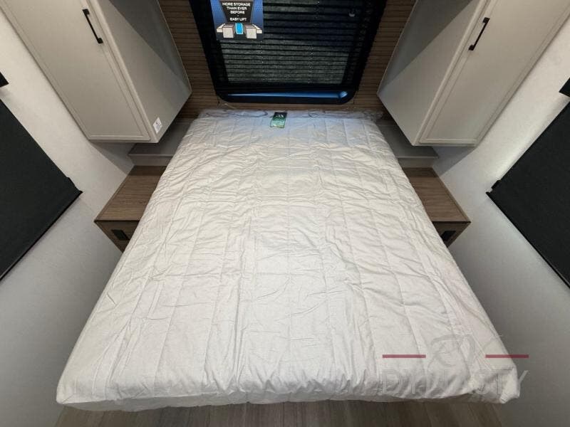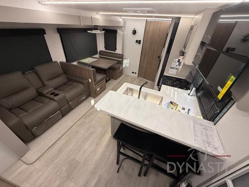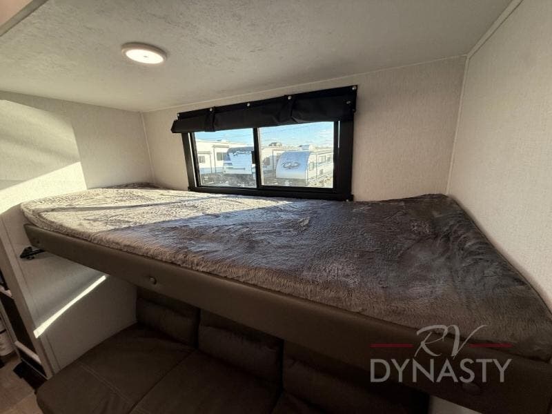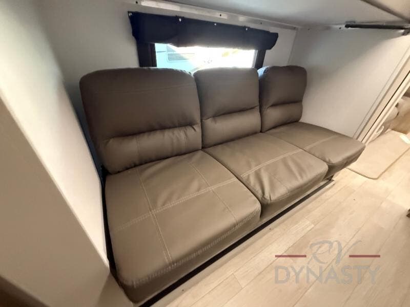 Get ready to immerse yourself in the relaxation zone. Two comfortable sofas convert into beds, and bunk beds above provide extra sleeping space for kids or guests. The bunkhouse is also divided with a half bath in the middle for privacy, which will make this space perfect for multiple guests or older children. The theater seating area is perfect for movie nights or game sessions. Furthermore, the kitchen is a culinary haven, featuring a four-burner range, microwave, and 12V refrigerator. The flip-up countertop adds extra space for food prep or snacks. The walk-through bathroom offers a refreshing oasis, equipped with everything you need to start your day feeling revitalized. Finally, the front bedroom is a peaceful retreat, featuring a queen bed and wardrobes on each side.