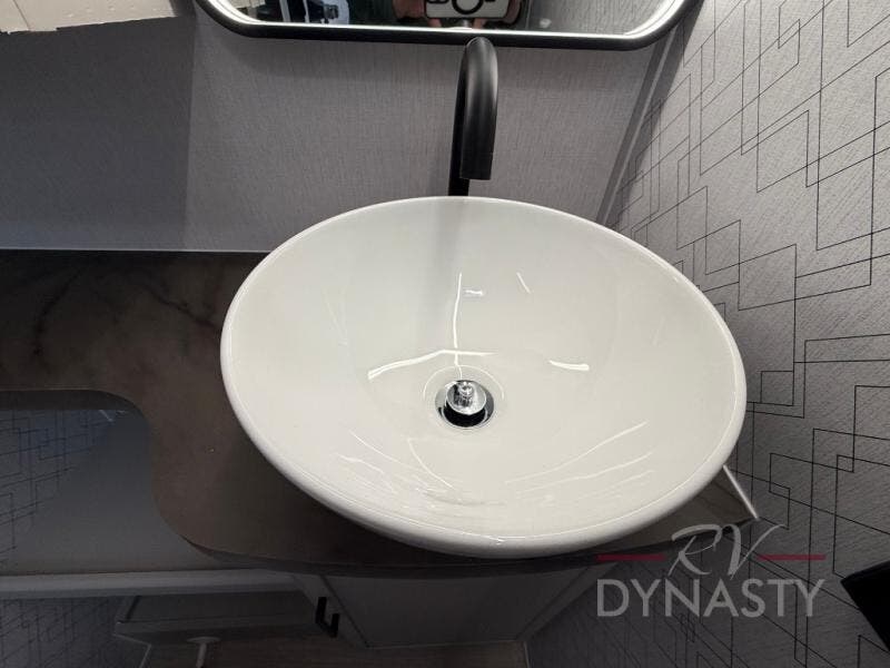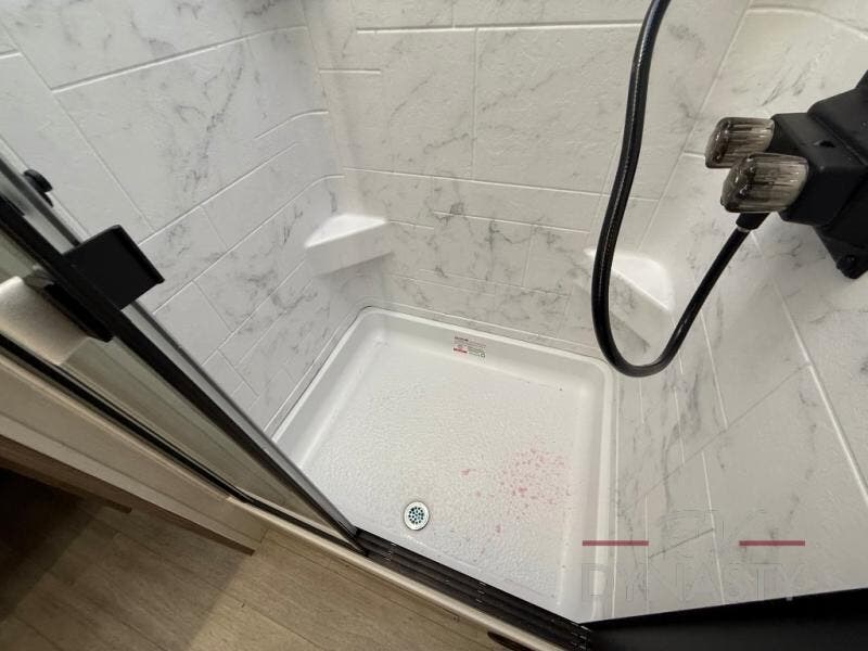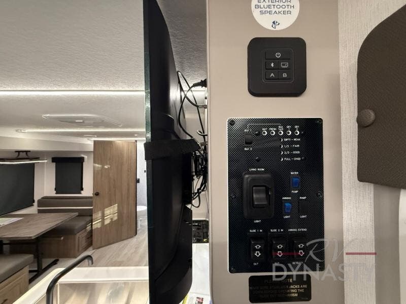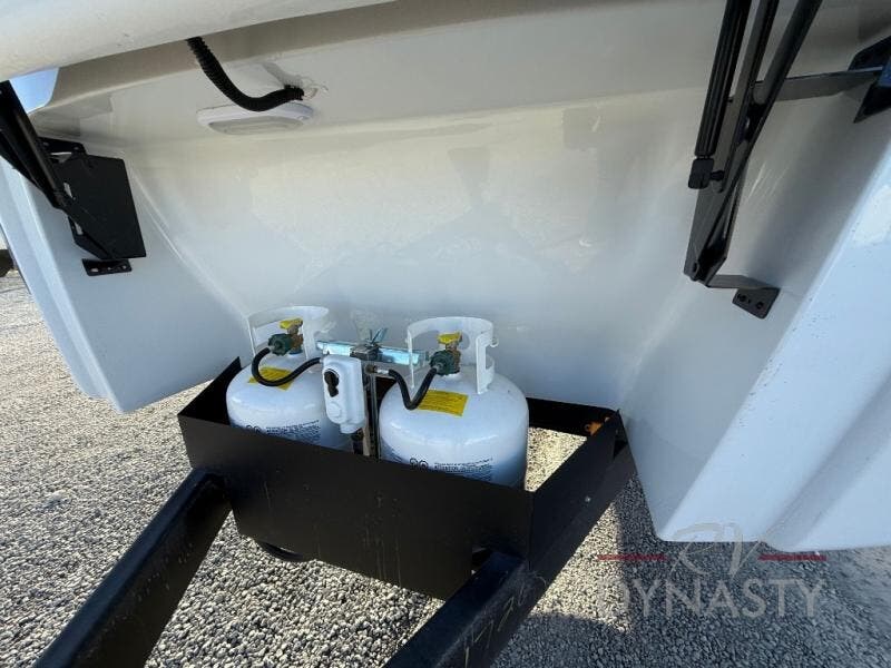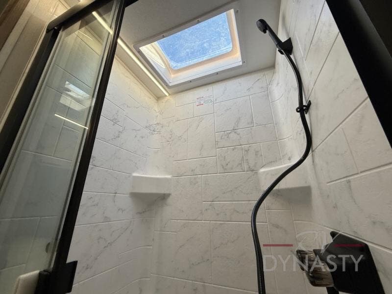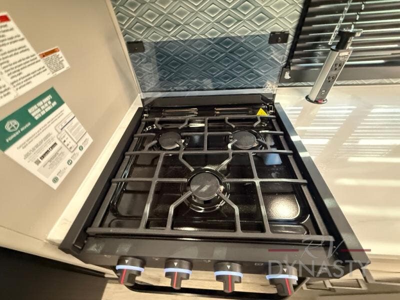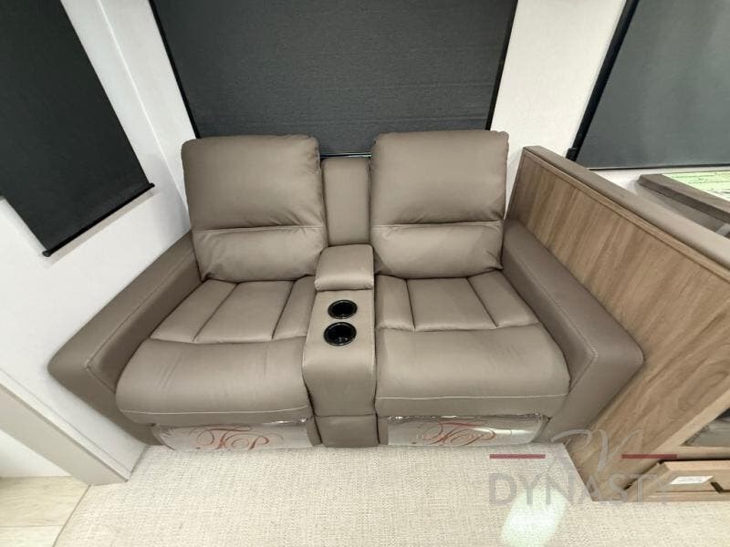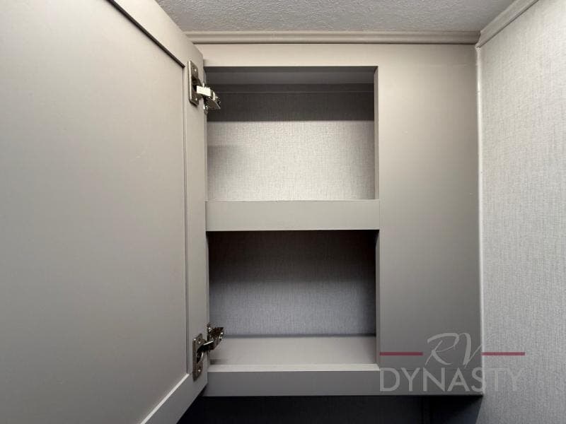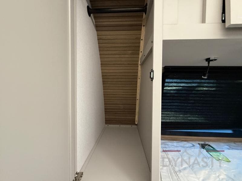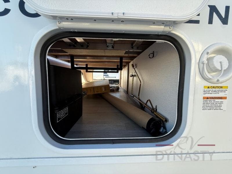 Get ready to immerse yourself in the relaxation zone. Two comfortable sofas convert into beds, and bunk beds above provide extra sleeping space for kids or guests. The bunkhouse is also divided with a half bath in the middle for privacy, which will make this space perfect for multiple guests or older children. The theater seating area is perfect for movie nights or game sessions. Furthermore, the kitchen is a culinary haven, featuring a four-burner range, microwave, and 12V refrigerator. The flip-up countertop adds extra space for food prep or snacks. The walk-through bathroom offers a refreshing oasis, equipped with everything you need to start your day feeling revitalized. Finally, the front bedroom is a peaceful retreat, featuring a queen bed and wardrobes on each side.