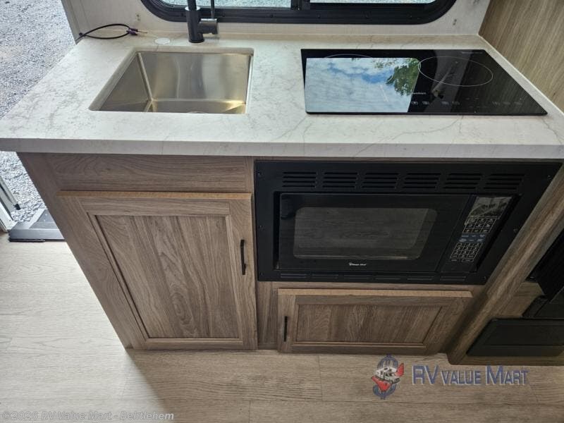 You'll love spending time at the campground in this single slide out travel trailer! The 54" x 80" front bed includes vaulted underbed storage to keep your luggage or extra blankets out of the way, plus there are dual bedside wardrobes for your clothes. A sofa with a free-standing table will provide a place to relax and dine, and the full kitchen includes a dual-burner cooktop and microwave oven to cook meals each day. This unit also features a full rear bath, complete with a 30" x 36" shower, a toilet, and a sink with a medicine cabinet for your necessities.