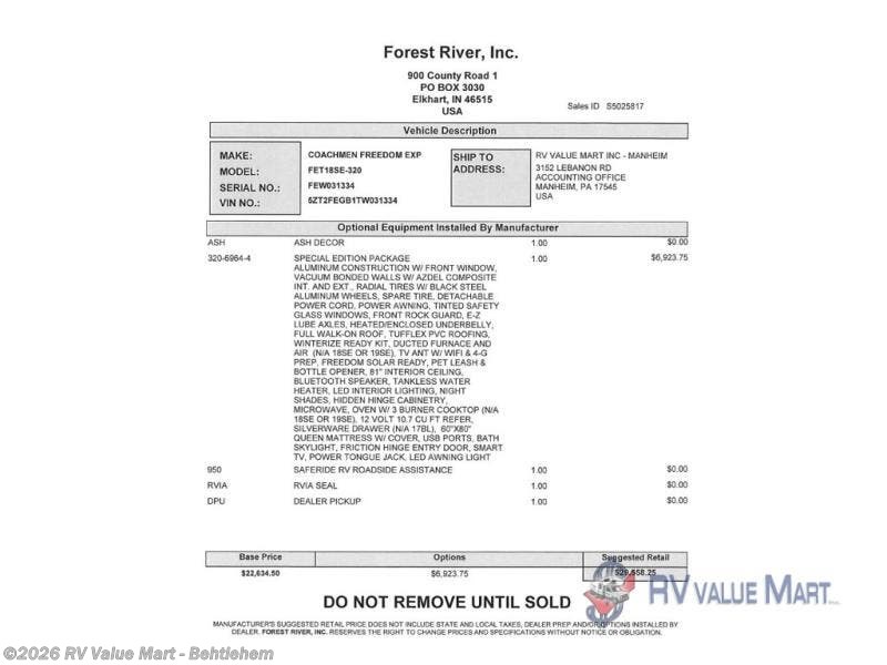 Request More Info on this 2026 Coachmen Freedom Express Select 18SE Offered for sale by RV Value Mart - Behtlehem