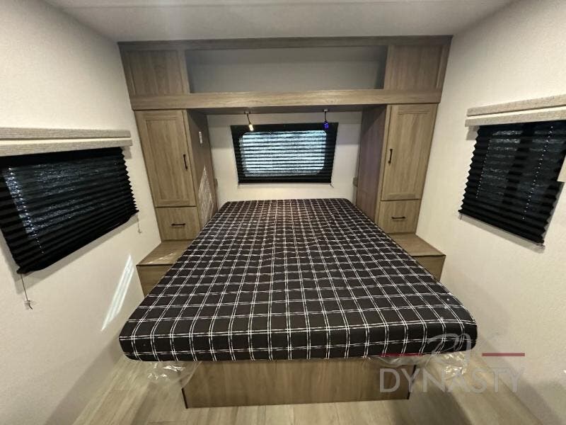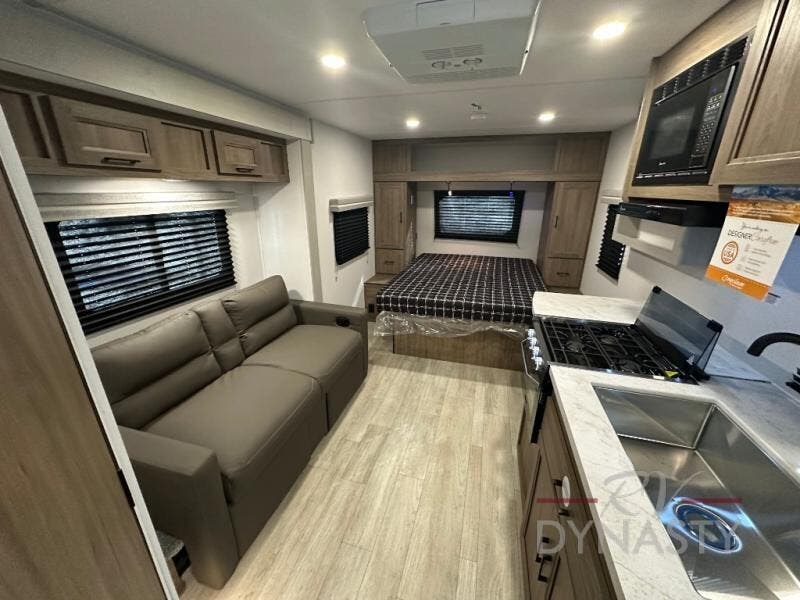 You'll love spending time at the campground in this single slide out travel trailer! The 60" x 80" front queen bed includes vaulted underbed storage to keep your luggage or extra blankets out of the way, plus there are dual bedside wardrobes for your clothes. A sofa with a free-standing table will provide a place to relax and dine, and the full kitchen includes a dual-burner cooktop and microwave oven to cook meals each day. This unit also features a rear corner bath with a 32" radius shower, a toilet, sink, and bath linen closet for clean towels!