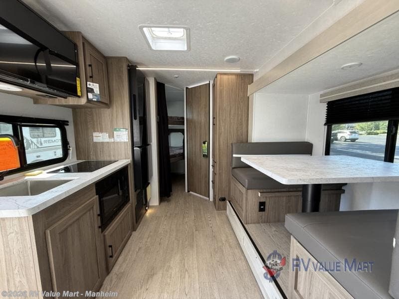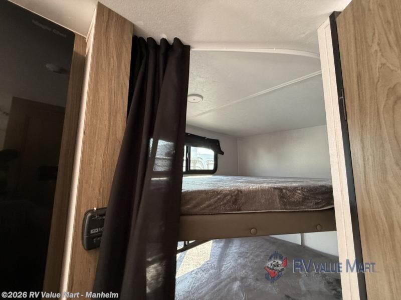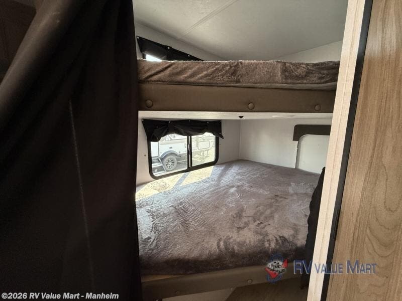 Camping with more friends and family is possible in this bunkhouse travel trailer! There is a double-size top bunk plus a double-size lower flip-up bunk for comfy sleeping space and additional storage space. You'll find your own bed up front with underbed storage and dual wardrobes to keep clothes wrinkle-free. Since there is a booth dinette slide out, you'll have additional interior space plus a place to dine, play games, and even let an extra guest sleep over. The full kitchen includes a dual burner cooktop and microwave oven to cook meals each day, along with a pantry and 12V refrigerator for food storage. And a full bath on board means you won't have to use the camp's facilities to freshen up each day; how convenient!
