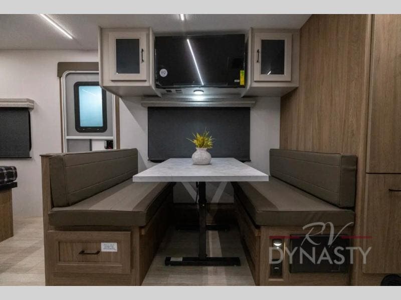 This travel trailer will feel a little more like home since there is a semi-private front bedroom with a queen bed, dual wardrobes, and a bedroom privacy curtain. On the opposite end, the rear kitchen will let you make meals each day on the dual-burner cooktop and microwave oven, plus there is a 12V refrigerator to keep food fresh. A large slide out includes a sofa, dual pantries with end tables, plus a wardrobe with a bench where you can pull your hiking boots off. And a booth dinette provides the perfect place to dine and play games together!