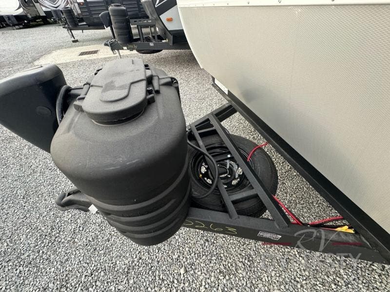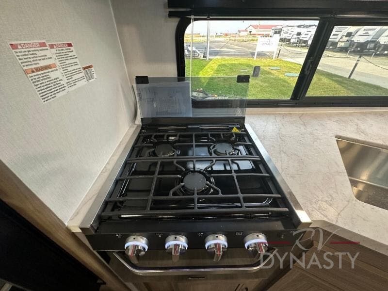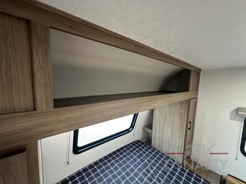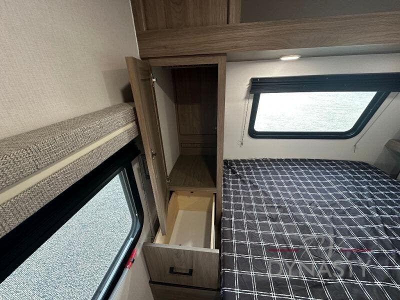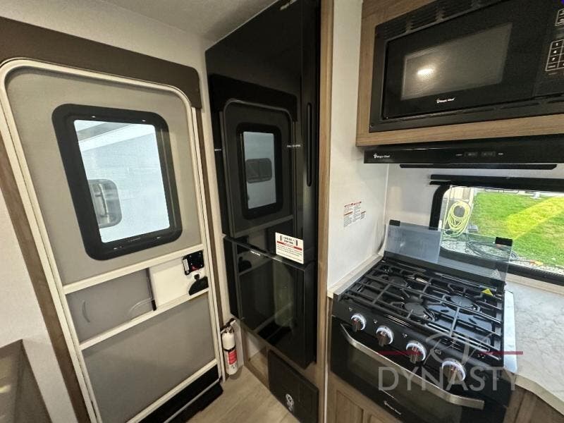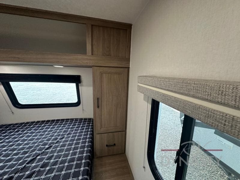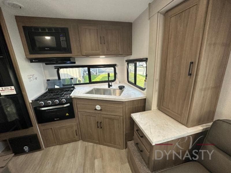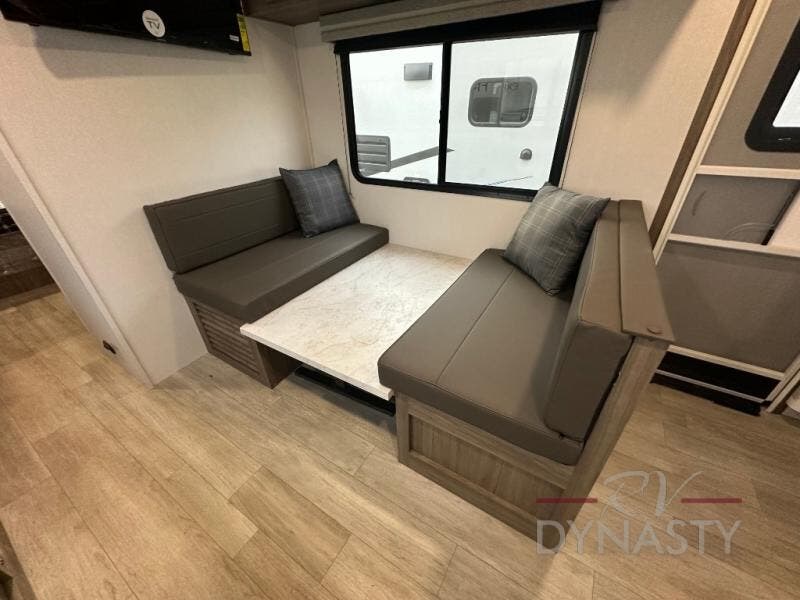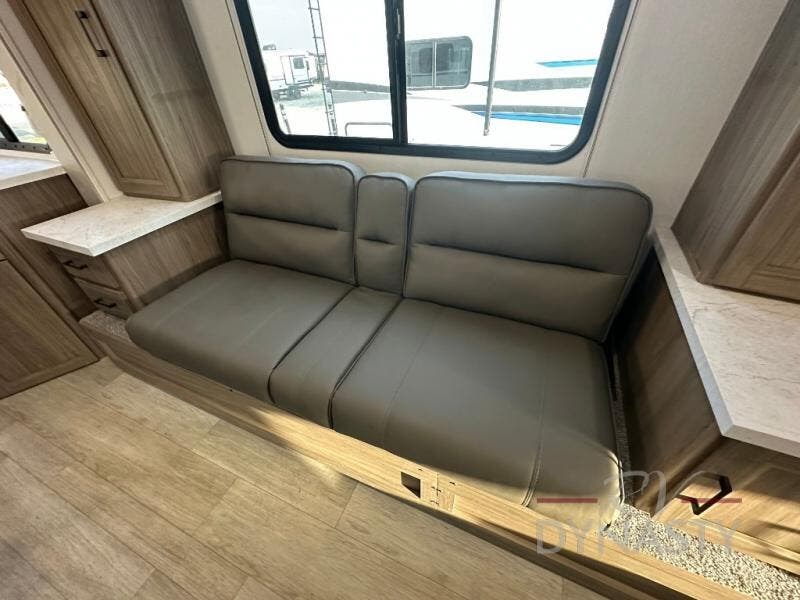 This travel trailer will feel a little more like home since there is a semi-private front bedroom with a queen bed, dual wardrobes, and a bedroom privacy curtain. On the opposite end, the rear kitchen will let you make meals each day on the dual-burner cooktop and microwave oven, plus there is a 12V refrigerator to keep food fresh. A large slide out includes a sofa, dual pantries with end tables, plus a wardrobe with a bench where you can pull your hiking boots off. And a booth dinette provides the perfect place to dine and play games together!
