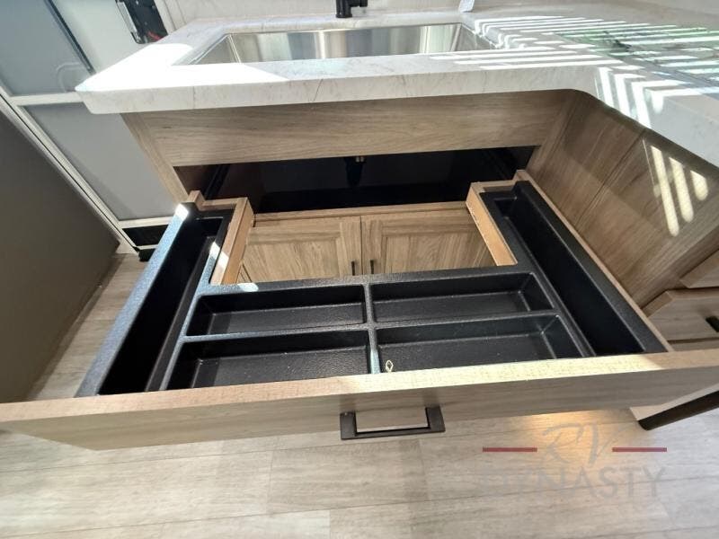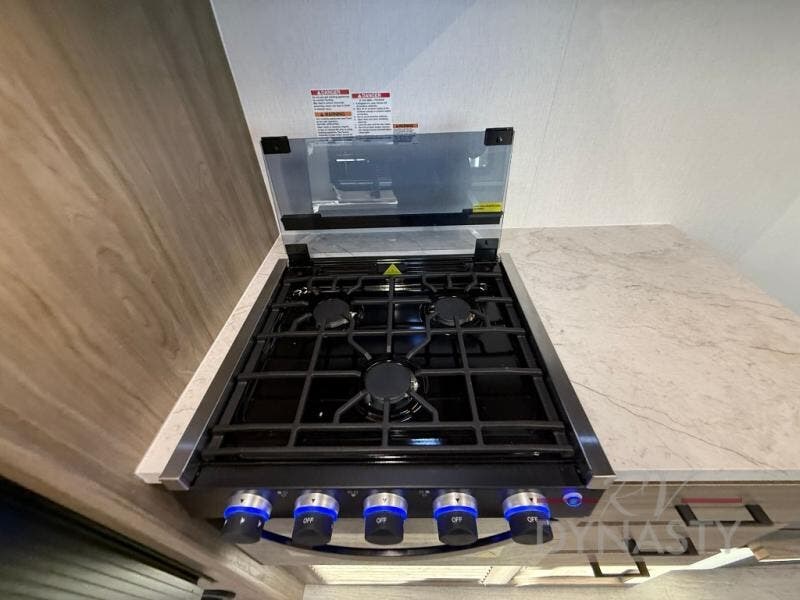Step inside this travel trailer and be welcomed by a spacious front living area featuring a full-width sofa, complemented by a cozy dinette, ottoman, and an entertainment center—perfect for relaxing, dining, or planning your day. The central kitchen is fully equipped for the chef, boasting a 10 cubic ft refrigerator, Magic Chef gas cooktop, microwave, and ample overhead storage. Moving forward, a convenient pass-through full bathroom offers practicality on the go. At the rear, the bedroom features a comfortable 60" x 80" queen bed, flanked by wardrobes on each side and additional overhead storage to keep all your essentials neatly organized.