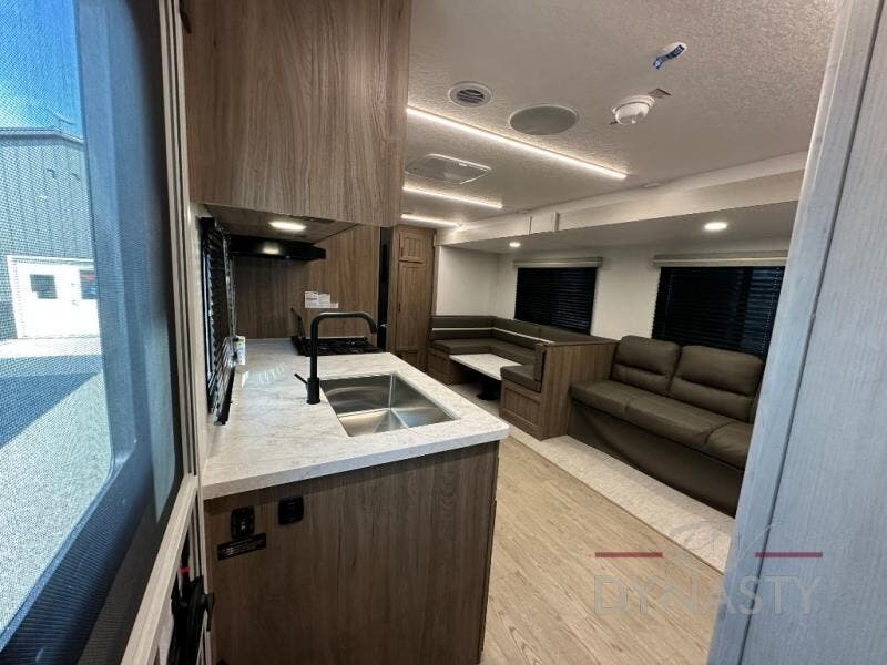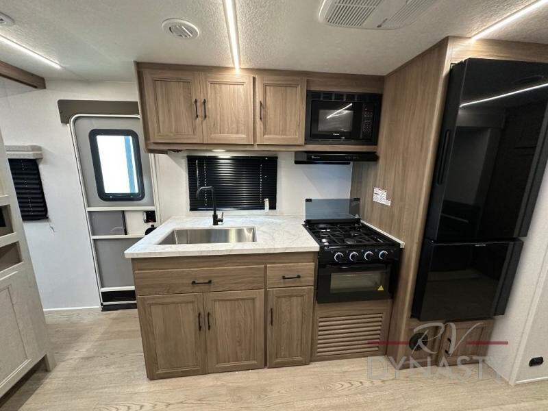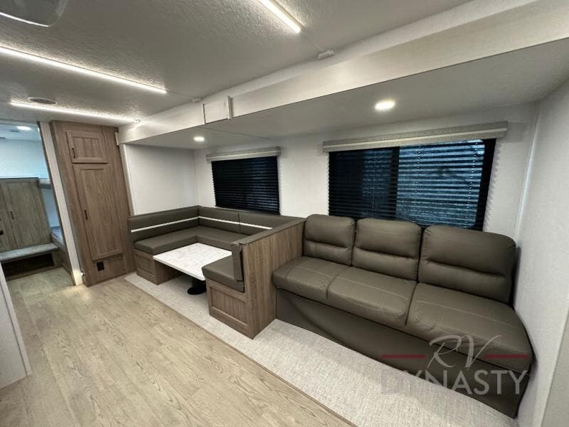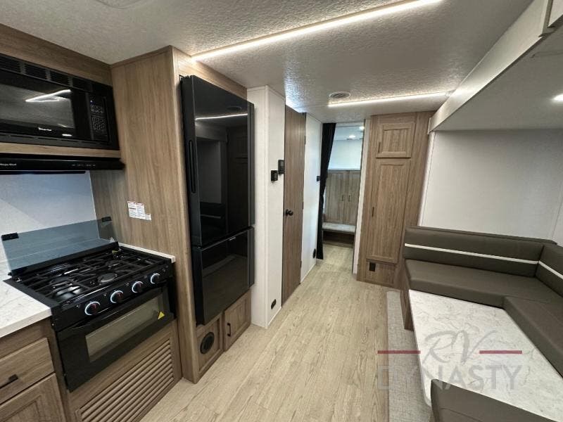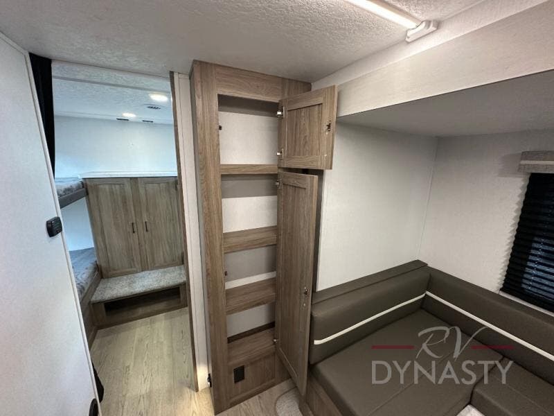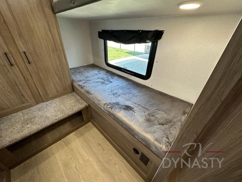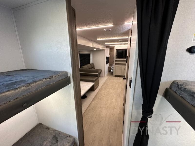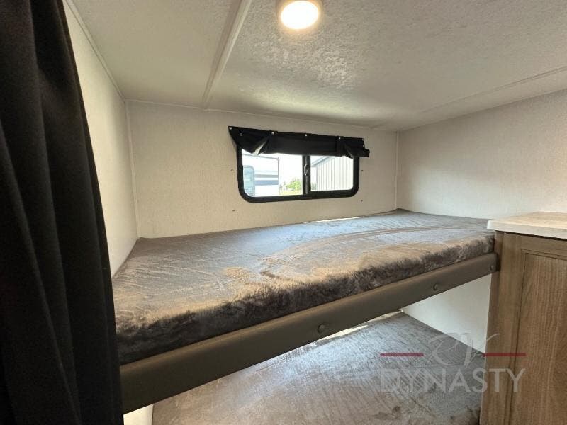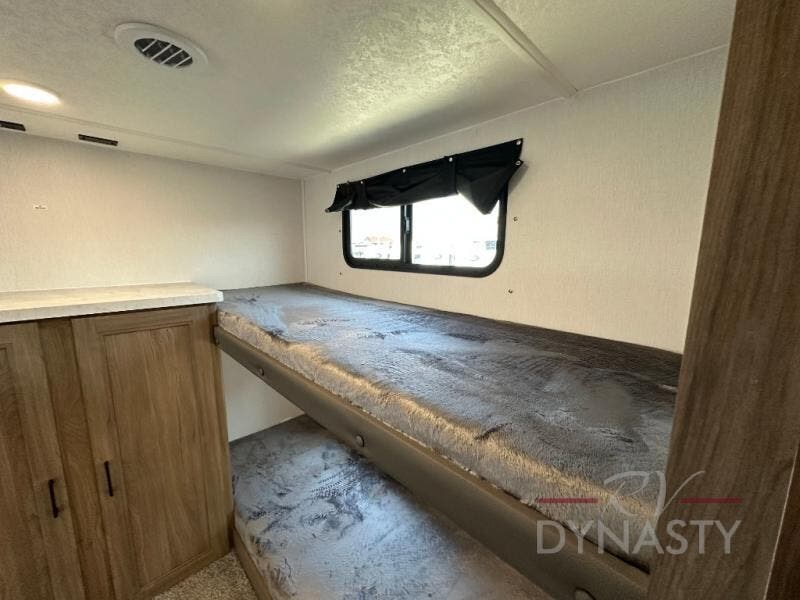 Whole-family fun is waiting for you in this spacious travel trailer. The kids or your guests will love the private bunkhouse with four bunks, plus a wardrobe with a countertop to keep their things. You will enjoy the front private bedroom with a walk-around queen bed and dual wardrobes, and if you have any other guests, they can sleep on the sofa or U-shaped dinette within the large slide out. The kitchen includes everything needed to prepare meals each day, including a microwave oven, a dual-burner cooktop, and a double door refrigerator. This model also includes a pass-through storage, plus additional exterior storage to bring along hiking gear, fishing poles, and camp chairs!