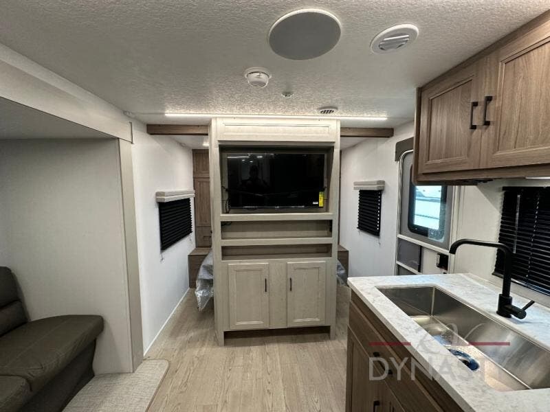 With any Freedom Express Select travel trailer by Coachmen you will find an alumicage construction and vacuum bonded walls with Azdel composite for a trailer made to last. These Select value models come standard with a Bluetooth interior speaker, night shades, and wear-resistant vinyl flooring throughout. You will appreciate the power tongue jack, as well as the Tufflex PVC roof and heated and enclosed underbelly to extend your camping season. A 15K BTU roof A/C will keep you comfortable, and the tankless water heater will provide endless hot showers!