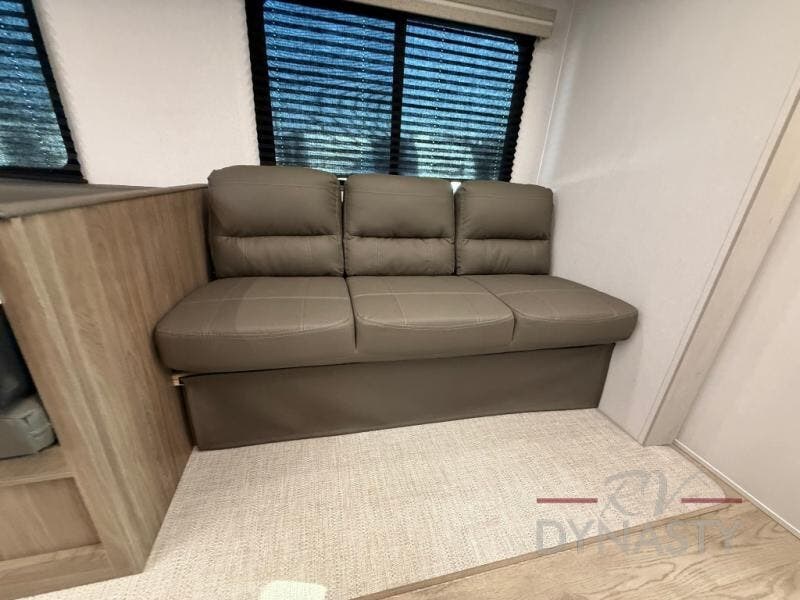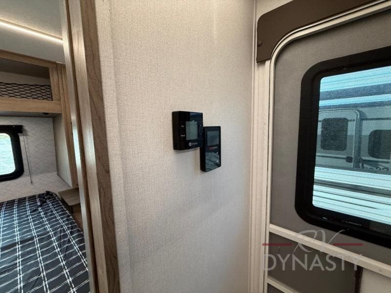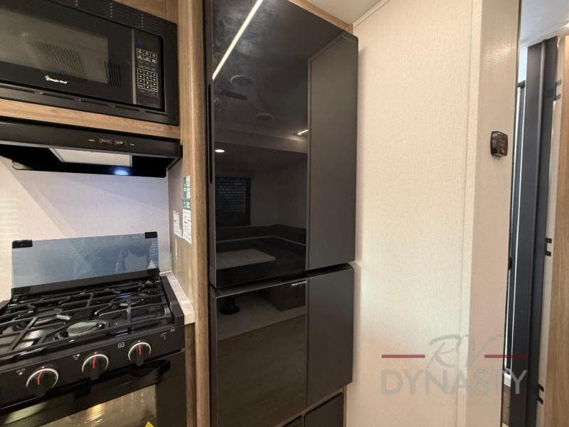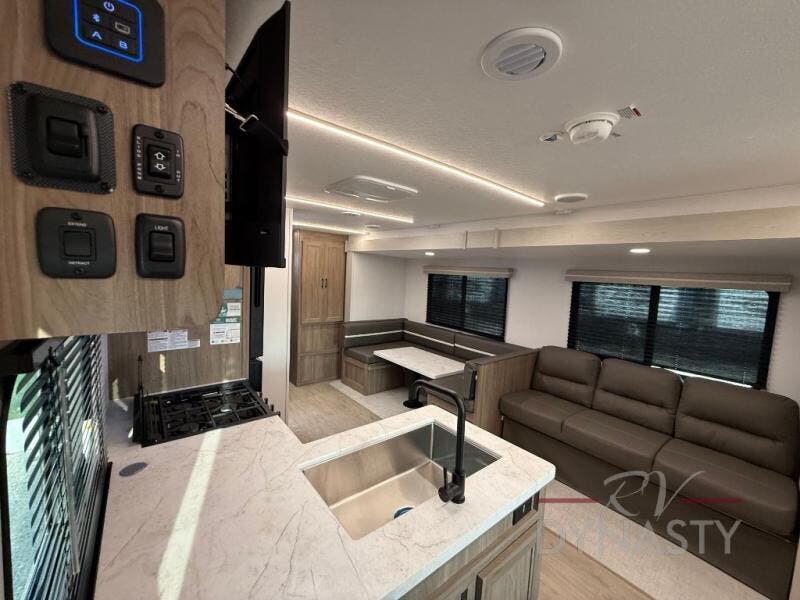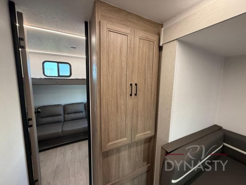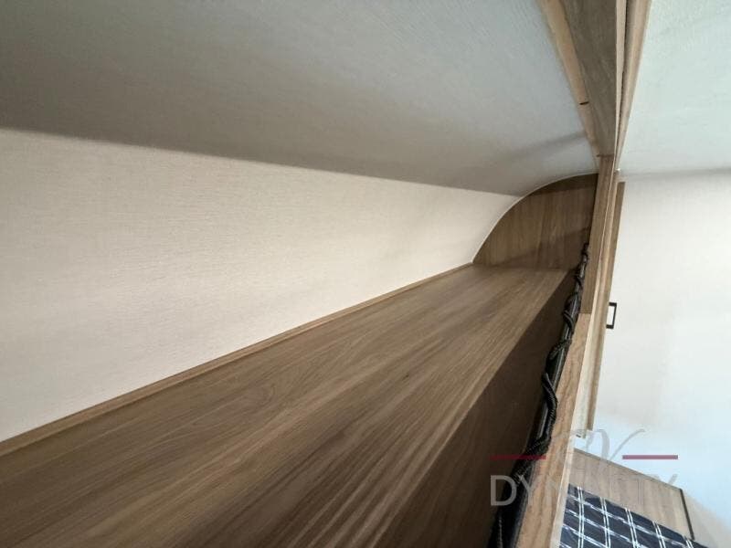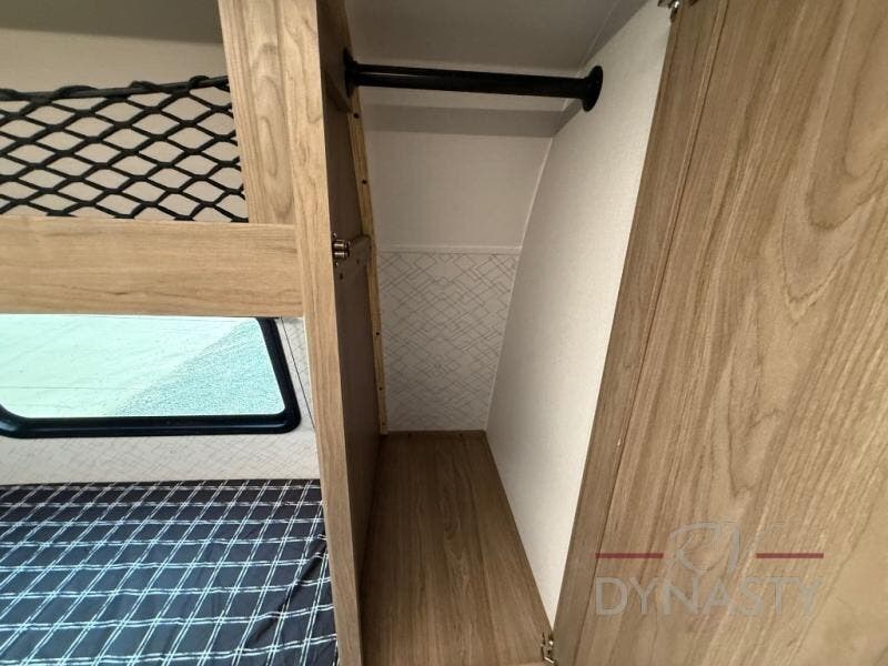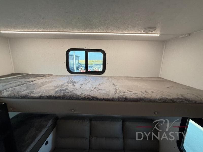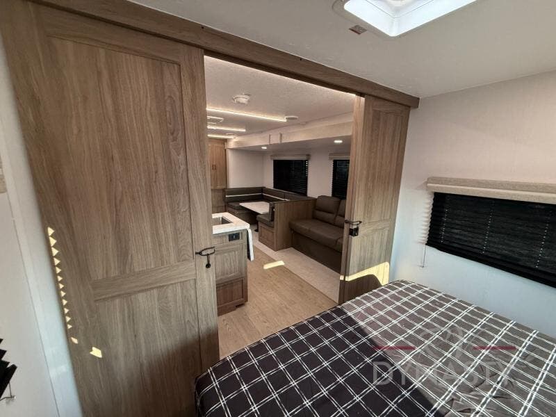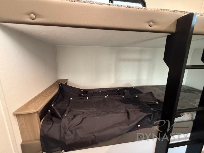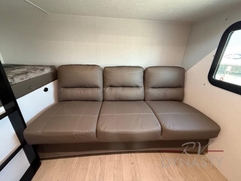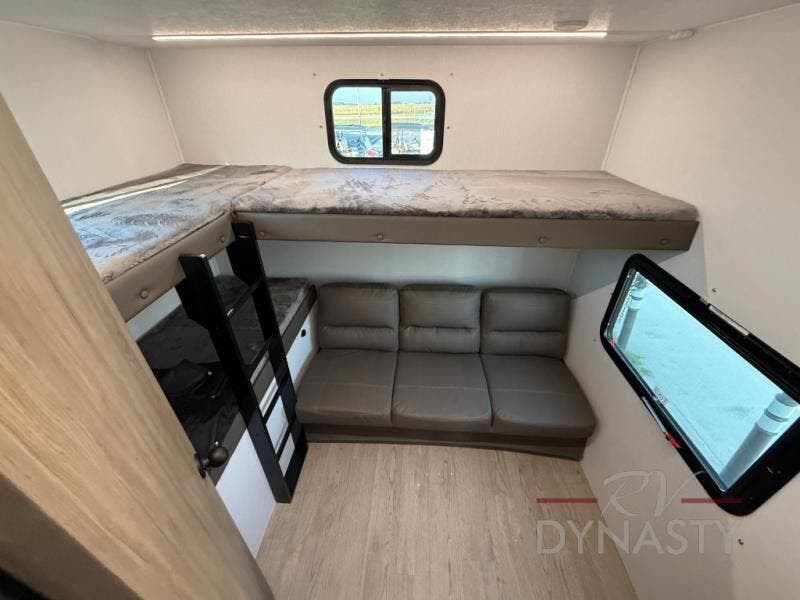 As you step into this trailer, you'll find the main bedroom at the front, featuring a spacious 60" x 80" queen bed with a wardrobe on each side for your clothes and essentials. At the center, the living area offers a large slide-out that holds a roomy U-shaped dinette perfect for meals or game nights beside it a comfortable sofa for extra seating. Opposite the slide, the L-shaped kitchen comes fully equipped with a 10-cu. ft. refrigerator, Magic Chef microwave and gas cooktop, plus a flip-up countertop for added prep space. Toward the rear, a full bathroom includes a large shower and generous counter space, and at the very back, the bunkhouse provides sleeping room for up to five, features a double bunk, bunk above sofa and trundle mat, making it easy to bring the whole crew along for the adventure.
