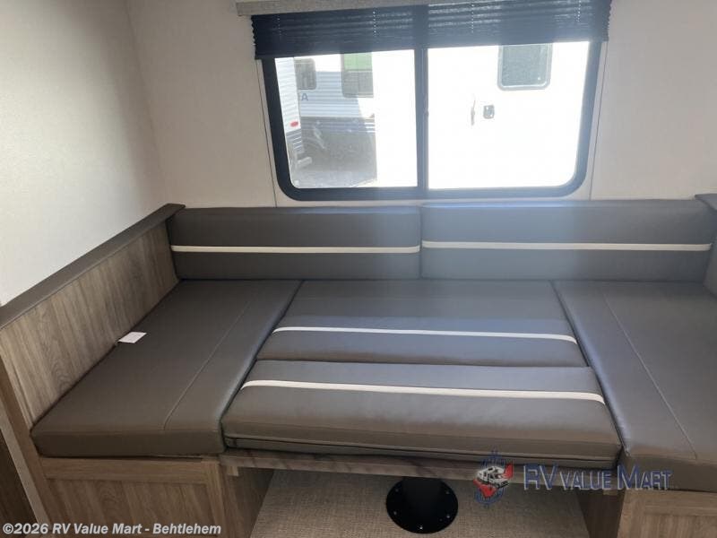 As you step into this trailer, you'll find the main bedroom at the front, featuring a spacious 60" x 80" queen bed with a wardrobe on each side for your clothes and essentials. At the center, the living area offers a large slide-out that holds a roomy U-shaped dinette perfect for meals or game nights beside it a comfortable sofa for extra seating. Opposite the slide, the L-shaped kitchen comes fully equipped with a 10-cu. ft. refrigerator, Magic Chef microwave and gas cooktop, plus a flip-up countertop for added prep space. Toward the rear, a full bathroom includes a large shower and generous counter space, and at the very back, the bunkhouse provides sleeping room for up to five, features a double bunk, bunk above sofa and trundle mat, making it easy to bring the whole crew along for the adventure.