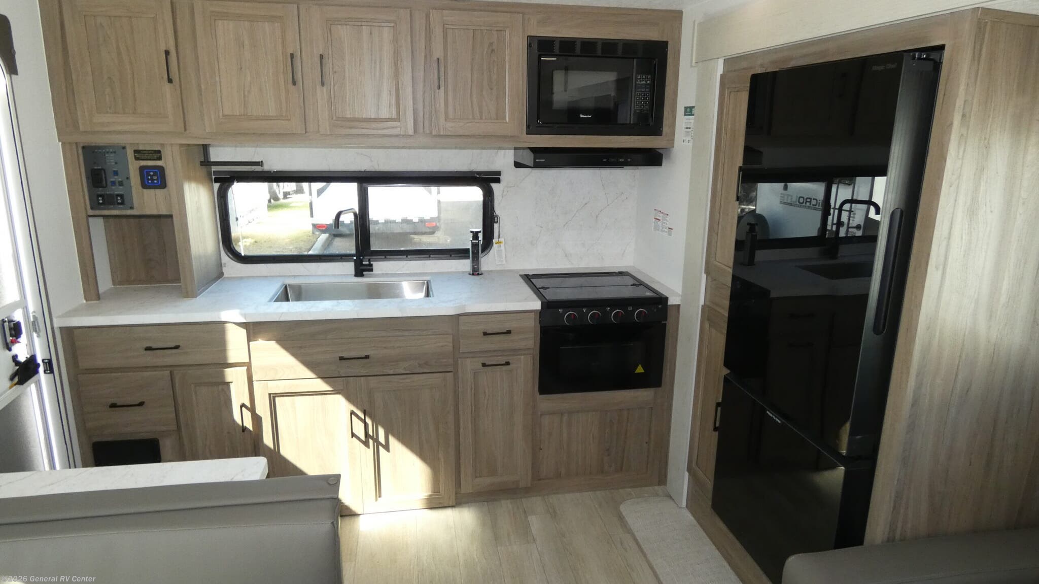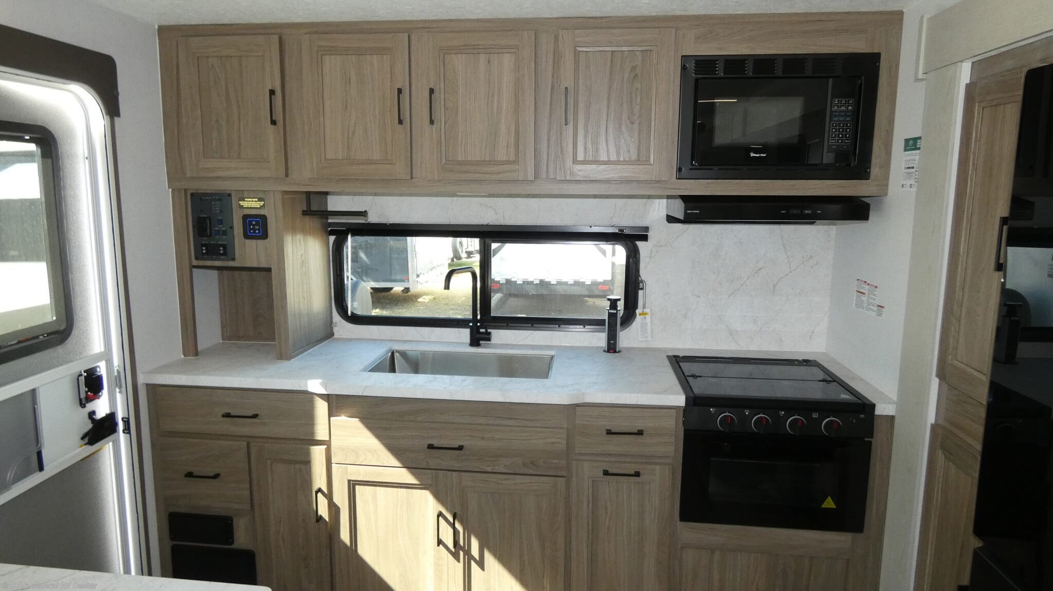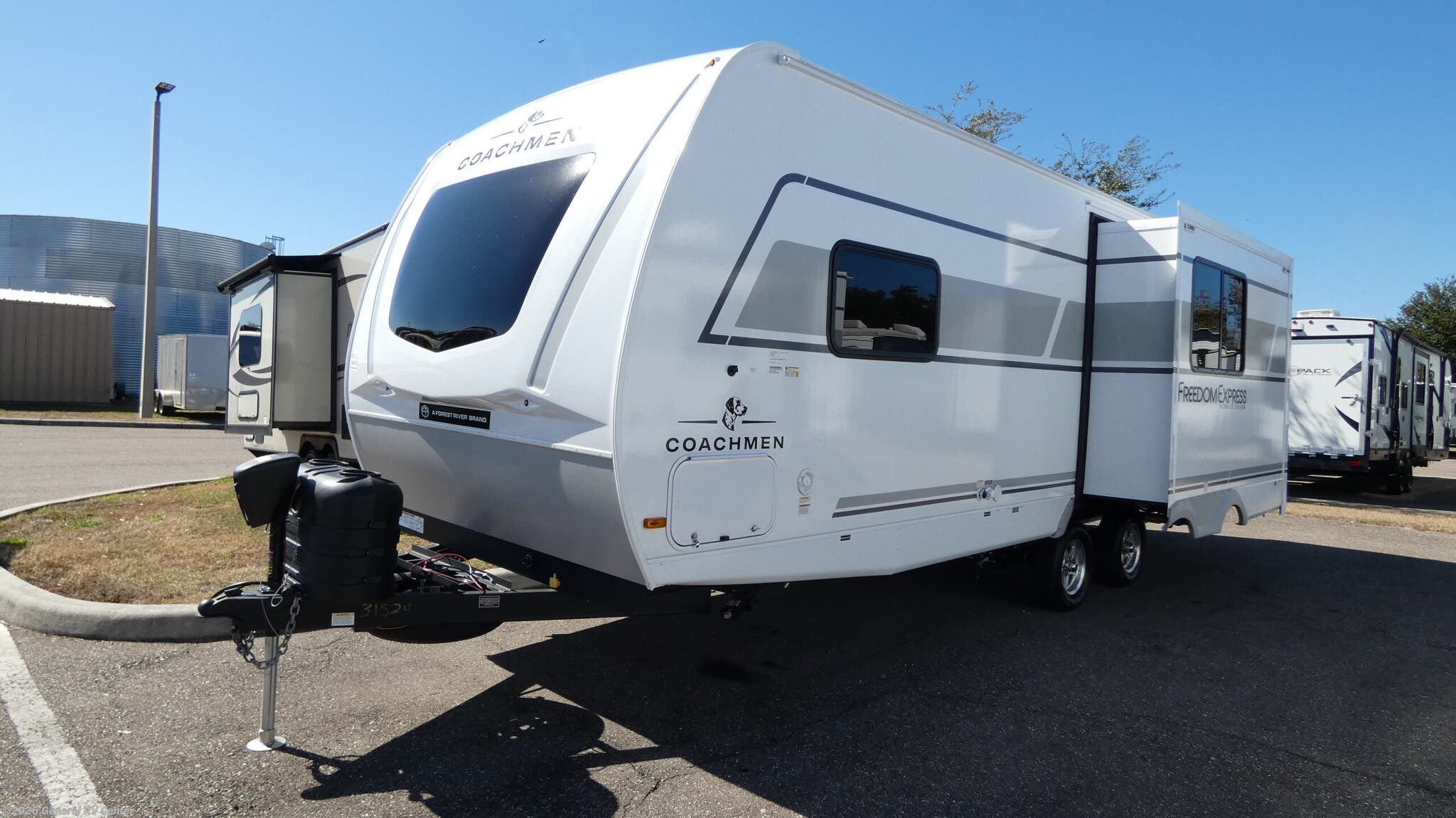 **Coachmen Freedom Express Ultra Lite travel trailer 245RKS highlights:** * Three Burner Cooktop * Large Slide Out * Walk-Thru Bath * Theater Seating * Vaulted Underbed Storage Check out this rear kitchen travel trailer that can sleep three to four each night. The front master bedroom includes a queen bed with vaulted under-bed storage for your belongings and dual wardrobes for even more storage. The theater seating within the large slide out and the booth dinette will provide comfortable seating space, and there is a Smart TV for those rainy camp days. This model also includes a three burner cooktop, a microwave oven, and an 10 cu. ft. double door refrigerator for your perishables. And don't forget about the power awning with LED lights! With any Freedom Express Ultra Lite travel trailer by Coachmen you will appreciate quality construction materials, such as vacuum bonded walls with Azdel composite, a 3/4 gel coated fiberglass cap with an automotive glass windshield, and a heated enclosed underbelly. Each model also features Tufflex PVC roofing, front rock guard, and E-Z Lube axles for smooth towing. Inside, you'll find kitchen backsplash, hidden hinge cabinetry, and wear-resistant vinyl flooring throughout. The power tongue jack included with the Ultra Lite Express Package will make set-up a breeze, and each model includes back-up camera prep and they are Freedom solar ready if you plan to go off-grid. Enjoy lightweight camping with a Freedom Express Ultra Lite travel trailer today!