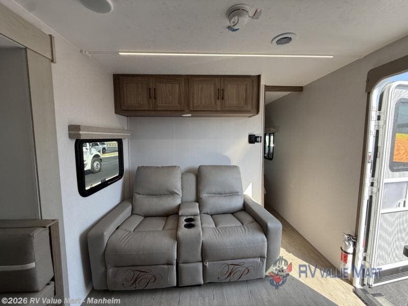 This travel trailer will feel just like home with its private bedroom and spacious full rear bath. You will appreciate the vaulted under-bed storage for extra blankets, shoes, and luggage, plus there are dual wardrobes on either side of the bed for your book and glasses. Get comfortable in the main living area on the sofa or at the booth dinette, or you can choose the optional theater seat or optional hide-a-bed sofa in place of the standard sofa. The chef of your group can prepare meals indoors or outdoors on the full camp kitchen, and check out the large 20' power awning with LED lights that will provide protection from the elements.