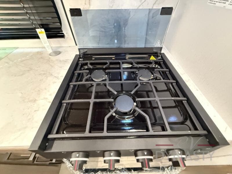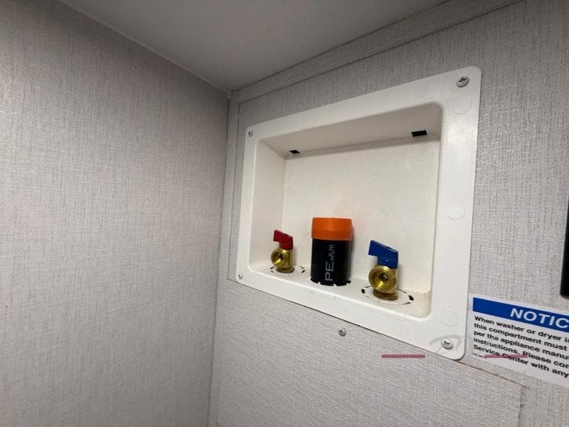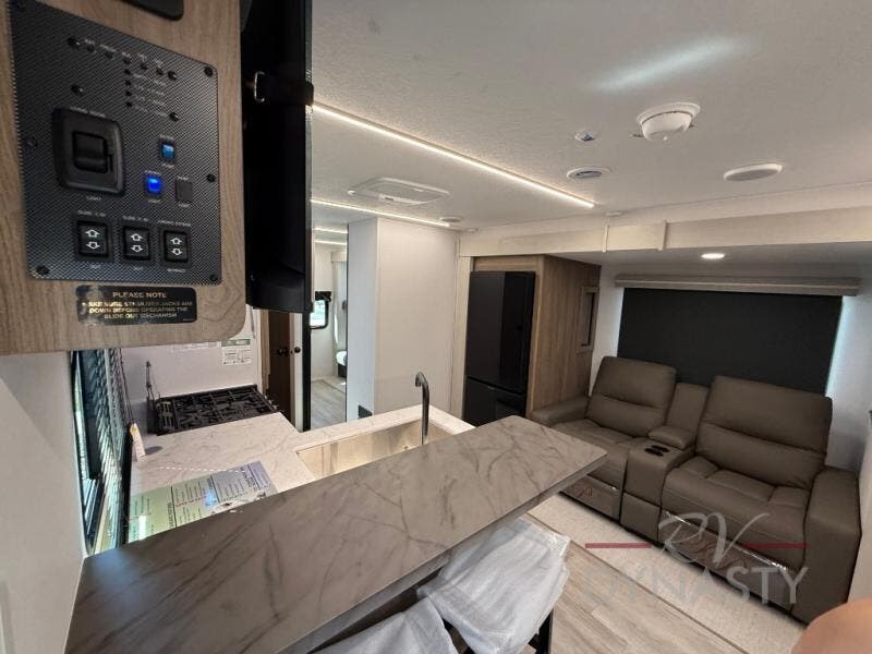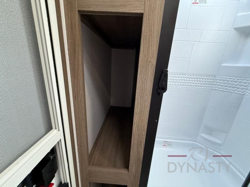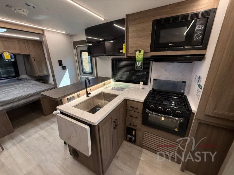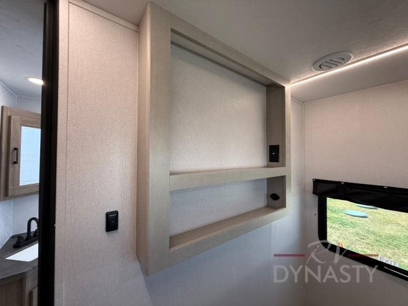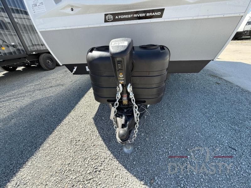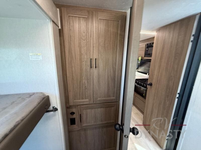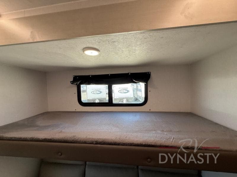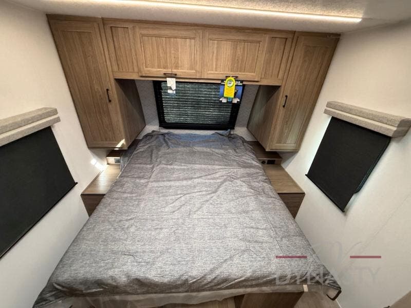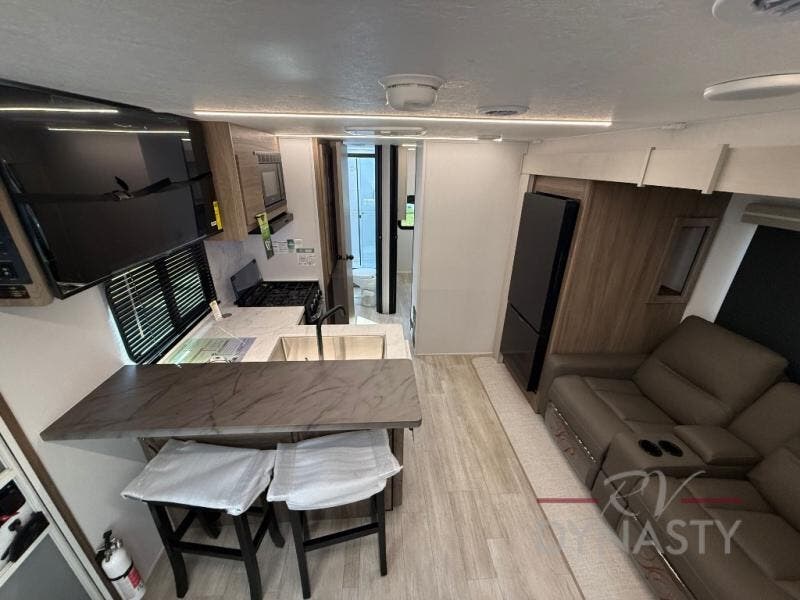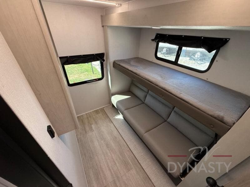 You will love camping in this spacious travel trailer! The rear bunkhouse offers a flexible space with bunks plus a sofa underneath. A rear corner bath will help for an everyday fresh start. At the front you will enjoy privacy in the queen bedroom, which has dual wardrobes and overhead storage for easy organization. Everyone will want to gather in the living area with a theater seat and why not crack a cold one conveniently stored next to you in the 12V refrigerator. The kitchen is well-equipped and will have plenty of room for entertaining and cooking with its bar top and flip-up countertop. There's an outdoor griddle as well if you'd prefer to cook outside.