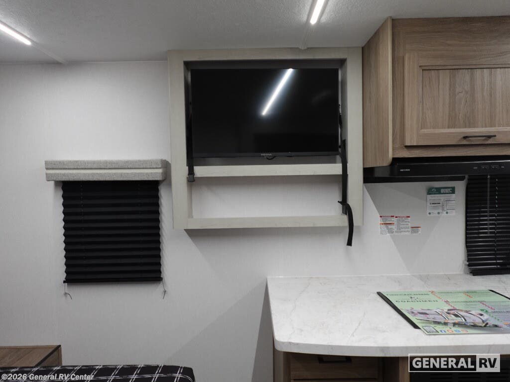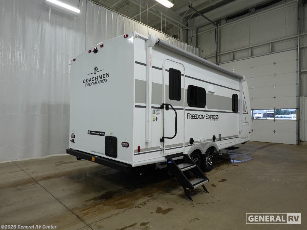 Experience the perfect blend of comfort and versatility with the 2026 Coachmen Freedom Express Select 19SE. This compact yet spacious travel trailer is designed for those who crave adventure without sacrificing the comforts of home. With a length of just over 22 feet, it's easily maneuverable while still offering ample living space. The center kitchen is equipped with a three-burner cooktop and a full-size electric refrigerator, making meal preparation a breeze. The free-standing table and sofa provide a cozy dining and relaxation area, easily converting to additional sleeping space when needed. Retreat to the inviting rear bath, complete with a practical shower and plenty of storage. The front of the trailer features a luxurious queen bed, offering under-bed storage and surrounded by wardrobes for all your essentials. Enjoy the outdoors under the 14-foot powered retractable awning, perfect for al fresco dining or simply soaking up the scenery. With a generous cargo capacity and pass-through storage, this RV is ready for any adventure you can dream up. For more information or to see this model in person, visit your nearest General RV dealership.