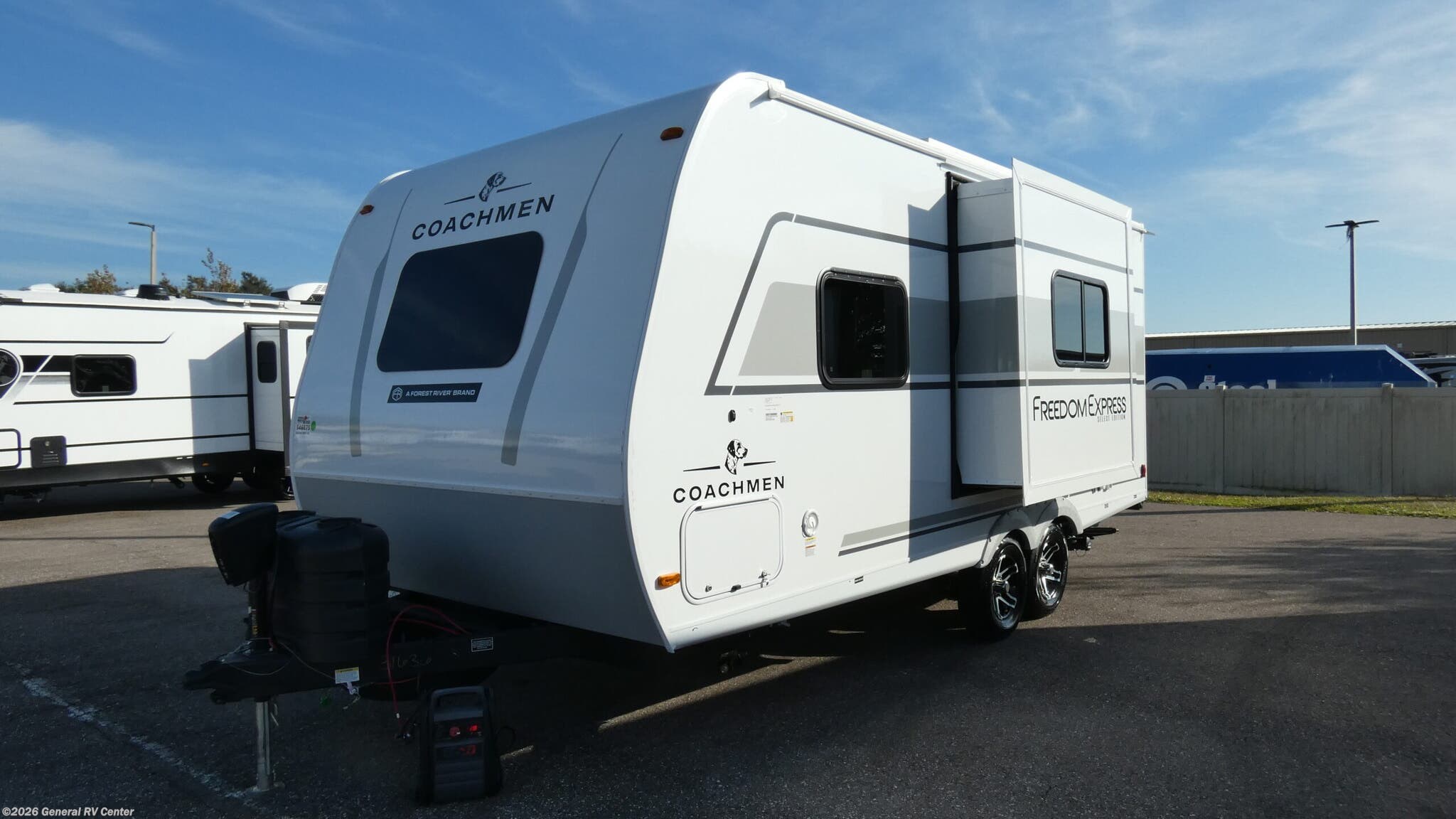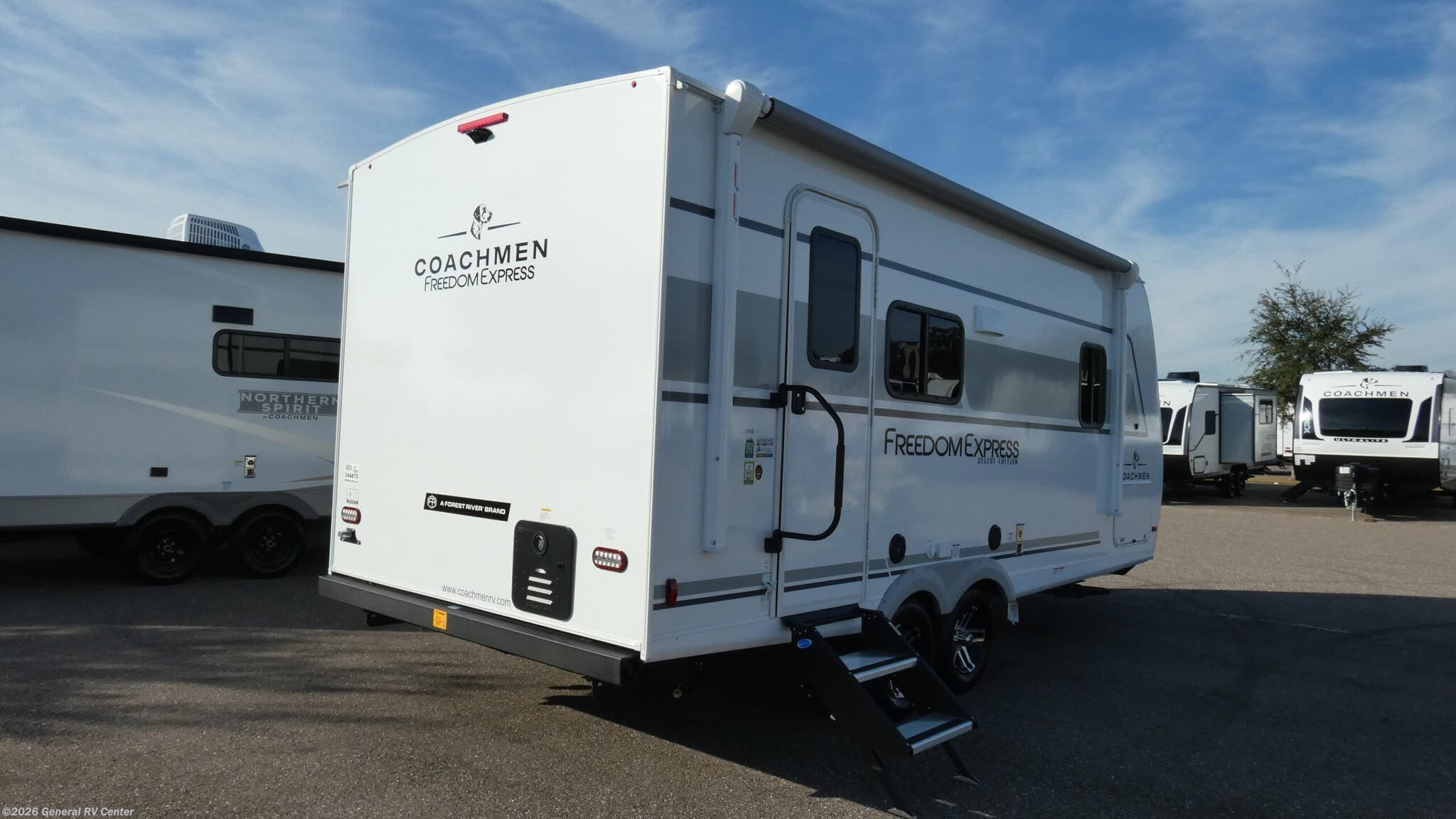 Experience the perfect blend of comfort and versatility with the 2026 Coachmen Freedom Express Select 19SE. This compact yet spacious travel trailer is designed for those who crave adventure without sacrificing the comforts of home. With a length of just over 22 feet, it's easily maneuverable while still offering ample living space. The center kitchen is equipped with a three-burner cooktop and a full-size electric refrigerator, making meal preparation a breeze. The free-standing table and sofa provide a cozy dining and relaxation area, easily converting to additional sleeping space when needed. Retreat to the inviting rear bath, complete with a practical shower and plenty of storage. The front of the trailer features a luxurious queen bed, offering under-bed storage and surrounded by wardrobes for all your essentials. Enjoy the outdoors under the 14-foot powered retractable awning, perfect for al fresco dining or simply soaking up the scenery. With a generous cargo capacity and pass-through storage, this RV is ready for any adventure you can dream up. For more information or to see this model in person, visit your nearest General RV dealership.
