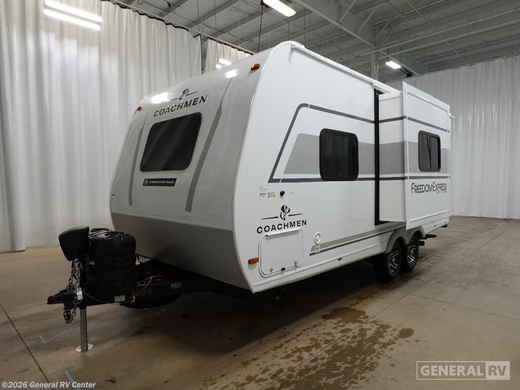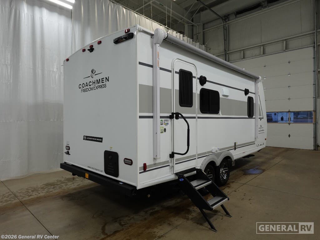 Experience the perfect blend of comfort and versatility with the 2026 Coachmen Freedom Express Select 19SE. This compact yet spacious travel trailer is designed for those who crave adventure without sacrificing the comforts of home. With a length of just over 22 feet, it's easily maneuverable while still offering ample living space. The center kitchen is equipped with a three-burner cooktop and a full-size electric refrigerator, making meal preparation a breeze. The free-standing table and sofa provide a cozy dining and relaxation area, easily converting to additional sleeping space when needed. Retreat to the inviting rear bath, complete with a practical shower and plenty of storage. The front of the trailer features a luxurious queen bed, offering under-bed storage and surrounded by wardrobes for all your essentials. Enjoy the outdoors under the 14-foot powered retractable awning, perfect for al fresco dining or simply soaking up the scenery. With a generous cargo capacity and pass-through storage, this RV is ready for any adventure you can dream up. For more information or to see this model in person, visit your nearest General RV dealership.