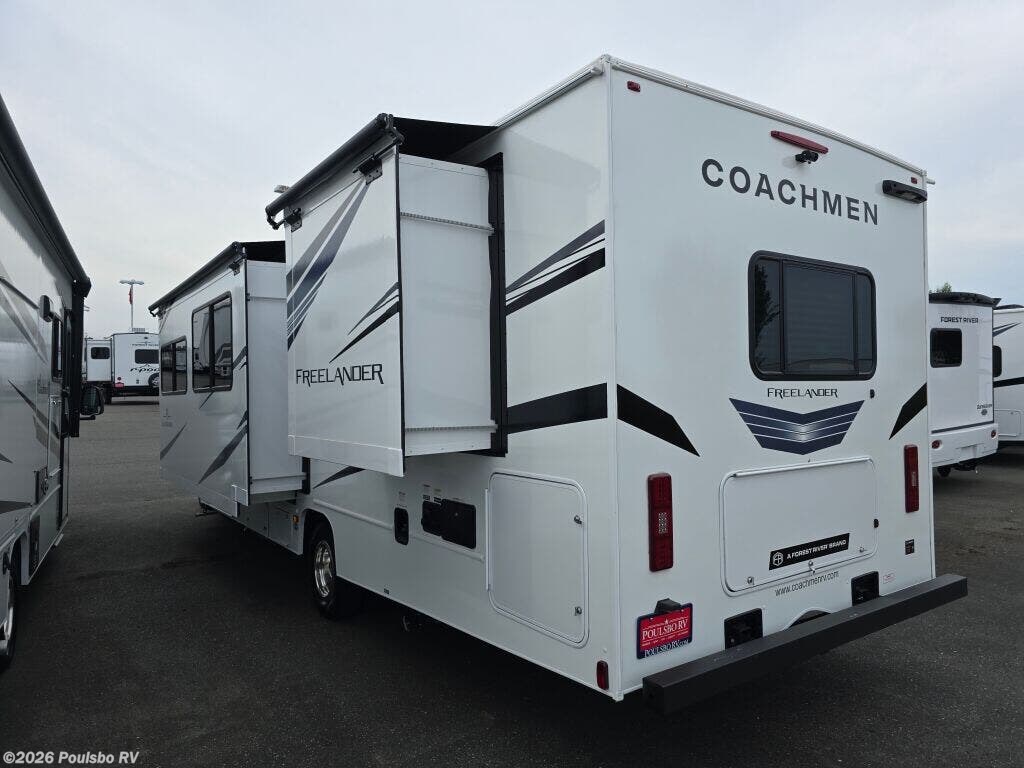 Embark on an unforgettable adventure with the 2026 Coachmen Freelander 31MB, a stunning Class C motorhome designed to elevate your RVing experience. This remarkable vehicle measures an impressive 32.81 feet in length, offering an expansive living area that encourages both relaxation and social enjoyment on your travels. Built for exploration, this brand-new model features a GVWR of 14500 pounds and a towing capacity of 7500 pounds, making it versatile enough to accommodate all your gear and necessities for those long road trips. The Freelander 31MB is perfect for families and friends, comfortably sleeping up to 8 people, ensuring everyone has a cozy spot to unwind after a day of adventure. With two thoughtfully designed slide-outs, the living space is opened up, enhancing the overall comfort and allowing for a spacious atmosphere that feels like home. Additionally, the front and rear power leveling jacks simplify the process of setting up camp, enabling you to enjoy your time outdoors without hassle. The single awning provides a charming shaded retreat where you can savor warm evenings under the stars. Inside, the interior is equipped with features that prioritize comfort, making every journey memorable. As a family-owned, award-winning local RV dealer with multiple locations in Sumner, Everett, Kent, and Mt. Vernon Washington, Poulsbo RV is dedicated to helping you find your perfect RV. Stock#: M3659, VIN: 1FDXE4FN7SDD35662.