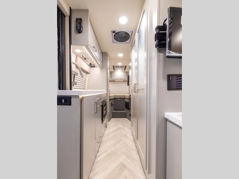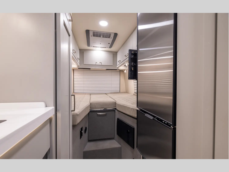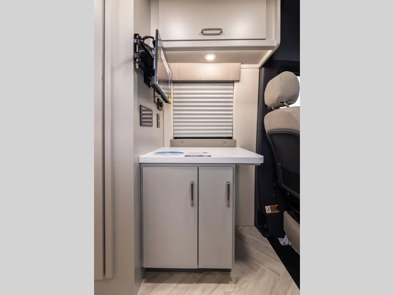 Traveling is made easy in this motorhome! If you need to get some work done while you're away then you will appreciate the desk with overhead cabinets but you can switch it out for an optional mid chair or an optional jump seat/pull-out sofa to convert into a junior sleeping area. After a long day of traveling, you can freshen up in the wet bath with a sink and shower that has an Oxygenics Fury handheld shower head with on/off, plus the shower miser water saver prevents unnecessary water waste. The rear fixed bed has power incline and storage underneath it to secure your gear. Keep your bellies full with the single burner cooktop, the Nova Kool 7300 refrigerator with pull-out freezer drawer, and a closet/pantry for snacks. You will also appreciate the reading lights with individual switches and USB ports to charge your electronics as you read at night! Available with an optional AWD chassis.