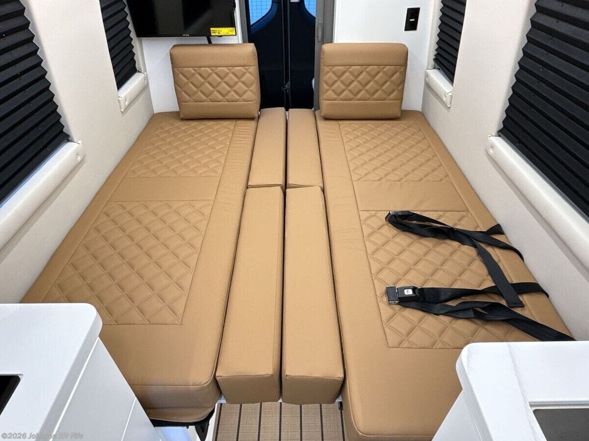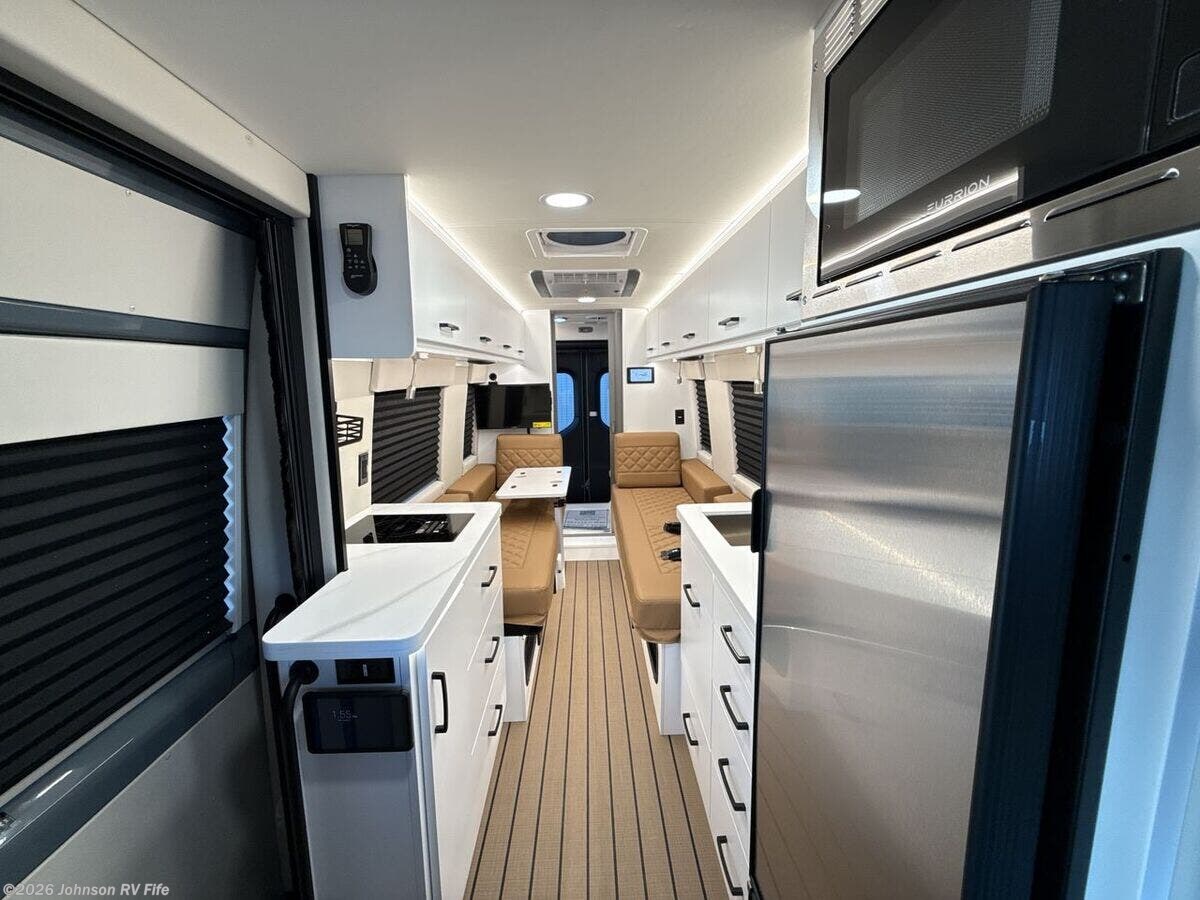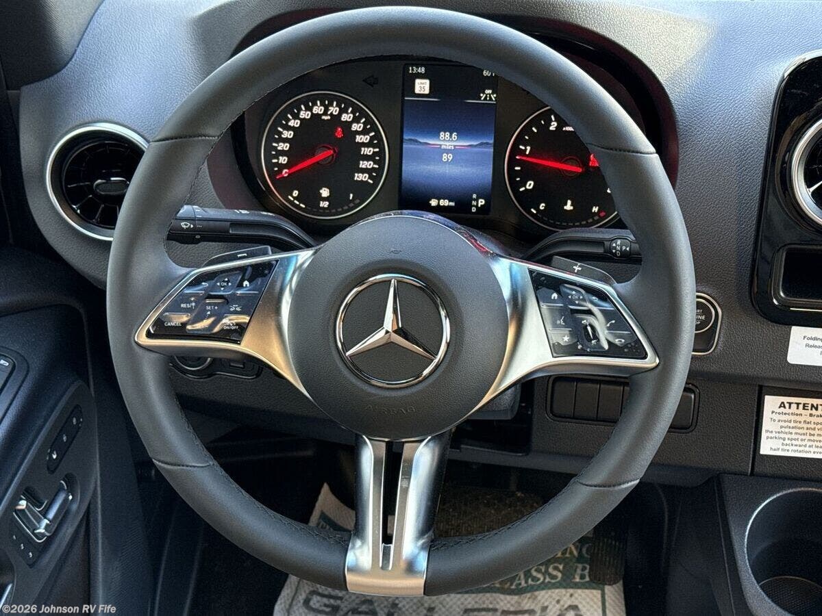 Explore the future of RV living with the 2026 Coachmen Galleria 24RB, a luxury Class B motorhome designed for ultimate comfort and advanced travel technology. Built on a robust Mercedes-Benz 3500 EXT Chassis, this new RV is equipped with innovative features to ensure a smooth driving experience and a comfortable lifestyle on the road. Chassis & Performance: - Mercedes-Benz 2.0L Turbo I4 Diesel engine - 9-speed automatic transmission - Electronic Stability Program for improved handling - Sumo Springs Suspension (2x4) - Xenon headlamps and fog lamps - 5000# receiver with a 7-pin plug for towing Cab Features: - Heated front swivel seats with embroidered detailing - Heated side-view mirrors for enhanced visibility - Smart steering wheel controls integrated with the MBUX navigation system - Apple CarPlay and Android Auto compatibility - Advanced safety features including front and side airbags, a backup camera, blind-spot monitor, lane assist sensor, and collision avoidance indicator Interior Living Spaces: - Ambient undercarriage lighting - Durable PVC vinyl texture wall covering - MaxxAir fan equipped with rain sensor and remote control Dining & Kitchen: - Custom high gloss hardwood cabinetry - Motion sensor lighting in overhead cabinets - Solid surface countertops complemented by a high-rise faucet - Nova Kool 7300 refrigerator and a pull-out freezer drawer - Soft-close drawers with positive catch mechanisms Electronics & Connectivity: - Garmin MultiPlex touchscreen system with rear multiplex handheld control - Remote access via Eclipse app - Sure Level tank sensors for monitoring tank levels - King Olympus digital antenna and WiFi booster - 24-inch LED smart TV with satellite and cable TV hookups - Multiple USB charging ports Sleeping & Comfort: - Power true lay-flat memory foam sofa - Overhead reading lights with built-in USB outlets and cup holders - Dedicated C-PAP outlet to accommodate medical equipment Bathroom: - Shower Miser water saver system - Oxygenics Fury shower head for a spa-like experience Mechanical & Utility: - 330Ah AGM battery with a 2000W Victron Pure Sine Wave inverter - Equipped with three 110W solar panels for a total of 330W - Onan QG 2500 LP quiet generator with auto-start feature - 30-amp smart plug service cord - Truma Combi Eco Plus heating system and Truma Aventa 13.5k AC with dehumidifier - Comprehensive water and utility management center with a 360 siphon black tank vent and black tank flush Coach Build: - Insulation features including rock and steel-based insulation, R38 floor reflective heat barrier, and upgraded R15 insulation for optimal thermal efficiency. Experience unsurpassed comfort and state-of-the-art features with the 2026 Coachmen Galleria 24RB, the perfect companion for intuitive and luxurious travel.