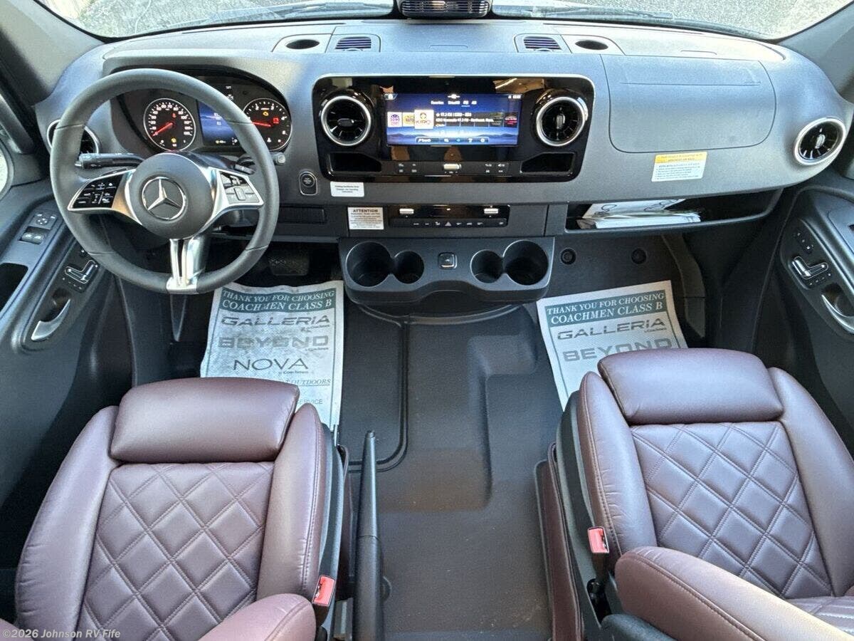 Introducing the 2026 Coachmen Galleria 24RB, a luxurious and innovative Class B RV built on the reliable Mercedes-Benz 3500 EXT chassis. This cutting-edge RV is designed for those who value comfort, technology, and adventure, making it ideal for both short getaways and extended road trips. **Power and Performance:** - Mercedes-Benz 2.0L Turbo I4 Diesel engine - 9-speed automatic transmission - Electronic Stability Program for enhanced handling - Sumo Springs Suspension (2x4) for a smooth ride - Xenon headlamps and fog lamps for superior visibility - Black painted steel OEM wheels, adding a sleek look - 5000# receiver with 7-pin plug, ready for towing **Cab Features:** - Embroidered heated front swivel seats for comfort - Heated side-view mirrors for cold-weather convenience - Smart steering wheel controls for easy operation - MBUX navigation and voice control for seamless journeys - Apple CarPlay and Android Auto integration - Safety features include front and side airbags, backup camera, blind spot monitor, lane assist sensor, collision avoidance indicator, high-beam assist, and head lamp washer **Living Spaces:** - Undercarriage lighting for ambient evening illumination - Durable PVC vinyl texture wall covering - MaxxAir fan with rain sensor and remote for optimal airflow **Dining Area:** - Custom high gloss hardwood cabinetry with motion sensor overhead lights - Positive catch soft close drawers and doors - Solid surface countertops with a drying rack and sink cover - High-rise faucet and Nova Kool 7300 refrigerator - Pull-out freezer drawer for additional storage (24A 24FL models) **Electronics and Connectivity:** - Garmin multiplex touchscreens with rear multiplex screen removable handheld - Remote access Eclipse app for easy control - Sure Level tank sensors for monitoring water levels - King Olympus digital antenna, WiFi booster, and cell booster prep - Satellite and cable TV hookups - Multiple USB charge ports and a 24-inch LED Smart TV **Sleeping Accommodations:** - Power true lay flat memory foam sofa for a restful sleep - Overhead reading lights and USB outlets - Dedicated C-PAP outlet for convenience **Bathroom Comforts:** - Shower Miser water saver to conserve resources - Oxygenics Fury shower head for a spa-like experience **Mechanicals and Utilities:** - 330Ah AGM battery with 2000w Victron pure sine wave inverter - Three 110w solar panels, totaling 330w for off-grid power - Onan QG 2500 LP quiet generator with auto start - 30-amp smart plug service cord - Truma Combi Eco Plus heat and Truma Aventa 13.5k AC dehumidifier - Water and utility management center with a 360 siphon black tank vent and black tank flush **Coach Build:** - Rock and steel-based insulation for optimum temperature control - R38 floor reflective heat barrier and upgrade R15 insulation to enhance energy efficiency The 2026 Coachmen Galleria 24RB combines elegance and practicality, ensuring you have all the comforts of home while exploring the great outdoors. ??? Whether you're traveling on the open highway or settling into a serene campsite, this RV will be your perfect companion for all your adventures.