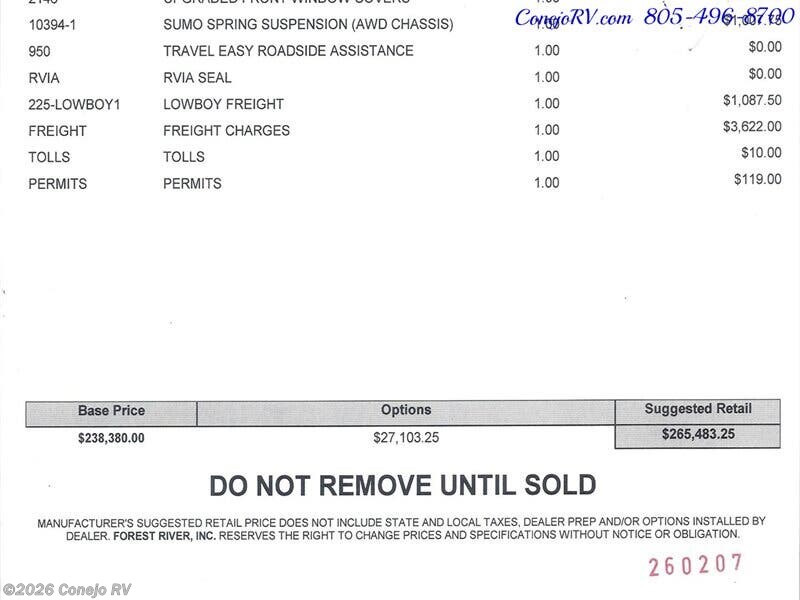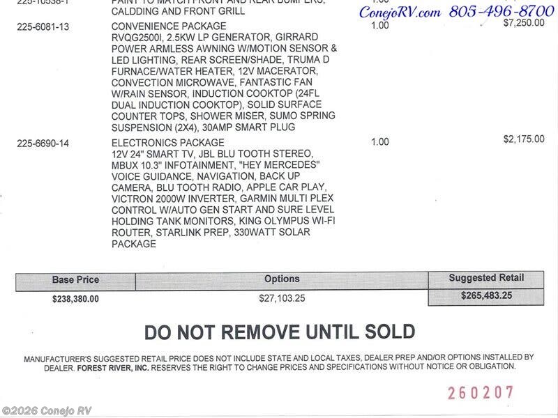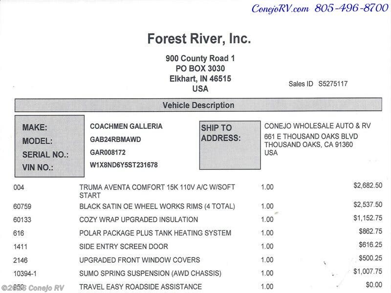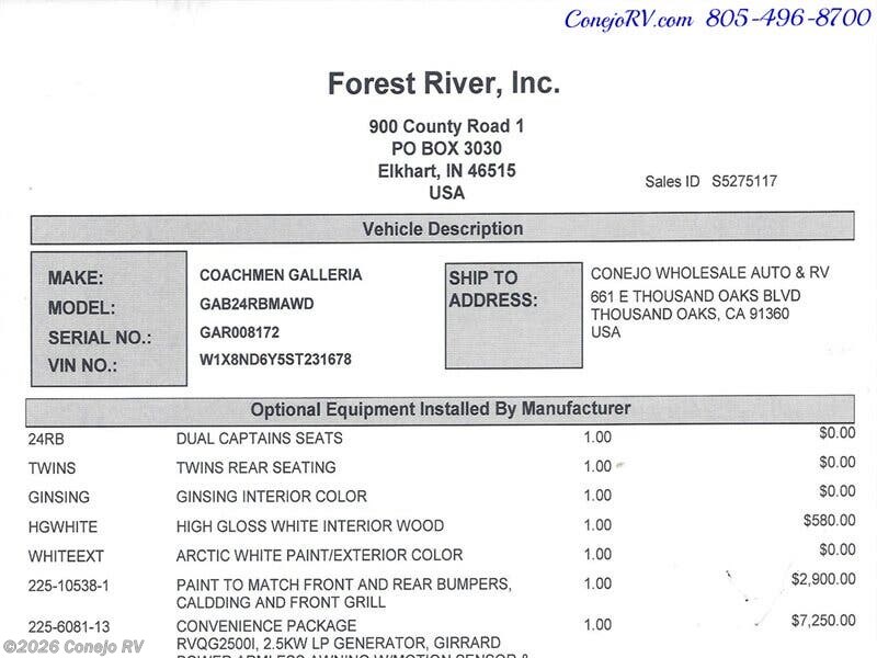 2026 Coachmen Galleria 24RB AWD Convertible Twin Beds Mercedes Turbo Diesel Sprinter ***MSRP is 265,483 Our Price Only 174,990*** Mercedes 2.0L Turbo I4 Diesel, 9-Speed Automatic Transmission, ALL WHEEL DRIVE, Blind Spot Monitoring/Lane Assist Sensor, Electronic Stability Program, Collision Avoidance Indicator, High Beam Assist, Heated Front Swivel Seats, Multi-Function Steering Wheel, Convertible Rear Twin Beds, Dual Position Lagun Dining Table, Bedroom Area LG Flatscreen TV, Jensen DVD/CD/AUX/Bluetooth Entertainment Center, Wardrobe, Private Rear Full Bath With Shower, Sink & Porcelain Toilet, Nice Kitchen with Solid Surface Corian Countertop, Induction Cooktop, & Stainless Steel Sink With Matching Counter Top Cover, Spice Rack, Convection Microwave Oven, Refrigerator /Freezer, Tinted Coach Windows, Night Shades Throughout, Truma Tankless Water/Coach Heating System, Garmin Multiplex Touchscreen Master Control Panel, Ultra-Leather Swivel/Recline Captain’s Chairs that Rotate to Function as Coach Seating, Roof and Dash Air, MBUX Touchscreen Multimedia Infotainment Center w/Navigation, Interactive Voice Interface, Apple Car Play, Android Auto, King Olympus Wi-Fi Router, 330W Solar, 2KW Inverter, Onan 2.5KW Generator, Rear Back Up Camera, Power Patio Awning with Integrated Led Lighting, Tow Package, Optional Electronics Package & Convenience Package, Sumo Spring Suspension, Brand New & Just Arrived, Other Models & Custom Orders Available, ***MSRP is $265,483 Our Price Only $174,990*** We Have Some Fantastic Financing and Take Trades Also! It is our #1 Goal That Your Experience With Our Company is an Enjoyable One with Our Staff of Industry Professionals, Conejo Wholesale Auto & RV, Exclusive Ventura County Dealer For Winnebago Navion, Revel, Solis, Ekko, Travato, Porto, Roam, Era, Storyteller Mode, Crew and Hilt, Tiffin GH1, GT1, and Open Trail, Roadtrek, Zion, & Agile and Play, Westfalia, South Bay Pontoon Boats, We Also Carry a Large Selection of Quality Pre-Owned Motorhomes which come with Our 45 Day/1000 Mile In-House Warranty at No Charge, Conejo RV, 661 E. Thousand Oaks Blvd, Thousand Oaks, CA 91360, 805-496-8700, Open 7 Days, 9am to 6pm, All Coaches Fully Inspected, Serviced and Detailed, Come Experience the No Pressure No Haggle Sales Approach at Conejo RV, We Also Buy Clean Late Model Coaches, 1 Year Free Camping Membership Included Ask For Details! (***plus tax & license fees***)