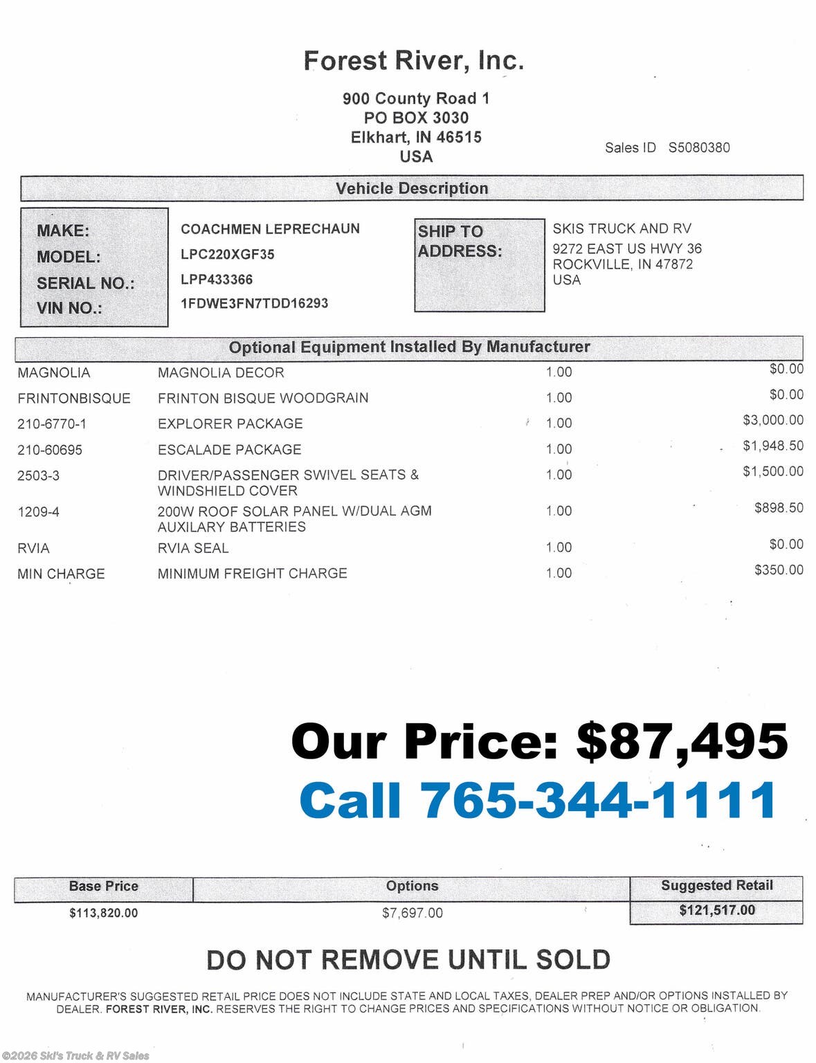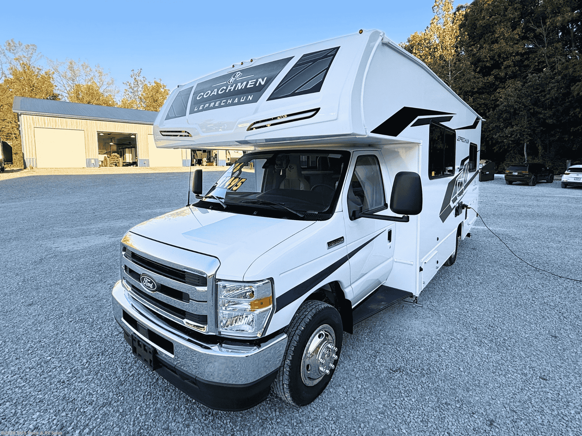 2026 Coachmen Leprechaun 220XG Class C Motor Home; 24 Foot; Sleeps 6; 30 Amp; Ford 7.3L Gas Motor (Ford F-350); Auto Transmission; Driver/Passenger Swivel Seats; LOW MILES: Only 222 Miles; 41 Gal. Fresh Water Cap.; 31 Gal. Black Water Cap.; 28 Gal. Gray Water Cap.; One 68 Lbs. Propane Tank with Outside Port; 15,000 BTU AC w/Heat Pump; 20,000 BTU Furnace; 10.7 C.F. (12V) Refrigerator; Convection Microwave; Airfryer; 3-Burner Stove; Two TV Jacks; 40 In. TV; U Shaped Dinette; Queen (60 x 78 In.) Bed; 57 x 80 In. Bed Over Cab; One Bathroom with Shower/Porcelain Toilet; 15 Foot Power Awning with LED Lights; Backup Camera; Generator (4500W); Solar Package (200W w/30 Amp Converter); Outside Shower; Exterior Storage; Multi-Function Cargo Area (Great for Elect. Bikes/Small Motorcycle); Large ATV Rear Door; 4 Floor Tie-Downs; Battery Disconnect; Black Tank Flush; Magnetic Door Holders; Heated Tanks; Tinted Windows; Pleated Shades; Azdel Sidewalls; Chrome Hub Caps; Spare Tire; One Year Limited Warranty; Financing Available; Great Class C Motor Home for the Price: $87,495. Call Skis Truck & RV Sales at 765-344-1111 or visit us at for more information.
