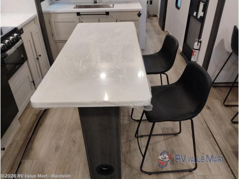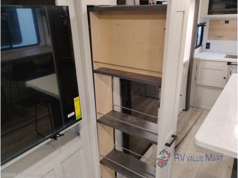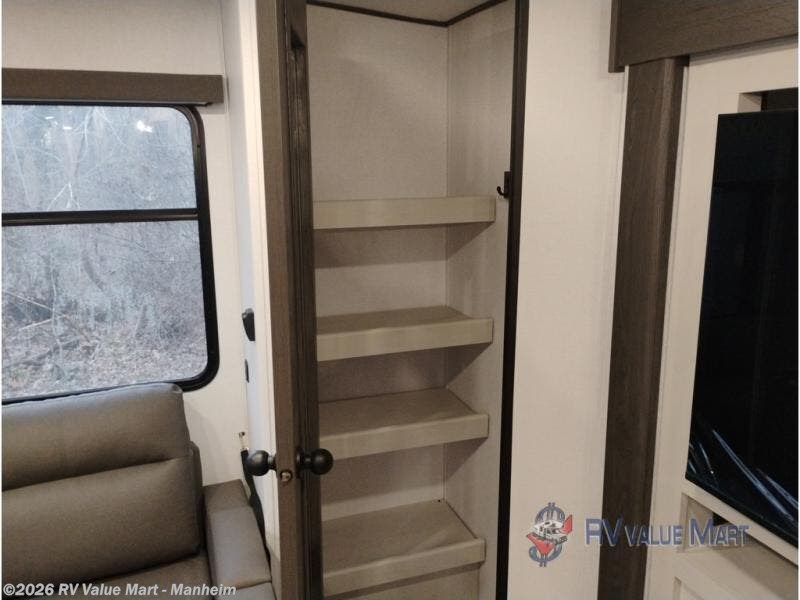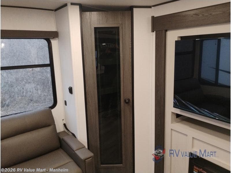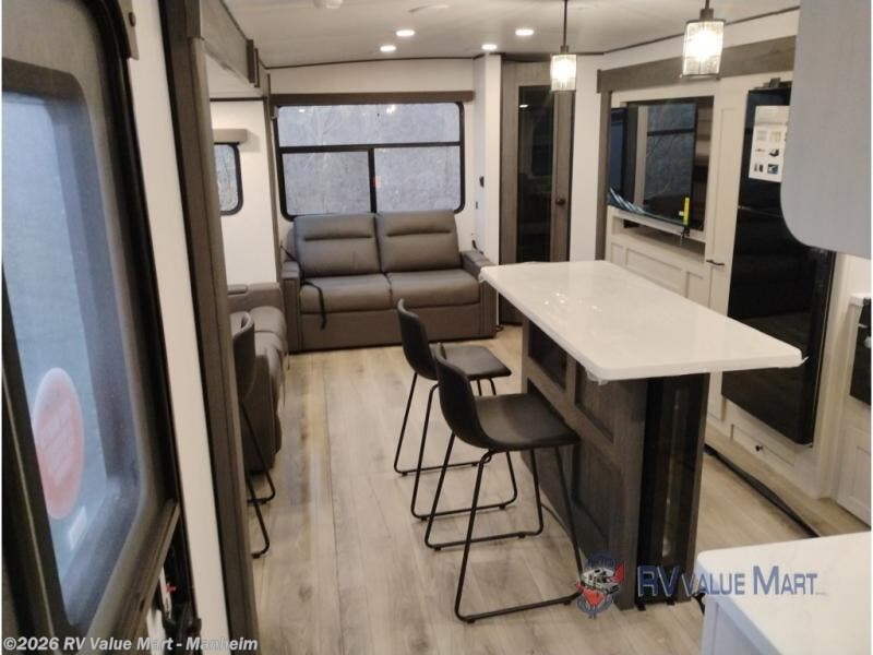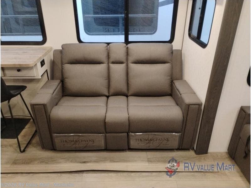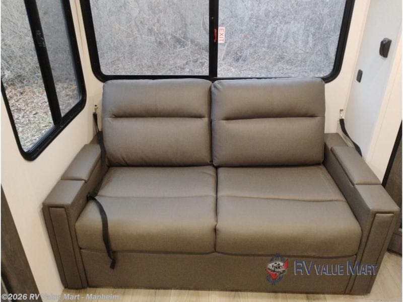 Escape to a world of adventure and relaxation with this incredible travel trailer! The rear living area is a dynamic hub of entertainment, featuring a versatile tri-fold sofa and a premium theater seat that lets you immerse yourself in your favorite shows or movies. The cutting-edge entertainment center provides endless hours of fun. Equipped with top-of-the-line appliances, including a spacious refrigerator, three-burner range, and microwave, the kitchen is a culinary haven. The functional kitchen island provides additional counter space, while the generous walk-in pantry and ample overhead cabinets keep your kitchen essentials organized and within easy reach. The front bedroom is a serene sanctuary, featuring a comfortable queen bed with plenty of storage under it and spacious wardrobes on each side of the bed, ideal for keeping your favorite outfits organized and free of dirt.
