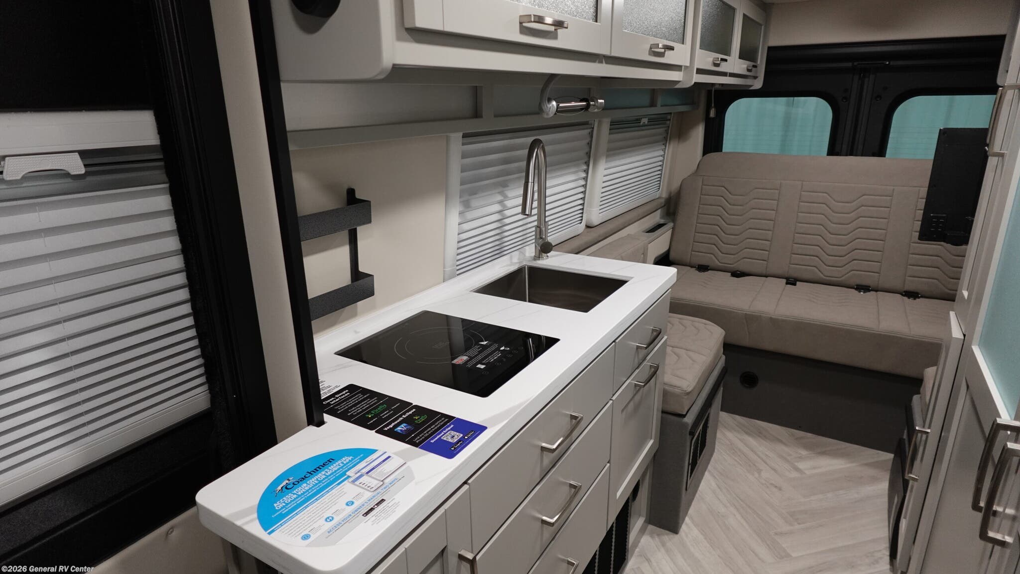 Grab your honey and head to your favorite camping spot in this cozy camper van. Once you park for the day, you can swivel the captain's seats around and enjoy coffee at the swivel table. Lunch can be made on the induction cooktop, and the cold ingredients can go back in the 7.3 cu. ft. refrigerator. The convenient wet bath allows you to freshen up after a hike, and the rear lay-flat power sofa will provide comfortable sleeping space when you're ready to turn in for the night. There are also two jump seats and a swivel table if you want to say up and play a game of cards! Each Nova Class B gas motorhome by Coachmen features Sumo Spring front and rear suspension for a smooth ride. Each unit is built on a Ram ProMaster 3500 chassis, and is powered by a 3.6L V6, 24 valve engine with 280 HP. You will appreciate the innovative Firefly multiplex system, the Sure Level tank sensors, and the 3 Group 31, 115AH AGM batteries for added power, as well as a new 24" LED Smart TV to help keep you entertained on long trips. Inside, you'll find solid hardwood cabinetry, a fiberglass shower verses the competitors ABS shower, a remote control MaxxAir fan with a rain sensor, and many more comforts to make you feel right at home. There is also a Truma Aventa 13,500 BTU A/C with three speeds, a dehumidifier, and night mode to ensure your comfort throughout each trip! An optional Li Lithium Battery System can be added which features a 640 amp-hour lithium battery, a Bluetooth battery management system, a Xantrex XC Pro 3,000W inverter/charger, and more features for off-grid capability!