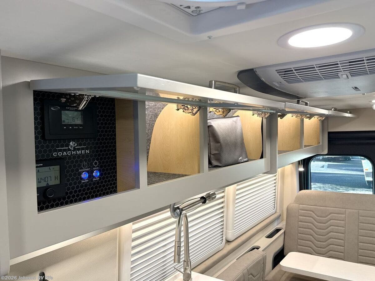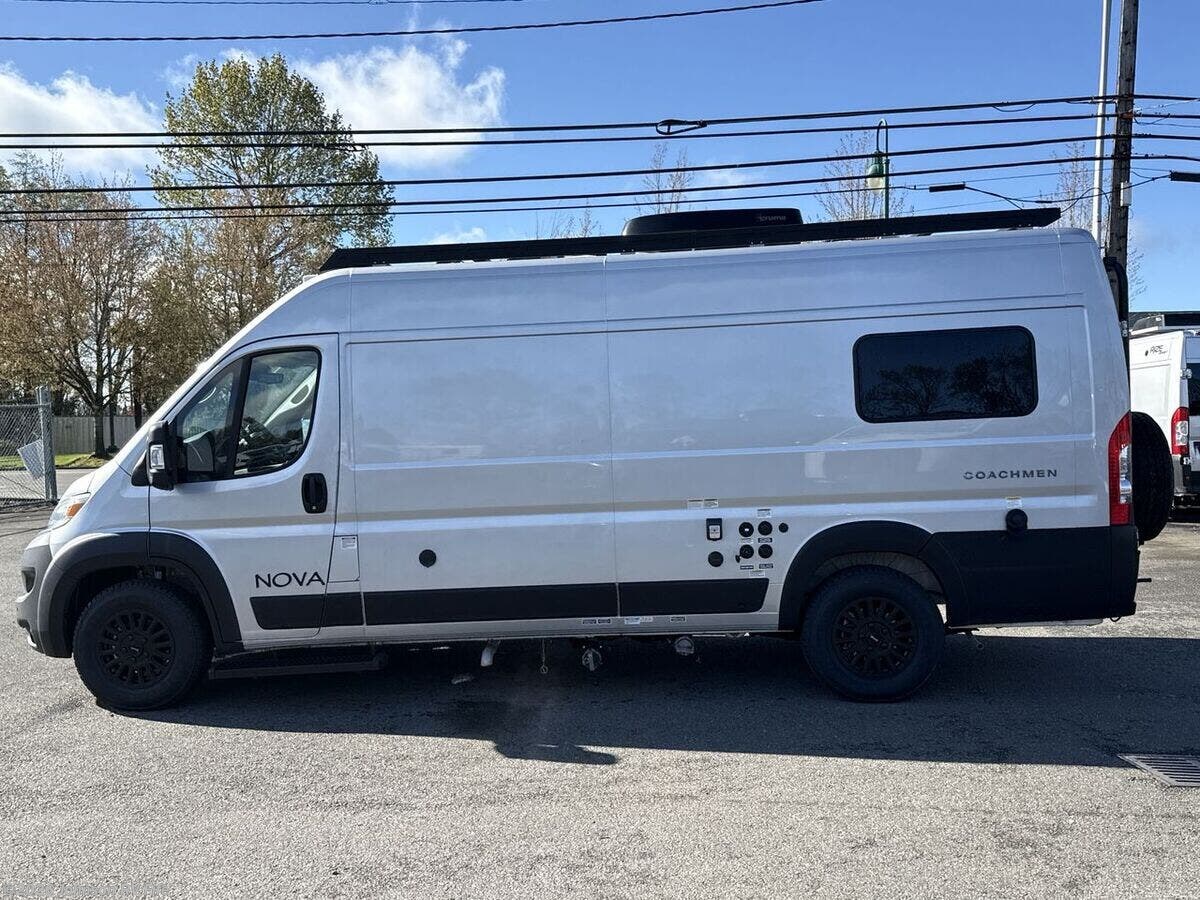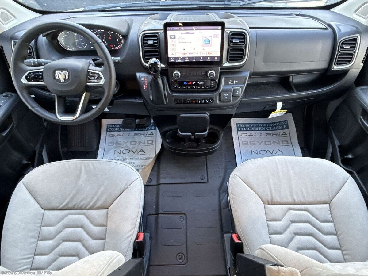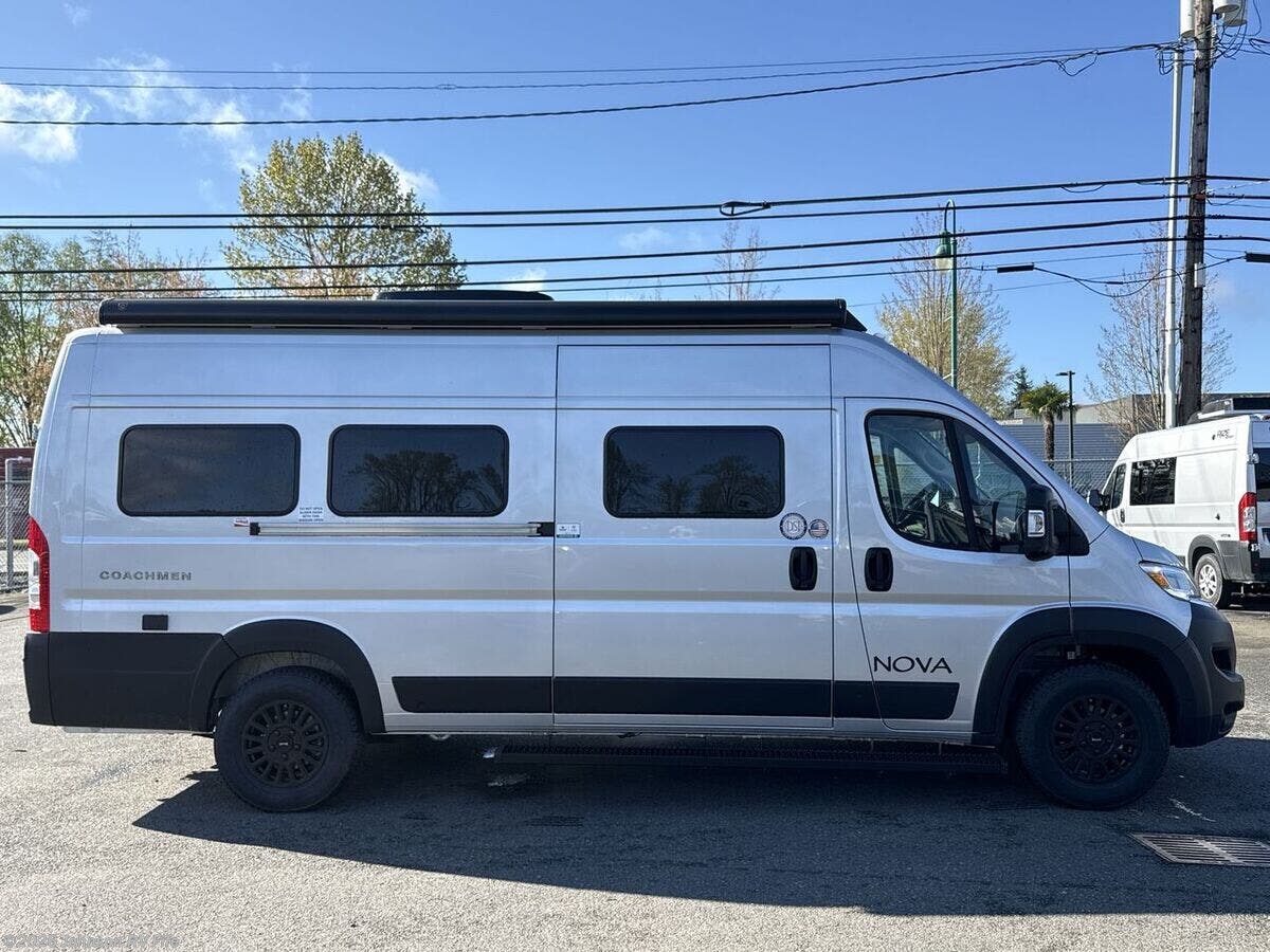 Introducing the 2026 Coachmen Nova, a new and remarkable Class B RV designed for adventure enthusiasts and comfort seekers alike. Built on the robust RAM ProMaster 3500 chassis, this vehicle is powered by a 3.6L V6, 24-valve gas engine delivering 280 horsepower, ensuring a reliable and efficient drive. With an odometer reading of just 22 miles, this RV offers a pristine start to countless journeys. **Exterior and Build:** - Equipped with Sumo Spring front and rear suspension for a smooth ride - 24-gallon fuel tank to support extended travels - Roof rack and ladder for extra storage and convenience - Solar reflective exterior pull-downs for added comfort - R-15 Rockwool insulation for superior climate control **Living Spaces:** - Elegant marine-grade PVC vinyl flooring - European dual-pane acrylic windows for enhanced insulation and noise reduction - High-quality solid hardwood cabinets - MaxxAir fan with rain sensor and remote for optimal ventilation - Front and rear swivel tables, providing flexibility in space usage **Kitchen and Dining:** - Stainless steel undermount sink with a high-rise pullout sprayer faucet - Nova Kool refrigerator to keep your food fresh - Induction cooktop and an air fryer convection microwave (except for the 20RB model) - Contemporary kitchen design for a delightful cooking experience **Technology and Entertainment:** - Firefly multiplex control system for easy management of vehicle functions - Sure Level tank sensors for accurate monitoring - King Olympus digital antenna and WiFi router with cell booster prep to keep you connected - 24-inch LED smart TV mounted on a swing arm bracket for entertainment on the go **Sleeping Arrangements:** - Convertible sofa bed with Q-Foam cushions for comfortable rest - Removable Lagun table to customize your living space - Ample overhead cabinet storage **Bathroom:** - Convenient wet bath with a fiberglass shower and Shower Miser water saver (not available in 20RB) - Features include a shower curtain, overhead light, sink with pullout spray faucet, and a cabinet or folding arm mirror - Toilet facilities designed for ease of use **Mechanical Features:** - 220w solar capability with two 110w solar panels - Three 115Ah AGM batteries providing a total of 345Ah - 30-amp weatherproof LED smart plug and a 2000w Xantrex inverter for reliable power - Auto generator start for added convenience - Efficient Truma Combi Eco Plus and Aventa 13.5k AC with dehumidifier and night modes - Fresh and black tanks positioned above the floor for optimal functionality Experience modern travel with the exhilarating 2026 Coachmen Nova. Perfectly suited for both short escapes and long adventures, it encapsulates the essence of freedom and comfort in an RV. ??