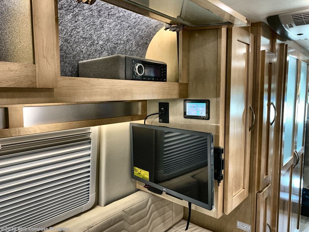 Hit the road and enjoy each journey in this Nova Class B coach. Once you park for the day, you can swivel the captain's seats around and utilize the swivel table. Lunch can be made on the induction cooktop, and the cold ingredients can go back in the 7.3 cu. ft. refrigerator. The convenient wet bath allows you to freshen up after a day exploring, and when you're ready to turn in for the night you can choose from either two 75" x 26" beds, or combine them to create a 75" x 73" bed instead. You will find ample storage in overhead cabinets along each side, beneath the bed, plus there is an extra wardrobe on the roadside as well.