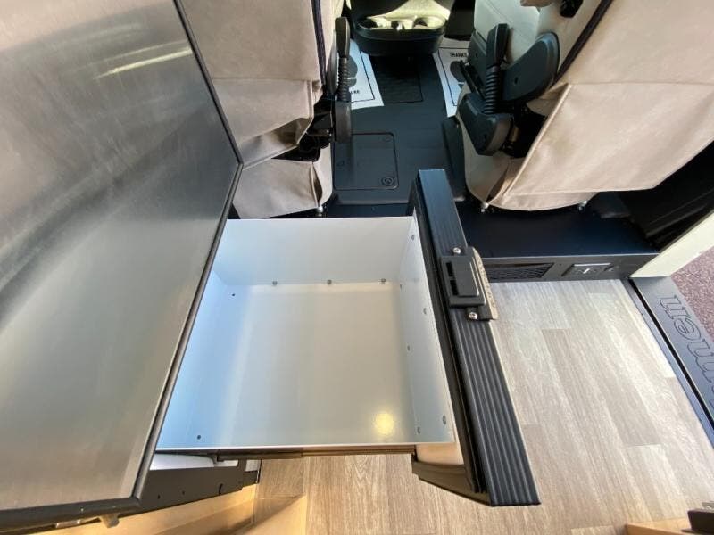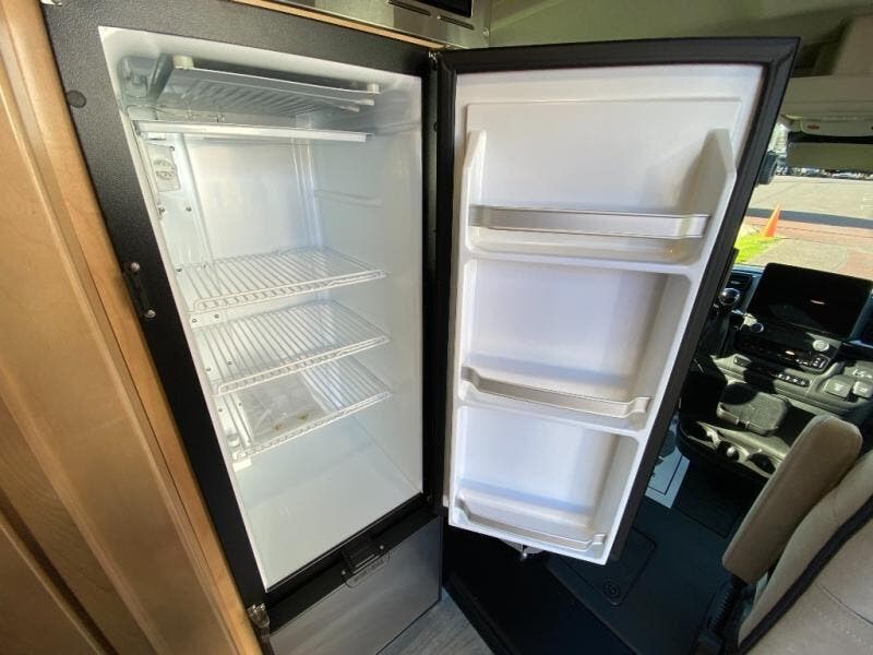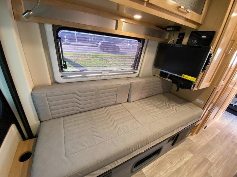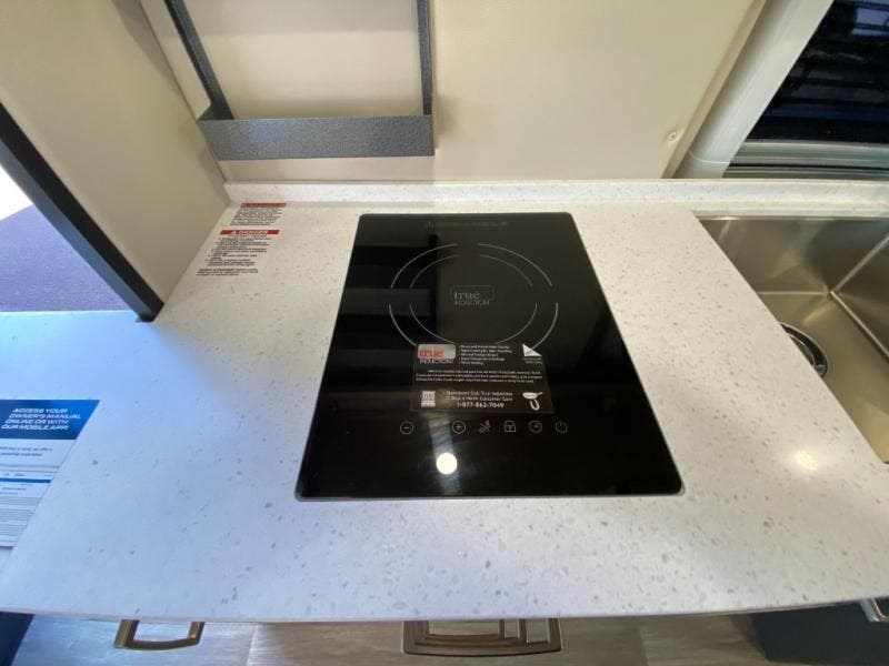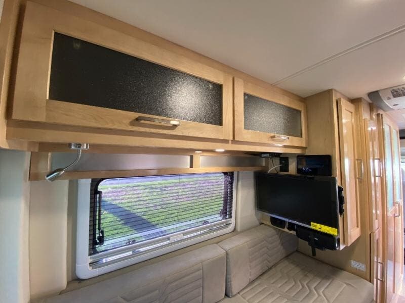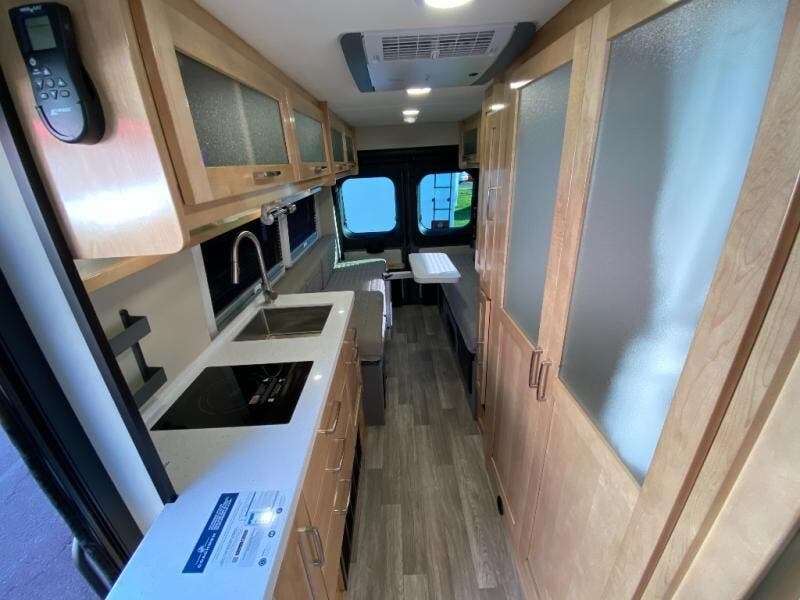 Hit the road and enjoy each journey in this Nova Class B coach. Once you park for the day, you can swivel the captain's seats around and utilize the swivel table. Lunch can be made on the induction cooktop, and the cold ingredients can go back in the 7.3 cu. ft. refrigerator. The convenient wet bath allows you to freshen up after a day exploring, and when you're ready to turn in for the night you can choose from either two 75" x 26" beds, or combine them to create a 75" x 73" bed instead. You will find ample storage in overhead cabinets along each side, beneath the bed, plus there is an extra wardrobe on the roadside as well.