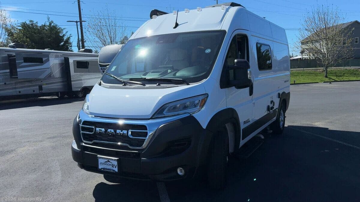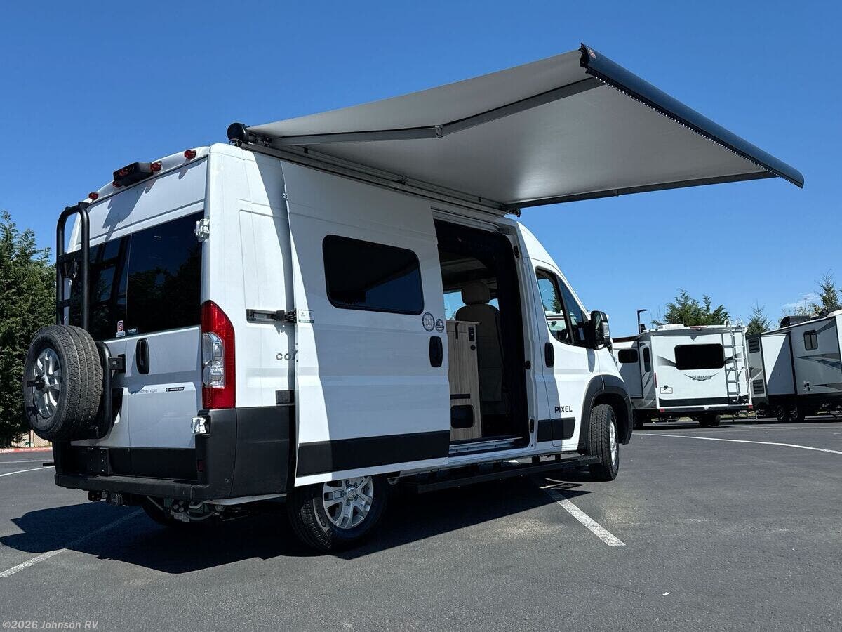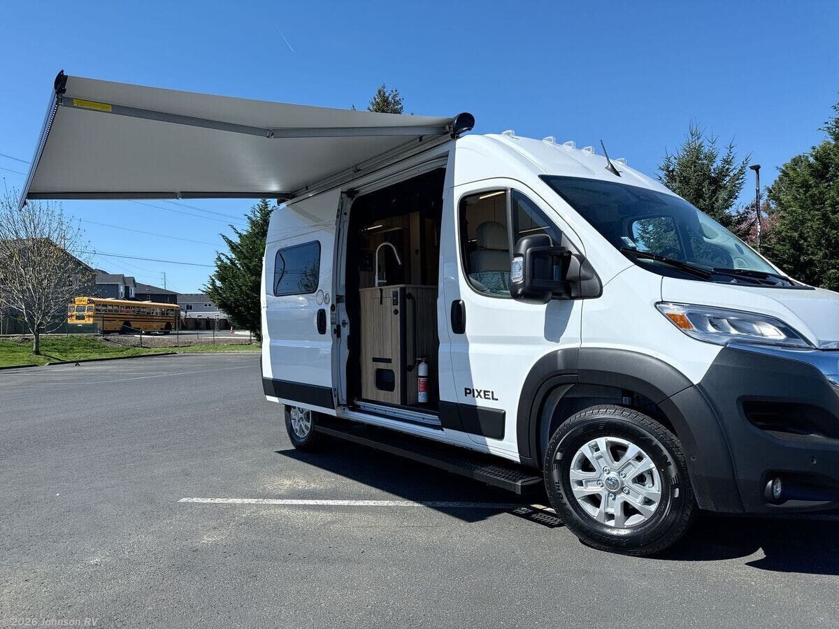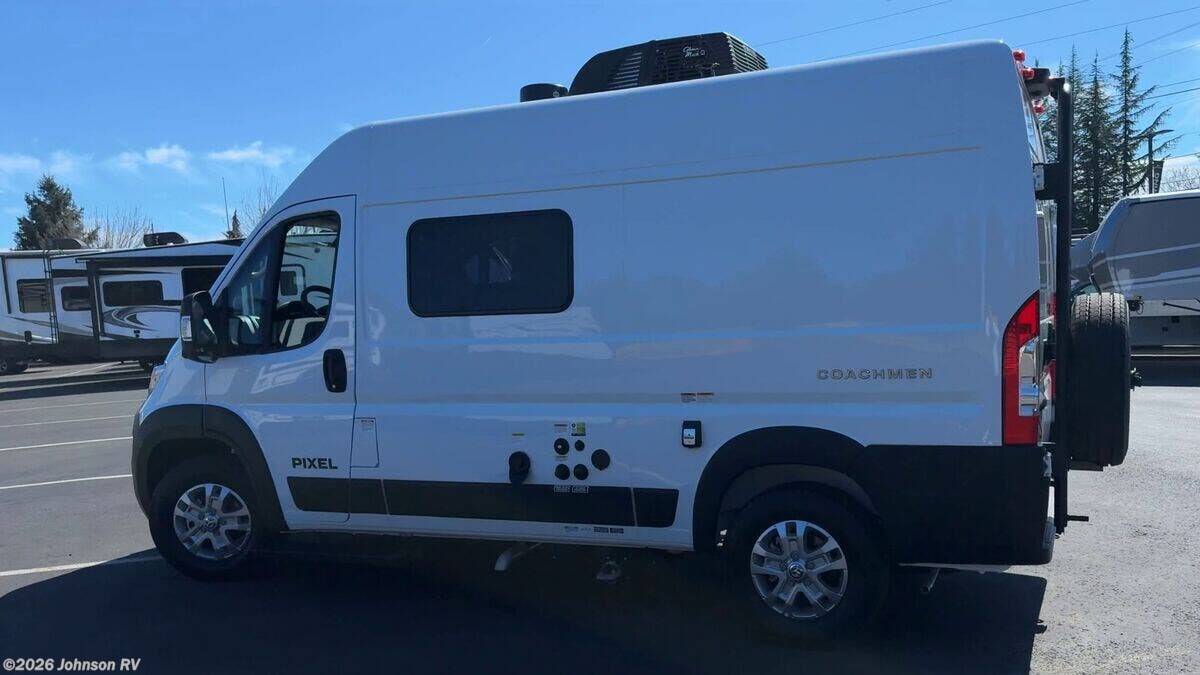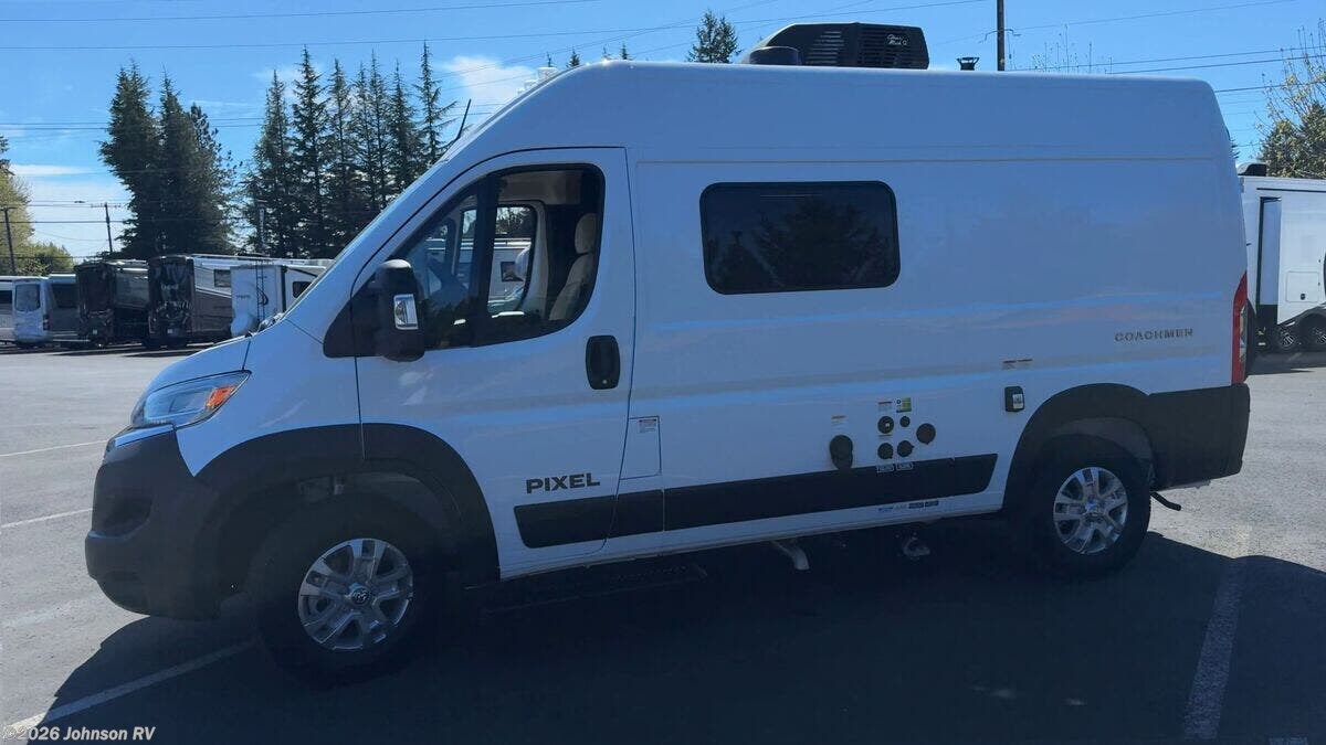 Introducing the 2026 Coachmen Pixel 1.8RB Class B RV – a versatile and modern vehicle designed to provide comfort and functionality on the road. Powered by a robust 3.6L Pentastar V6 Gas Engine, this RV delivers an impressive 280 horsepower and 260 lb-ft of torque, making it an ideal companion for both urban settings and rugged terrains. With only 20 miles on the odometer, this new RV promises years of reliable adventure. The Coachmen Pixel is built on the durable RAM Promaster 3500 Extended High Roof Van chassis, offering a spacious and stylish travel experience. Its exterior design options include White, Silver, and Ceramic Grey, allowing you to choose a look that matches your personal style. The 3500# hitch adds to the vehicle's functionality, ensuring you're ready for towing needs. Standard features of the Coachmen Pixel enhance both convenience and comfort: - **30 Amp Smart Plug** - **King Olympus Digital Antenna** - **WiFi Router and Cell Booster Prep** - **7.3 cu. ft. Refrigerator with Pull-Out Freezer Drawer** - **Air Fryer/Convection Microwave** - **Sumo Springs Front and Rear for Enhanced Ride Quality** - **Solid Hardwood High Pressure Laminate Cabinetry** - **Rockwool R-15 Insulation & Cozy Wrap Heat Shield Insulation** - **Hush Matt Sound Deadener for a Quiet Ride** - **Dual Pane Acrylic Awning Style Windows** - **Truma Aventa 13.5K A/C with Soft Start Feature** - **Truma Furnace/Hot Water Heater** - **Dual 115AH AGM Batteries** - **1,000W Pure Sine Invertor** - **200W Solar Panel (190W on Pop Tops)** - **One-Piece Fiberglass Shower with Heated Shower System** - **Cassette Toilet** - **Residential High-Rise Faucet with Pull-Out Sprayer and Large Square Sink** - **Induction Cooktop** - **Maxx Air Fan with Remote** - **LED Light Strips Throughout** - **4 L-Track Tie Down/Mounting System** - **Durable Coin Flooring** Optional features provide customization to enhance your travels, including upgraded Firestone Tires with Black Rims, Rover Exterior Ladder, and Pop Top with additional solar panels and AC. For those opting for the Li LITHIUM BATTERY SYSTEM, you gain a 640 amp-hour lithium battery with an internal heater, Bluetooth battery management system, and a second under-hood alternator, with advanced charging solutions ensuring your off-grid adventures are seamless. The vehicle also features a side screen door and a rear pull-down screen, making it perfect for enjoying the great outdoors. Whether you're hitting the highway or setting up camp, the 2026 Coachmen Pixel is designed to make every journey memorable. ???