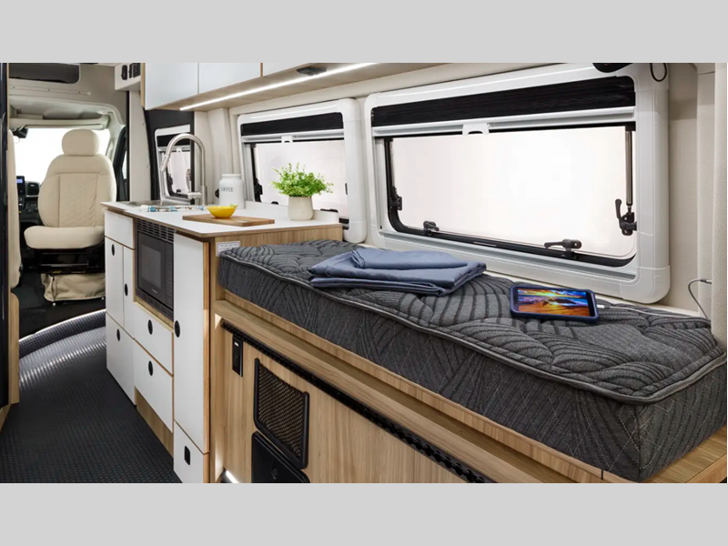 With any Pixel Class B gas motorhome by Coachmen RV, you will enjoy user friendly features, a stylish interior, and durable construction materials! The front and rear Sumo springs will help provide a smooth drive, and there is Rockwool R15 insulation plus a hush matt sound deadener to help reduce noise. An RVQG 2800i 2.8kW gas quiet generator and dual 115AH AGM batteries will keep you going, and you can choose the optional Li Lithium Battery System if you're needing more power. Inside, there is a large square sink, LED light strips throughout, solid hardwood cabinets, and a heated shower to name a few comforts.