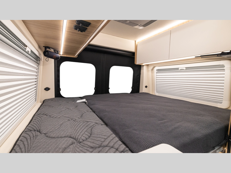 At night, the 56" x 74" Murphy bed transforms the interior into a comfortable sleeping space without permanently sacrificing daytime living area. For additional sleeping capacity, an optional pop-top is available. When equipped with the pop-top, the standard Truma A/C is replaced with a Coleman Mach 10 A/C system for optimal climate control.