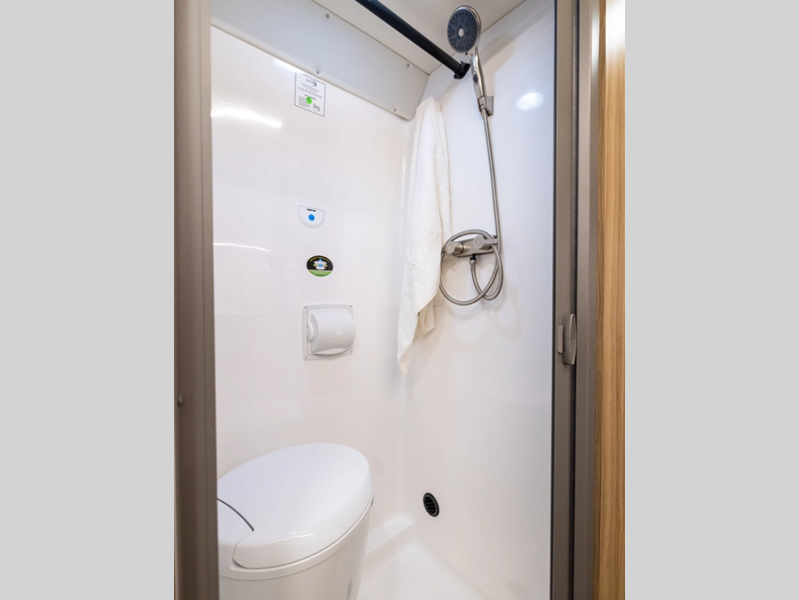 The compact wet bath with cassette toilet allows you to freshen up anywhere your travels take you. Up front, the two swivel captain’s chairs combine with additional cab seating and a removable table to create a comfortable dining or workspace area.