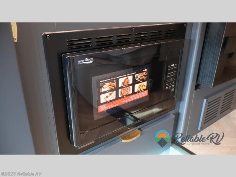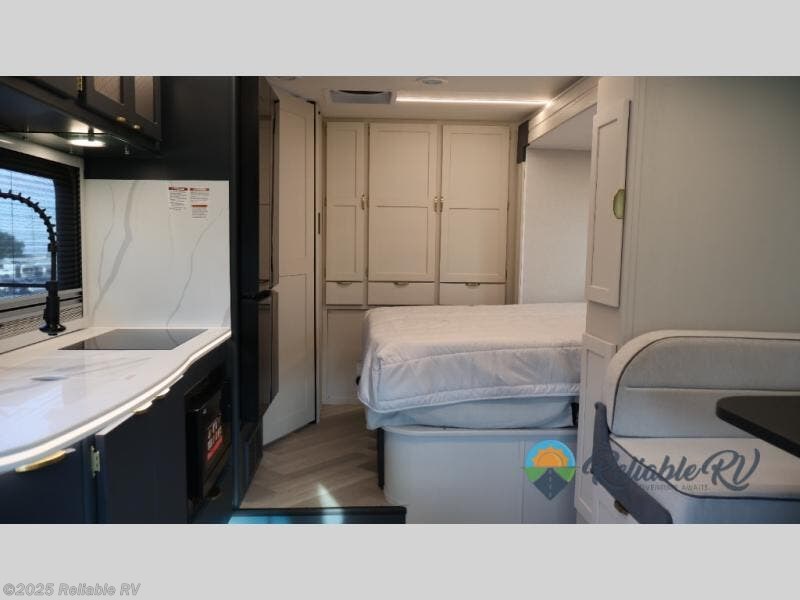 After enjoying the ride, you will love the destination while you relax inside at the booth dinette or choose the optional recliners in this coach. The front 36" x 76" cab over bunk provides sleeping or storage space, and the full galley kitchen allows you to make warm meals and store leftovers. You will also have overhead cabinets to stow away your dishes and dry goods. There is an RV queen bed, a nightstand, and a large back wall wardrobe and linen storage, plus a full bathroom in the rear corner of this coach to be able to sleep comfortably and get refreshed each day wherever you are.