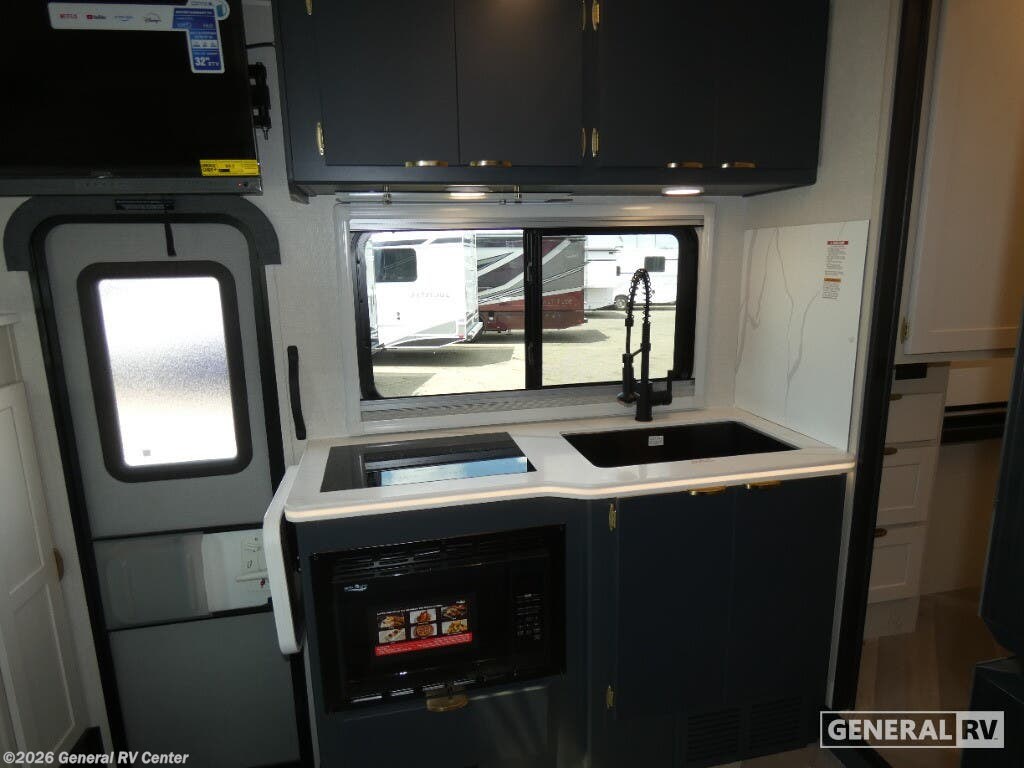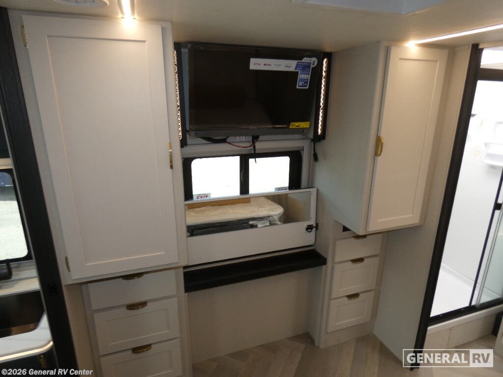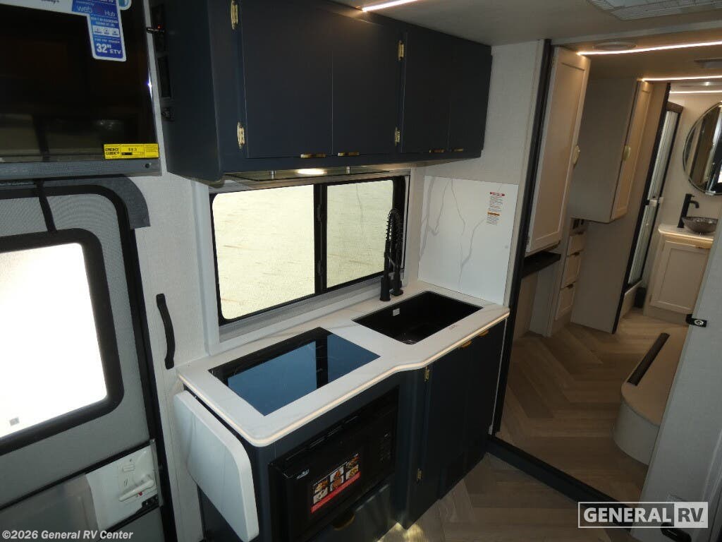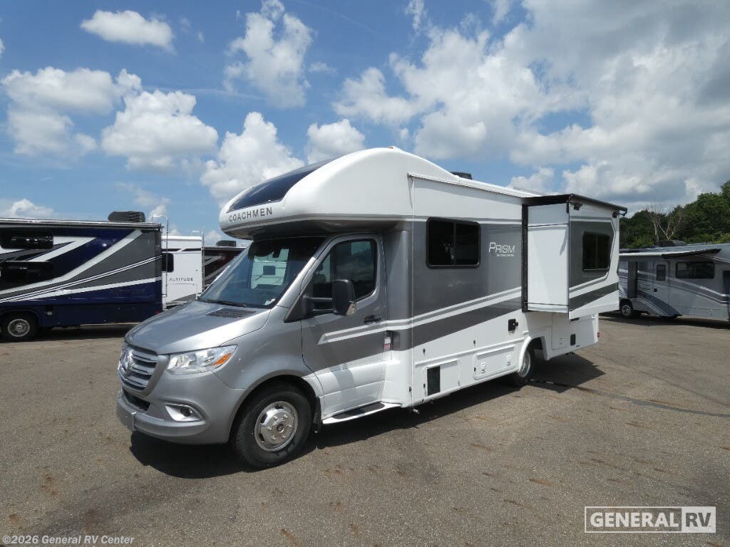 Coachmen Prism Elite Class C diesel motorhome 26RBE highlights: Full Rear Bath Workstation Bunk Over Cab Overhead Cabinets You'll love traveling in this luxury coach with friends or family. Once you stop for the day, you can make dinner on the two-burner cooktop, grab a cold drink from the refrigerator, and relax on the incliners. The master bedroom includes an RV queen bed slide out, dual wardrobes, and a workstation if you need to get some work done. And don't overlook the full rear bath, complete with a 24" x 36" shower, toilet, sink, and linen closet for clean towels. With any of the Prism Elite Class C diesel motorhomes, the Coachmen legacy of upscale luxury with Mercedes-Benz drivability is found throughout. With the aerodynamic and stylish rear fiberglass cap and integrated fiberglass running boards, plus you are sure to turn heads as you travel to your destination. There are also upgraded MorRyde cargo doors outside, along with an armless awning to enjoy some shade. The interior provides solid surface countertops with lit edge banding, a soft touch ceiling and Curio glass in the overhead kitchen cabinets. A Truma Aqua Go on-demand water heater will provide endless hot showers, and the 15K BTU low profile A/C will keep you cool all summer long. Choose a reliable and luxurious Prism Elite today!