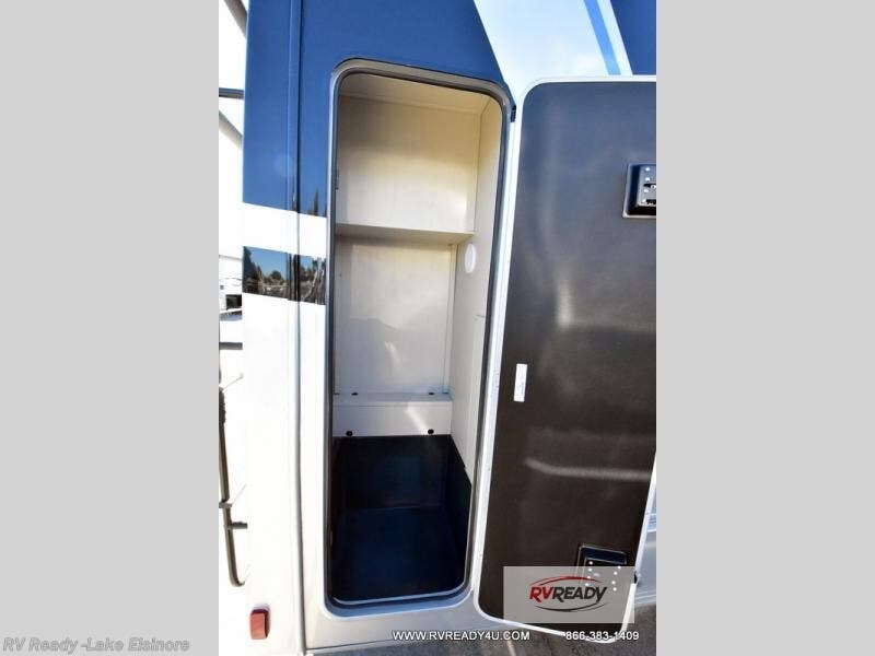 You will enjoy the versatility that this Murphy bed model provides. Depending on whether it is daytime or evening will determine if you have a 60" x 74" Murphy bed that slides out or a 62" sofa to enjoy. There is a 45" x 76" bunk over cab that can be used for added sleeping for two more guests, or to be used as added storage space. The rear full bath is spacious and private and includes a 35" x 35" angled shower, toilet, vanity with sink, plus linen cabinet, and wardrobe. The kitchen features everything needed to create meals while on the go, and a cozy fireplace is included beneath the coach TV for your enjoyment.