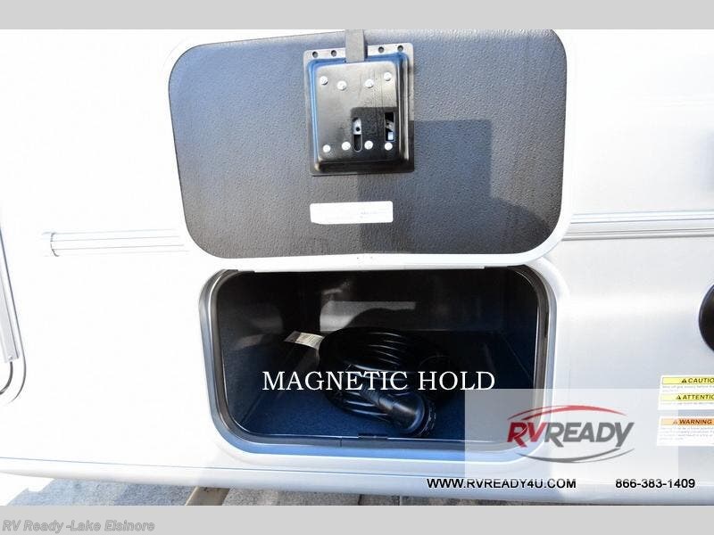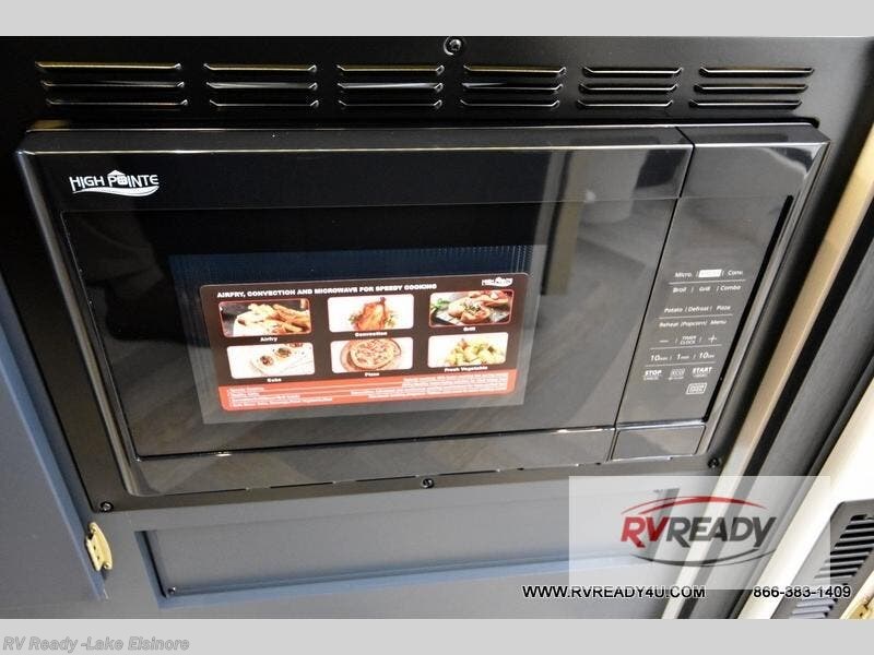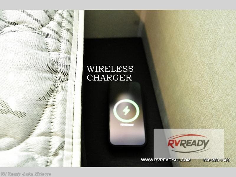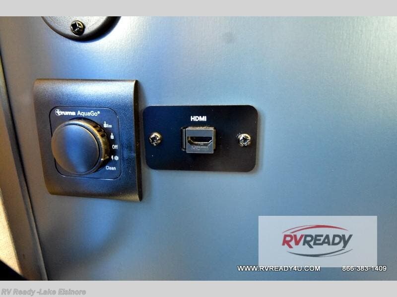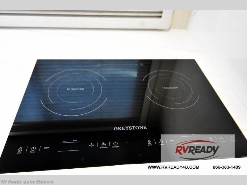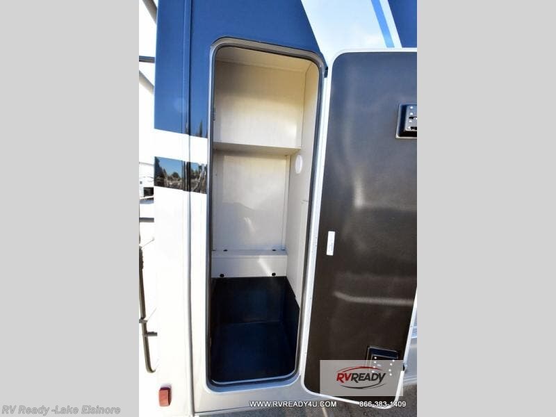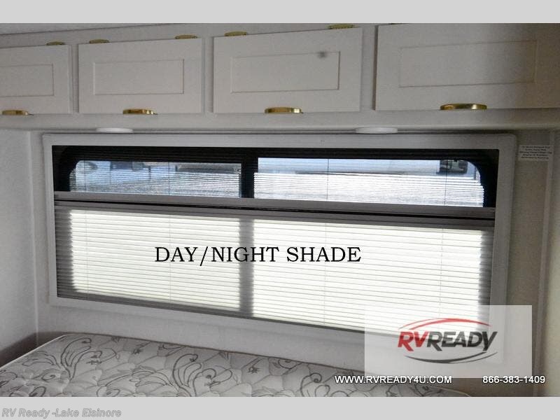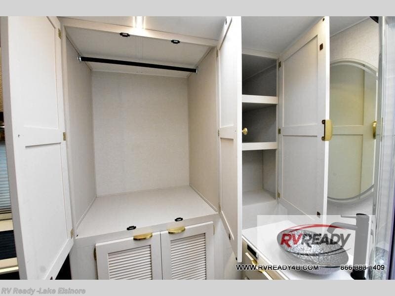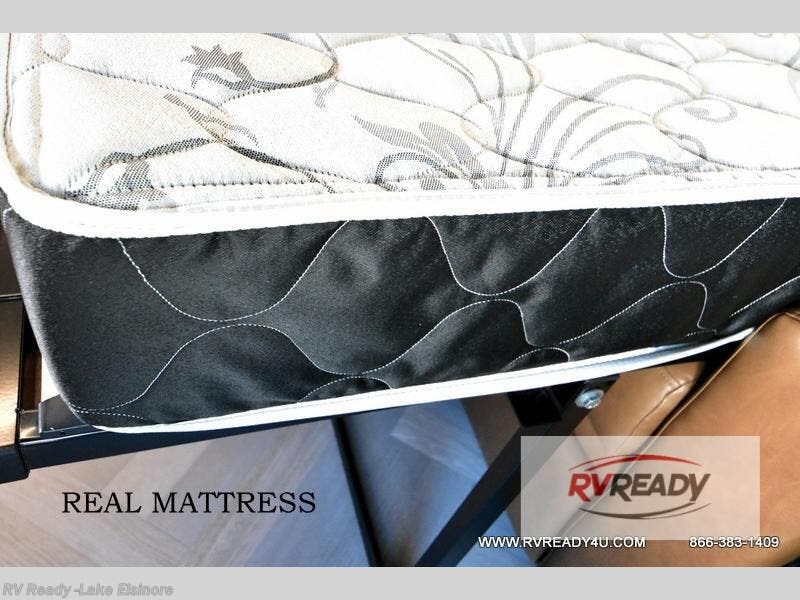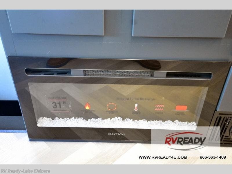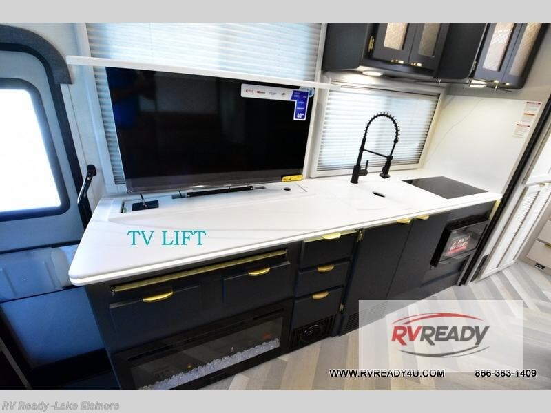 You will enjoy the versatility that this Murphy bed model provides. Depending on whether it is daytime or evening will determine if you have a 60" x 74" Murphy bed that slides out or a 62" sofa to enjoy. There is a 45" x 76" bunk over cab that can be used for added sleeping for two more guests, or to be used as added storage space. The rear full bath is spacious and private and includes a 35" x 35" angled shower, toilet, vanity with sink, plus linen cabinet, and wardrobe. The kitchen features everything needed to create meals while on the go, and a cozy fireplace is included beneath the coach TV for your enjoyment.